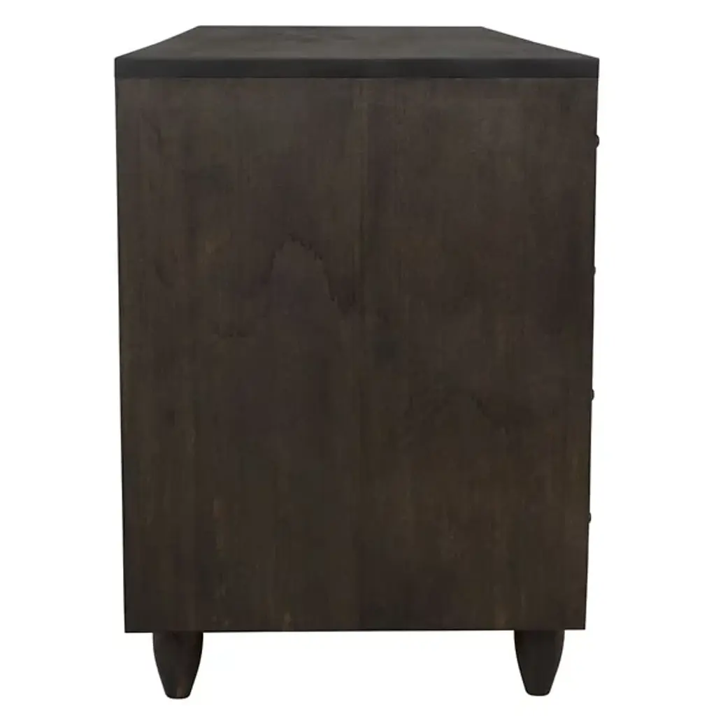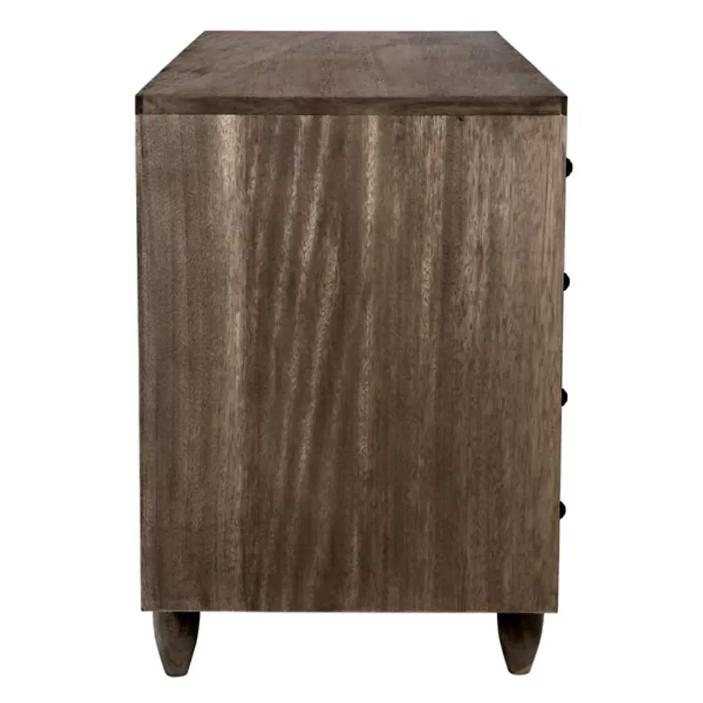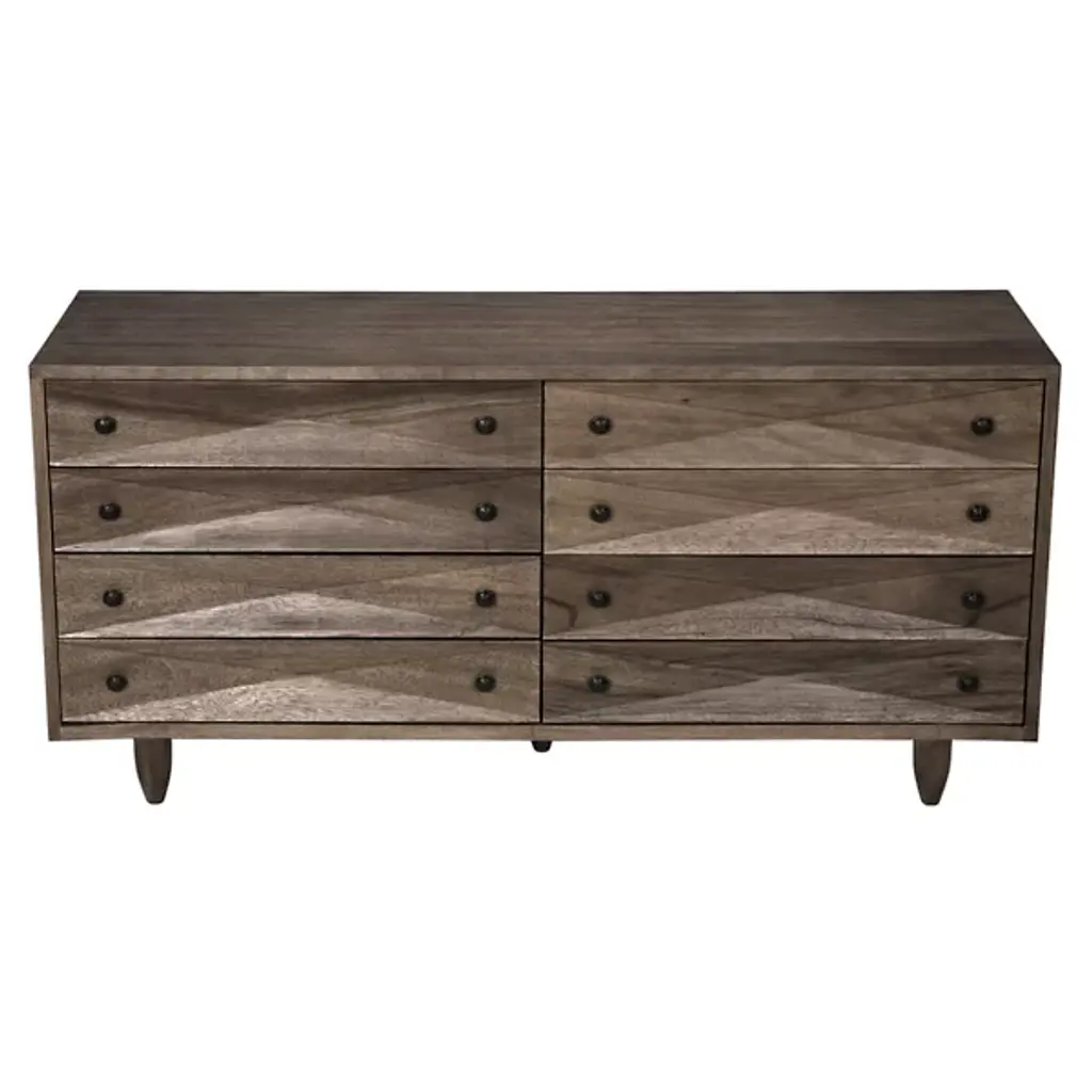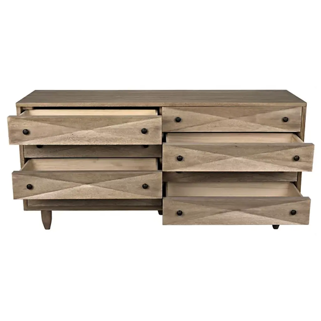 The Diamond Double Chest Dressers from Noir elevate simple storage into textural sculpture through bold diamond-shaped carvings that flow across each of the eight drawer fronts. Every carved element catches light differently, creating dynamic surface play while maintaining geometric order across the walnut composition. The rich finish intensifies each carved valley and ridge, while black metal pulls provide functional accents without competing with the carved details. Simple tapered legs elevate the substantial case, proving that a repetitive pattern can achieve maximum visual impact through skilled handwork.