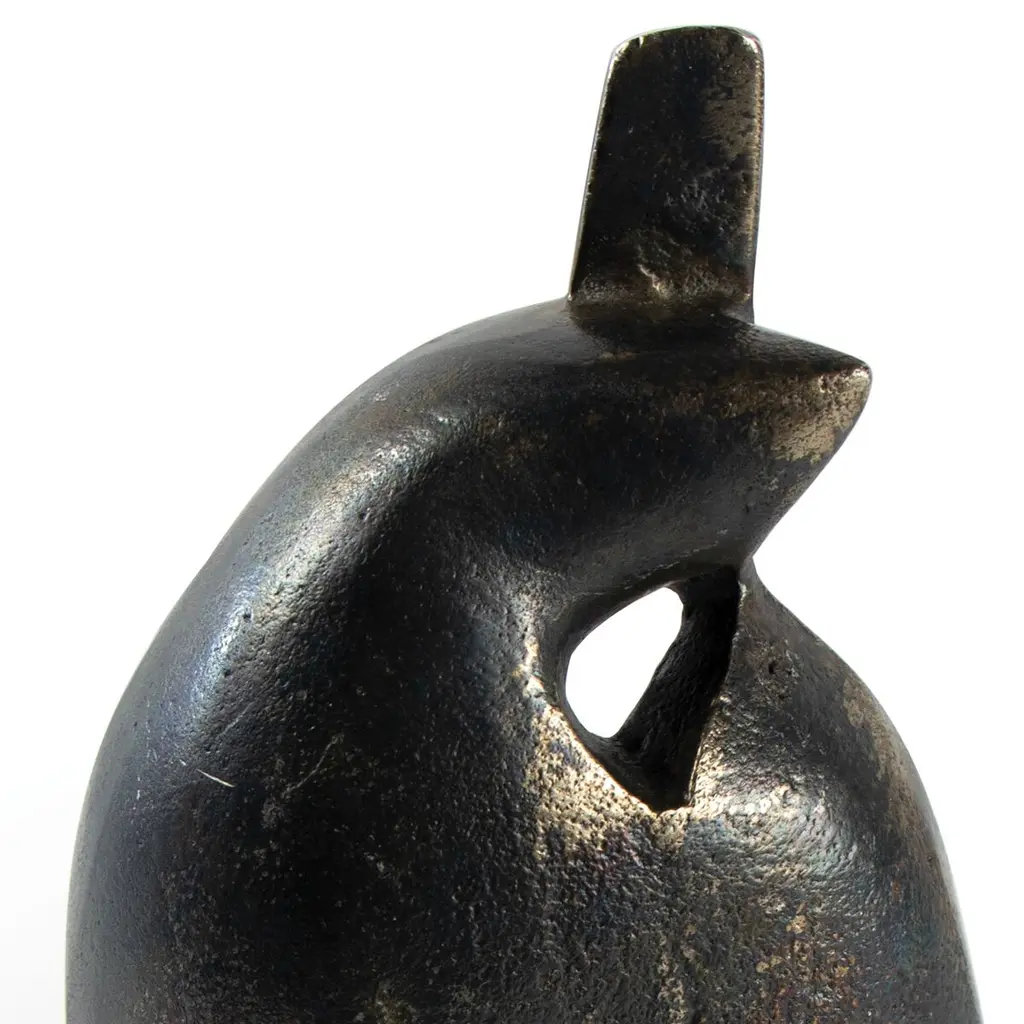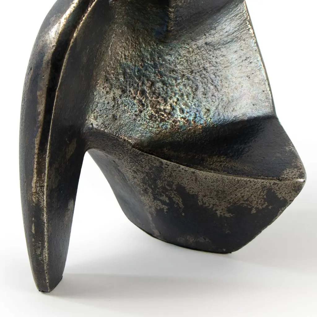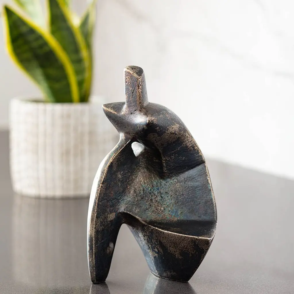 The blackened finish of this tabletop sculpture accentuates the tactile surface as well as the intriguing curves and planes. Reminiscent of an ancient artifact, it makes an eye-catching addition to a shelf, mantel, or tabletop.