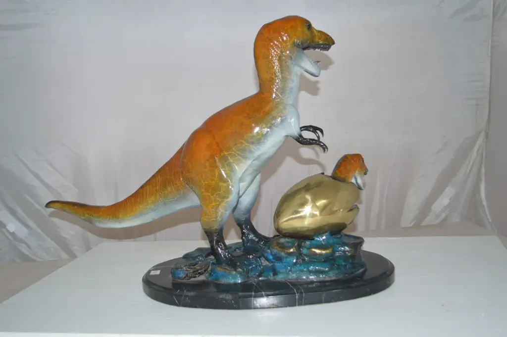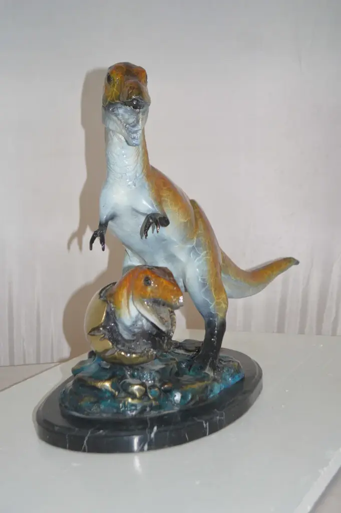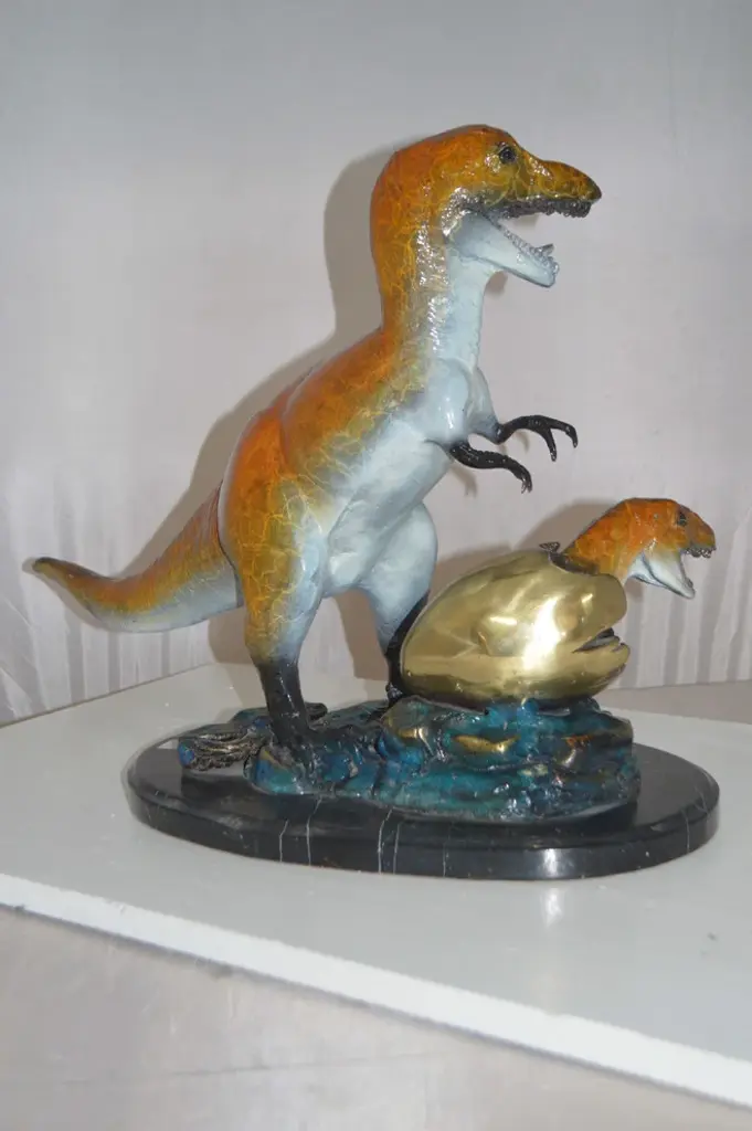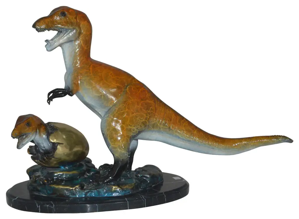 In 1993, Universal Studios, together with Steven Spielberg and Stan Winston Studios, changed movie history forever with Jurassic Park. The mixture of fully engineered forty-foot dinosaur puppets with live-action actors and new computer-generated imagery allows Jurassic Park to stand tall over the test of time. This bronze sculpture replica of a Tyrannosaurus Rex and her brand new baby, was cast using the lost Wax Method. This beautiful bronze statue will be a valuable addition to any area of the home, office, patio, or garden. Size: 26"L x 11"W x 18"H. Weight is: 36Lb
