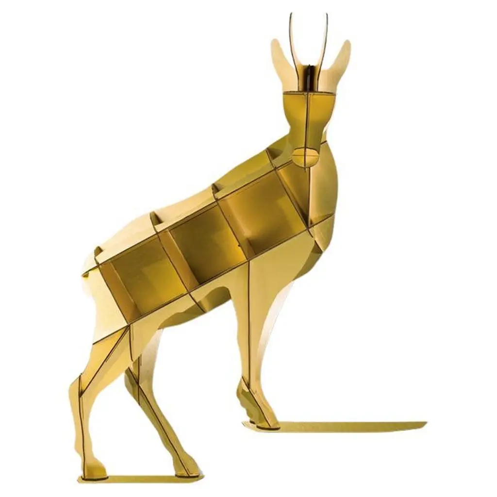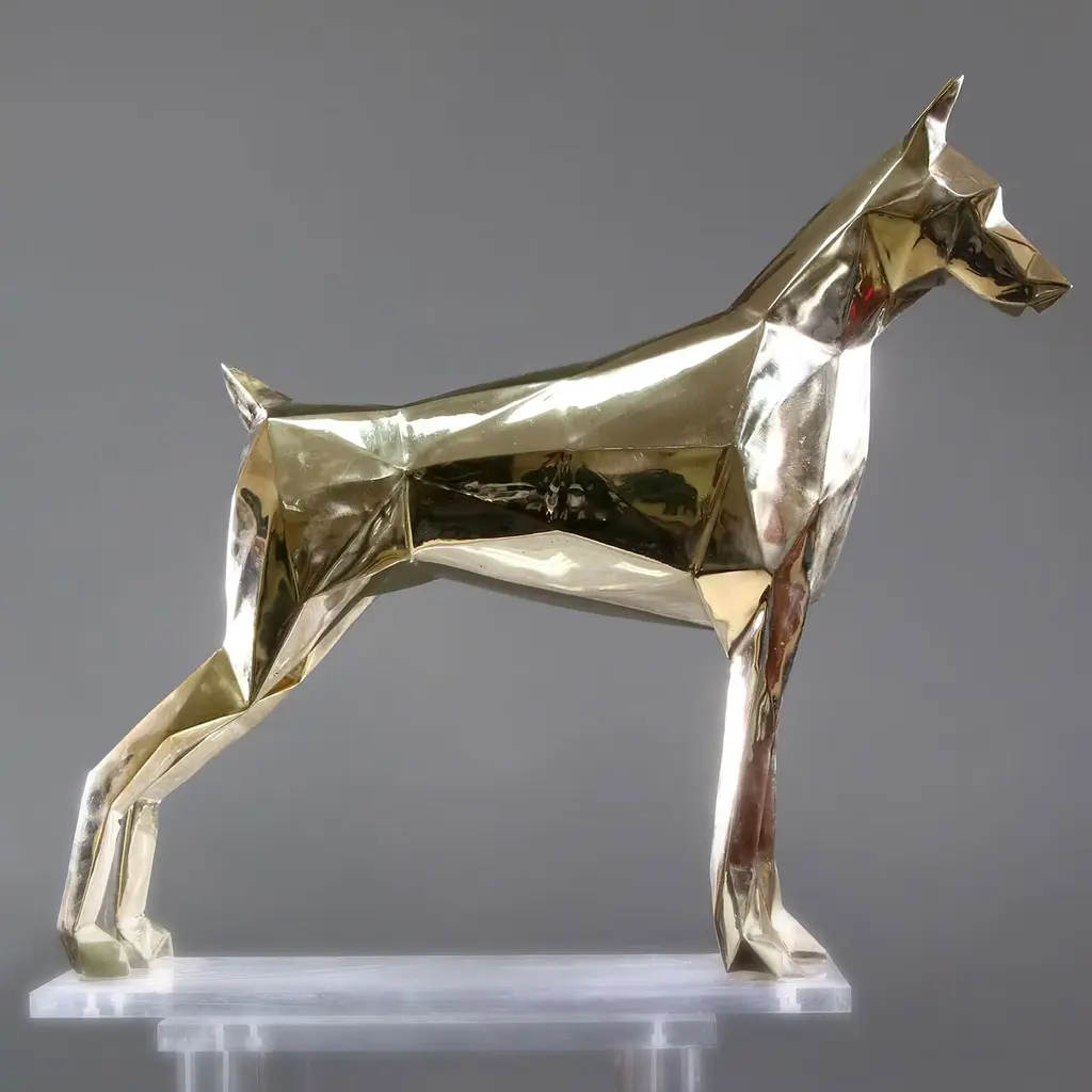 This singular bronze sculpture, recreating a Doberman dog following the ancient lost-wax casting technique, is marked by an intriguing multi-faceted texture. The intricate faceting accentuates the lean, muscular silhouette, capturing the light at all angles. Offered in a refined brushed finish, it is a daring addition to contemporary decors.