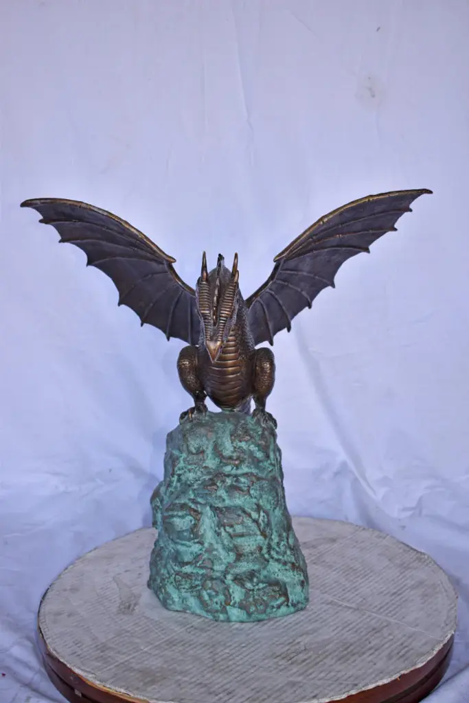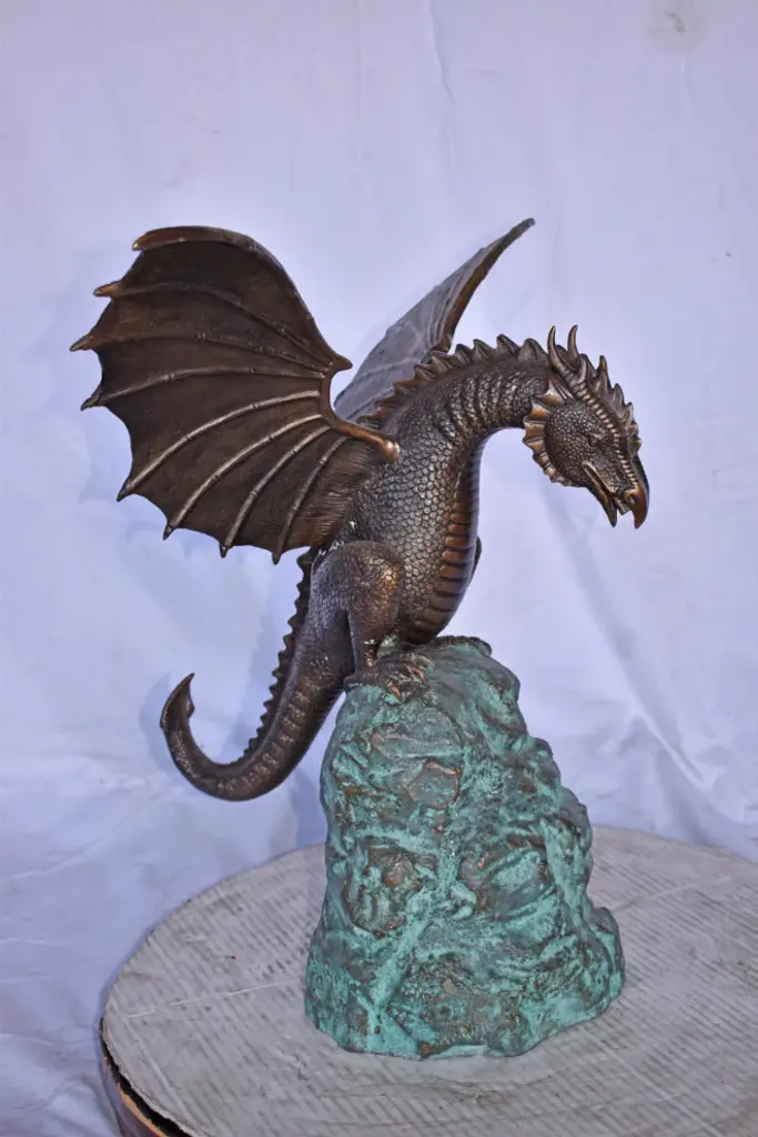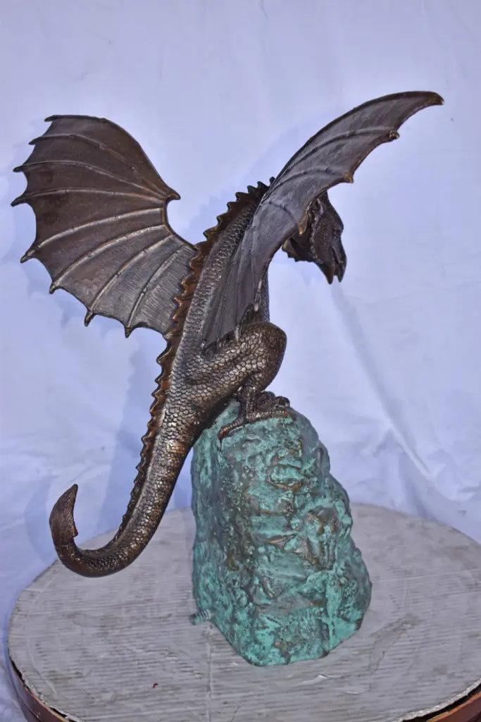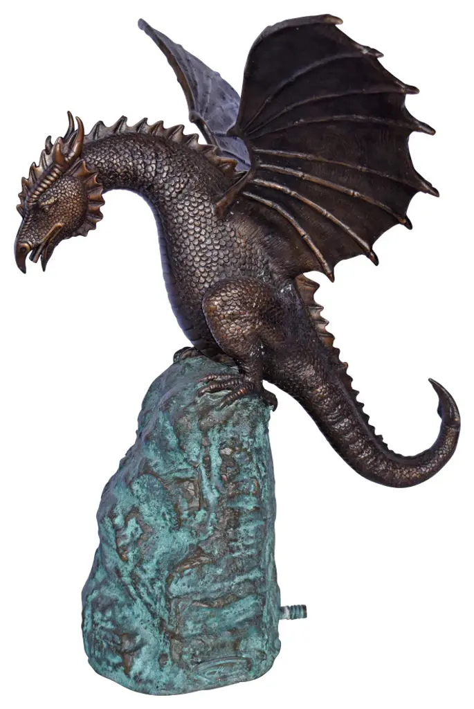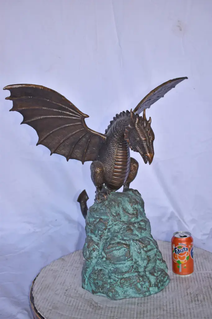Surprise your garden guests with this life size outdoor Bronze fountain Statue of a Dragon Standing on a Rock Bronze Statue Fountain. The dragon is equipped with a hose that sprays water out of his mouth, with the use of a fountain pump (pump is not included). Produced using superior quality bronze and a traditional casting method that yields pristine details. The patina chosen for this Timeless Creation is stained in green and brown patina finish. This impressive Bronze Statue will be a permanent fixture on the grounds of your estate for years to come. Size: 23"L x 18"W x 23"H. Weight is: 24Lb