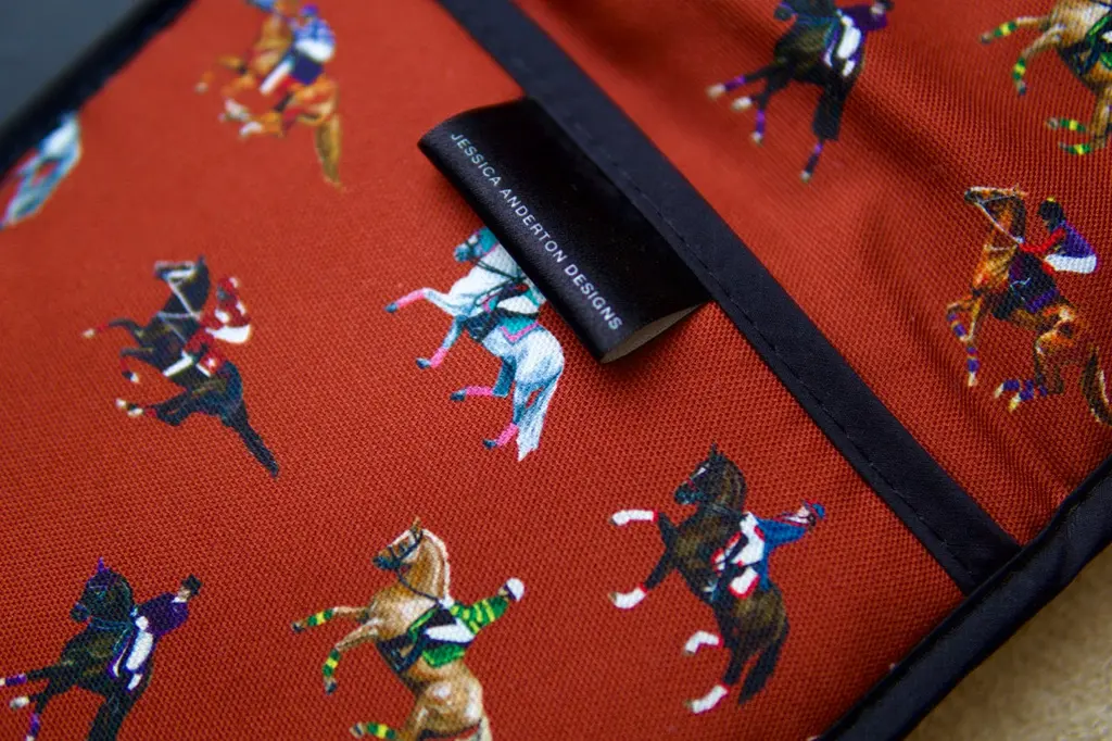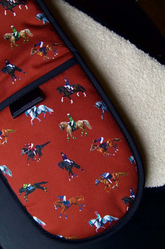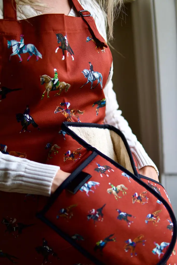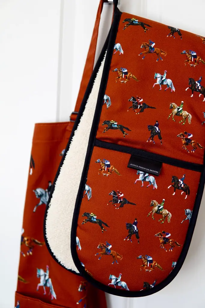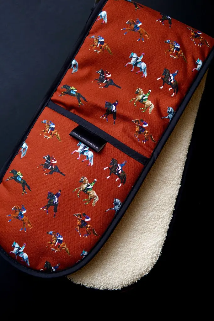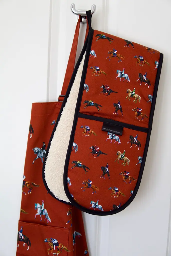 A must-have for any passionate home cook or horse lover! These oven gloves are not only functional but also make a stylish statement when bringing your culinary creations to the table. Handcrafted in the UK using a heavier weighted 1/2 panama cotton, these double oven gloves are designed to withstand the rigours of daily use while providing superior heat protection.Professionally hand-stitched by our trusted British supplier, this accessory is printed using reactive inks, which results in a clear and vibrant colouring without any fading for years to come.Whether you're an avid chef, a horse enthusiast, or searching for the perfect gift for a loved one, the new 'Dressage & Racehorses' Double Oven Gloves are an ideal choice.