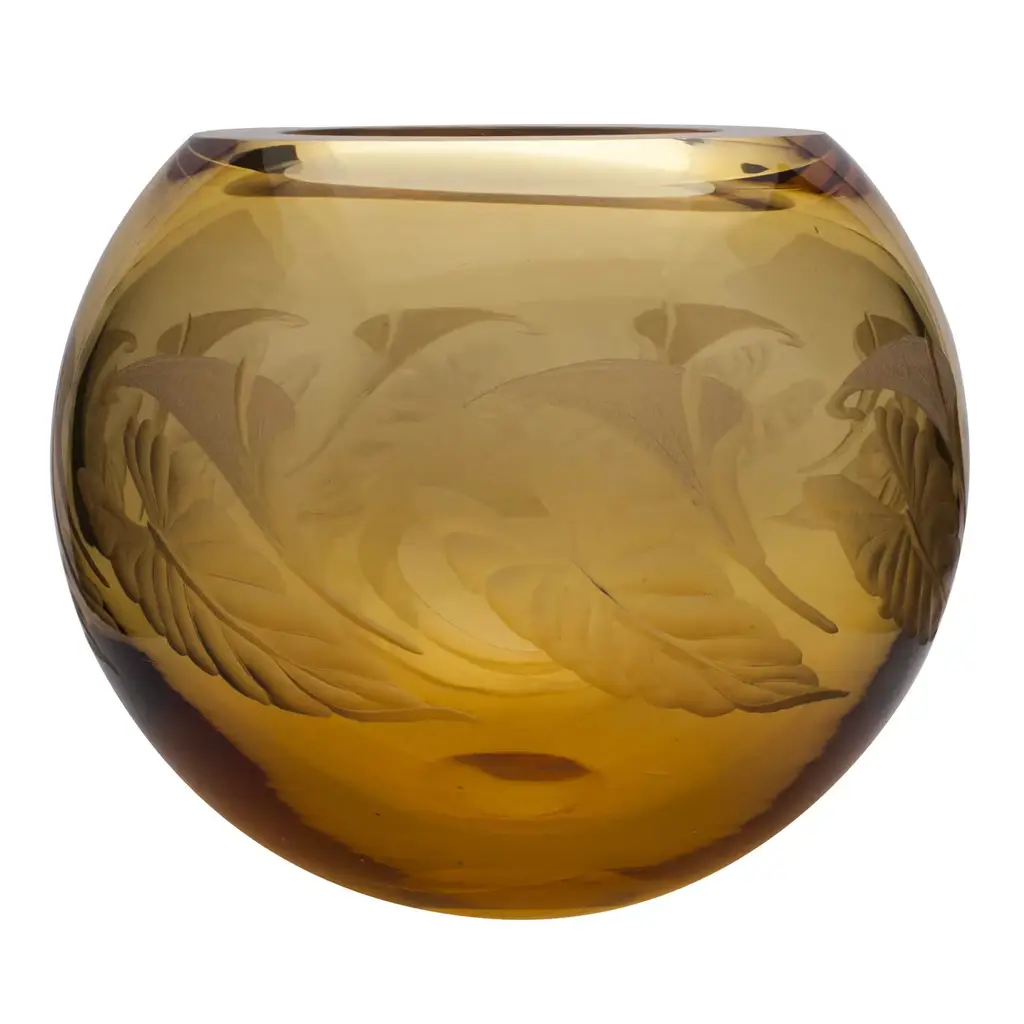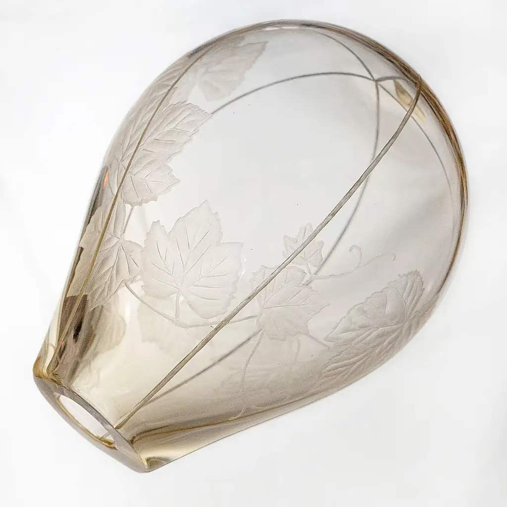 Champagne-colored blown crystal sculpture hand-engraved by a stone wheel. Decorated with a naturalistic subject of leaves and vertical lines that are embellished by the hand application of gold providing a glimpse of the past.