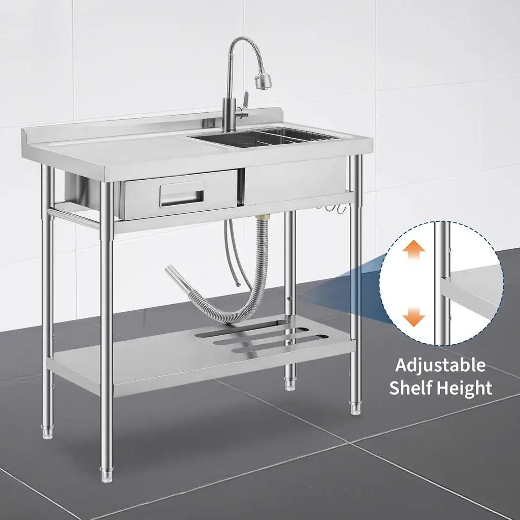 【Heavy-Duty Stainless Steel Construction】 Crafted with a robust 201 stainless steel frame and a 1.0mm thick 304 sink bowl, this freestanding stainless steel utility sink resists rust and corrosion. Ideal for busy commercial kitchens, restaurants, and outdoor environments. 【Smart Workbench & Storage Features】 Equipped with a spacious right-side workbench, pull-out drawer, and integrated knife holder, this utility sink with storage also includes 5 S-hooks, a dish rack, and a hanging basket—perfect for maximizing prep efficiency. 【Extra-Large Basin with Workbench Design】 The deep basin includes a workbench -style bottom for scrubbing laundry, washing pots, or food prep. A 2" backsplash and efficient drain system with a removable filter make this a great laundry or garden sink solution. 【360° Hot & Cold Faucet for Versatile Cleaning】 This utility sink with faucet includes a 360° pull-out nozzle for flexible use. Control hot and cold water with ease—whether you're using it in the garage, restaurant, or outdoor cooking area. 【Height Adjustable Legs & Non-Slip Feet】 Designed with adjustable stainless steel legs and anti-slip feet, this freestanding sink stays level on any surface. Great for laundry rooms, garages, gardens, and tight commercial spaces.