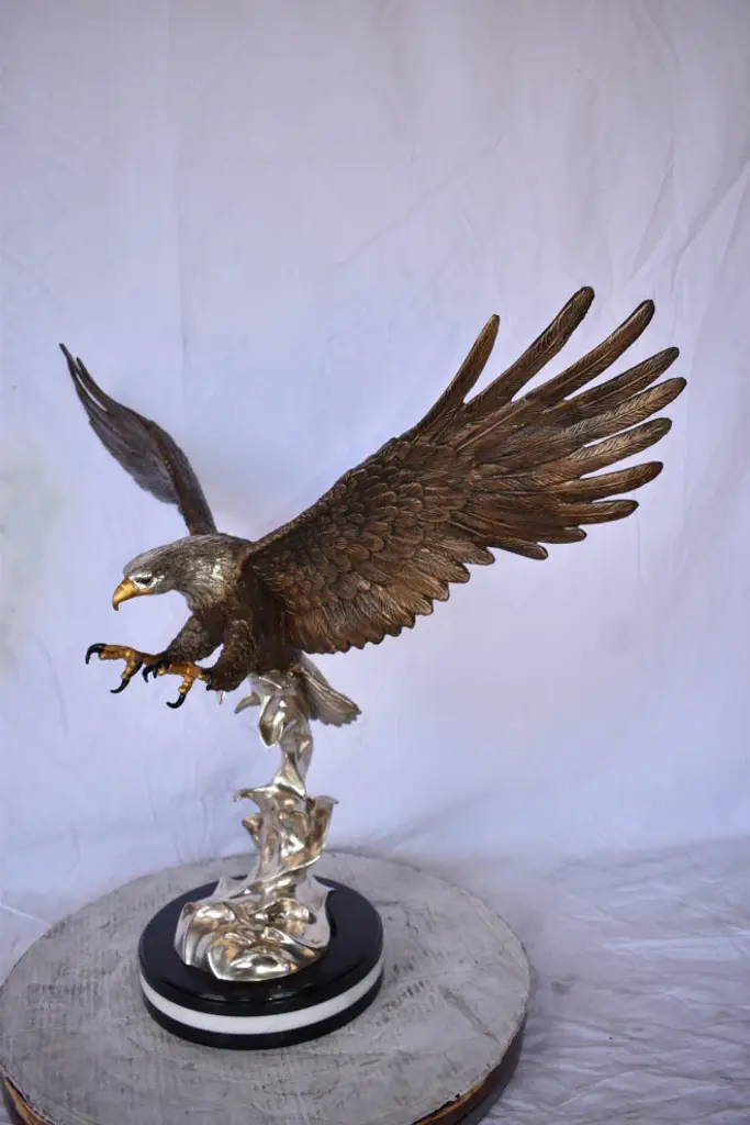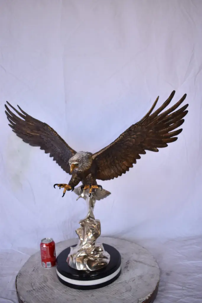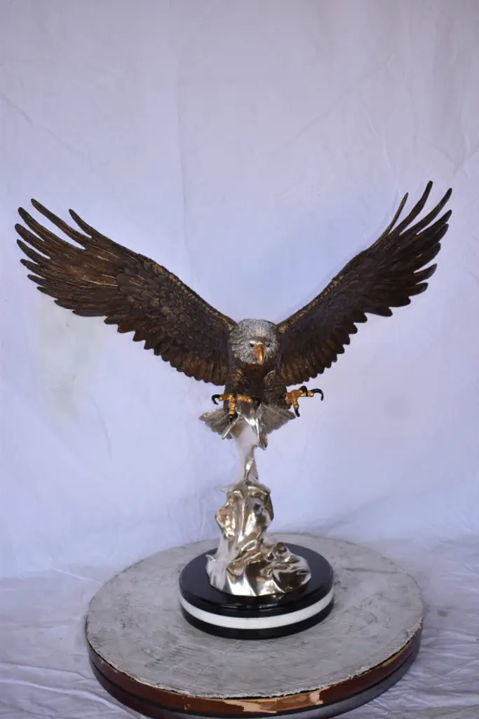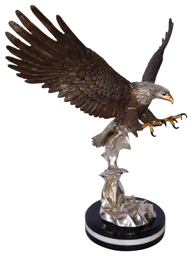 Purchase this beautiful bronze statue to make a bold statement in any room of your choosing. The soaring eagle is a symbol of confidence and pride, soaring above the rest in this statue, produced using lost wax method with a mix of hand finishing with different tones of brown and silver patina. Sitting on a sturdy marble base, this piece does not lack any detail (item may come with single or triple marble). Size: 32"L x 13"W x 30"H. Weight is: 46Lb