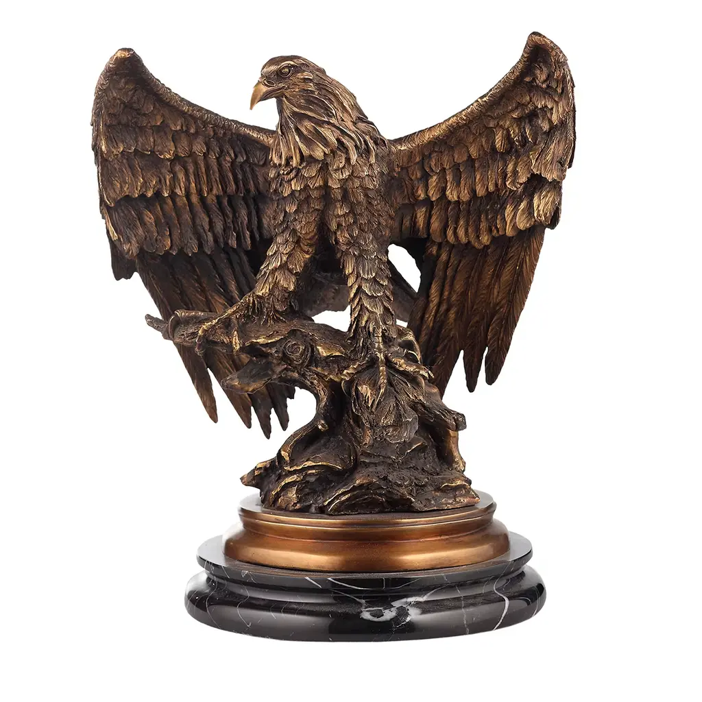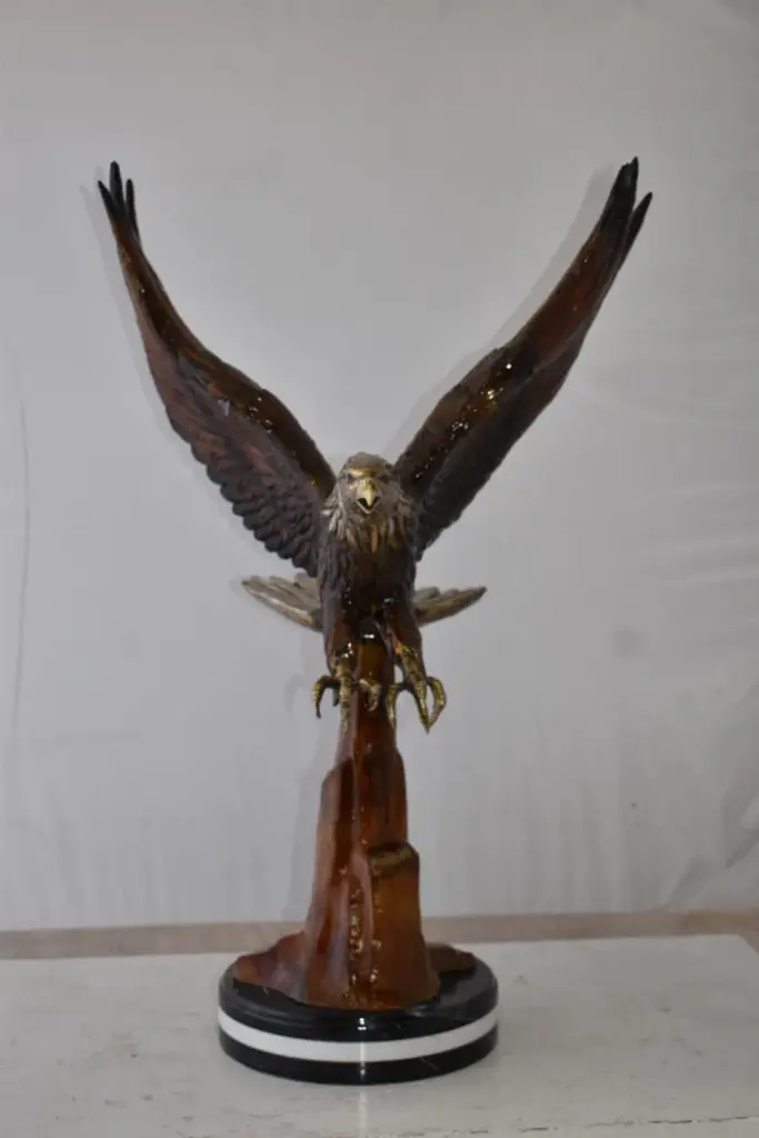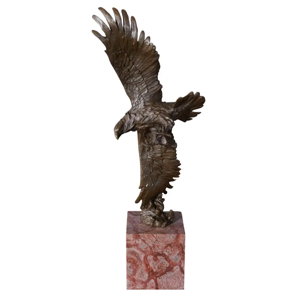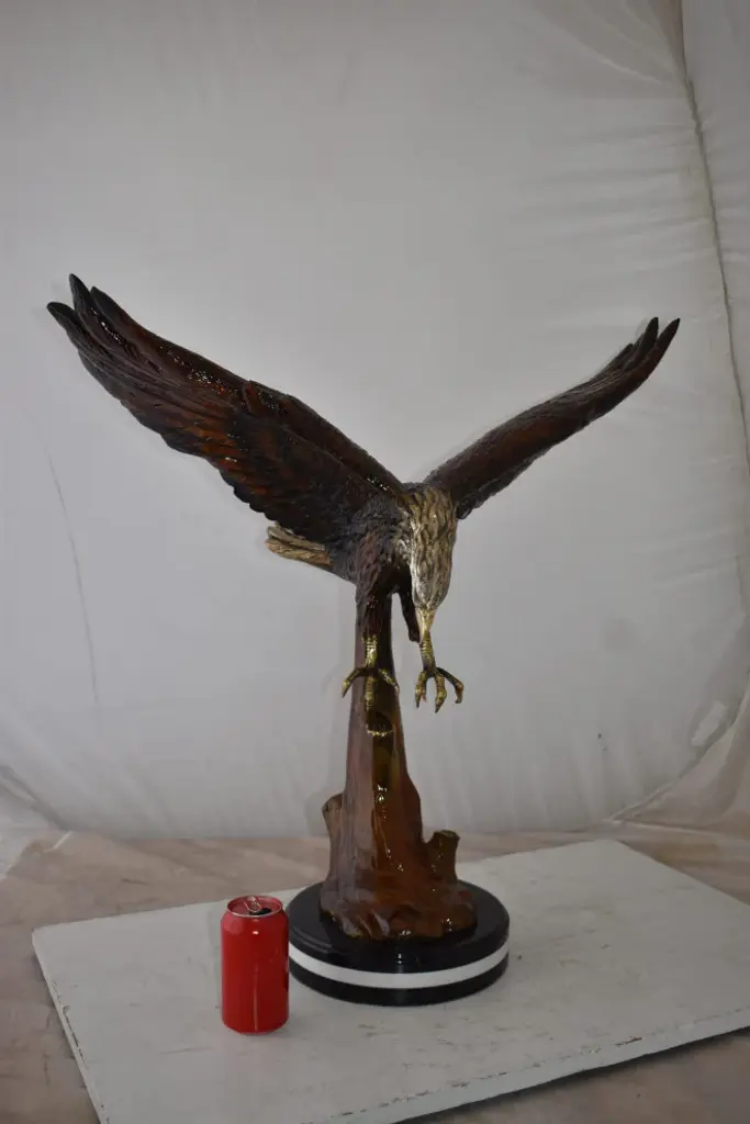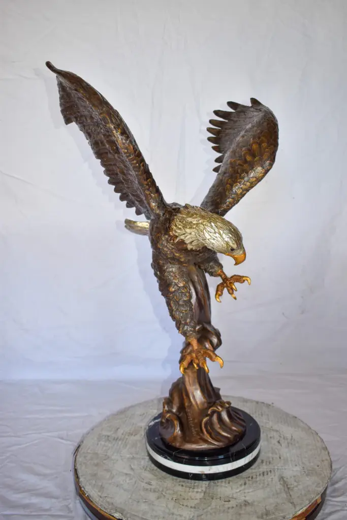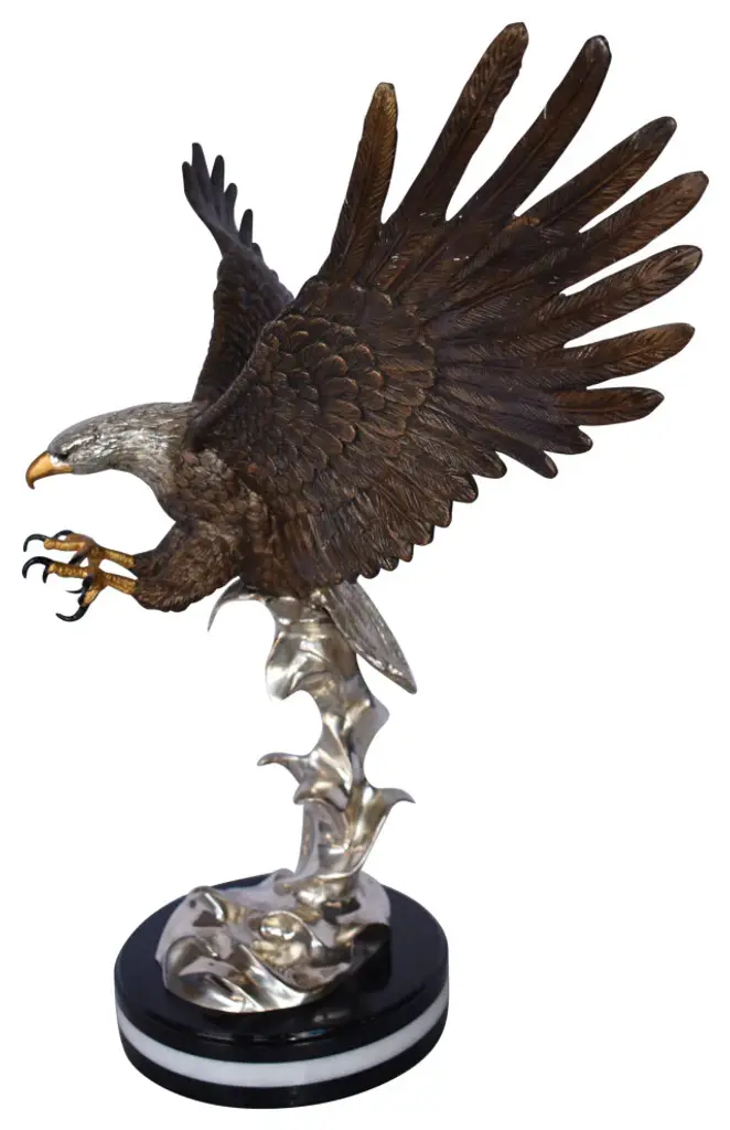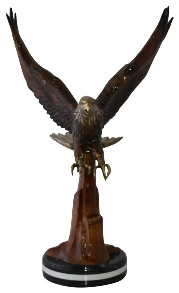 This charming bronze statue depicts the American bald eagle. The eagle head captures the essence of the majestic bird of prey. The eagles very large beak is used for tearing flesh from their prey. The extremely keen eyesight of the eagle stares out spotting a potential prey from a very long distance. This is a true example of a museum quality hand-casted bronze using the Lost Wax Process. Perfect for any art, animal or nature enthusiast. Size: 29"L x 17"W x 28"H. Weight is: 42Lb
