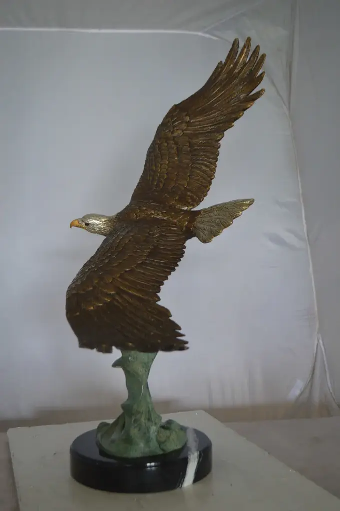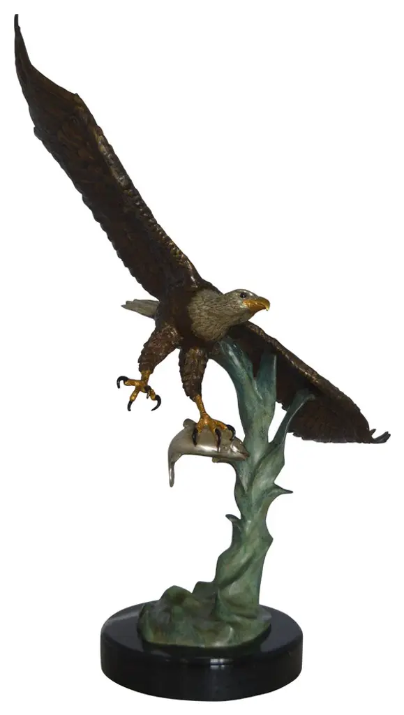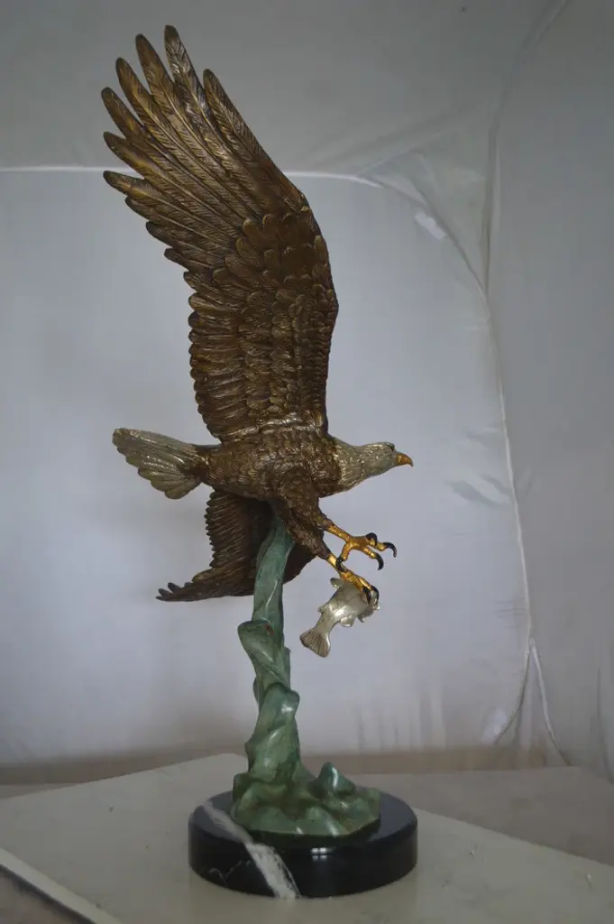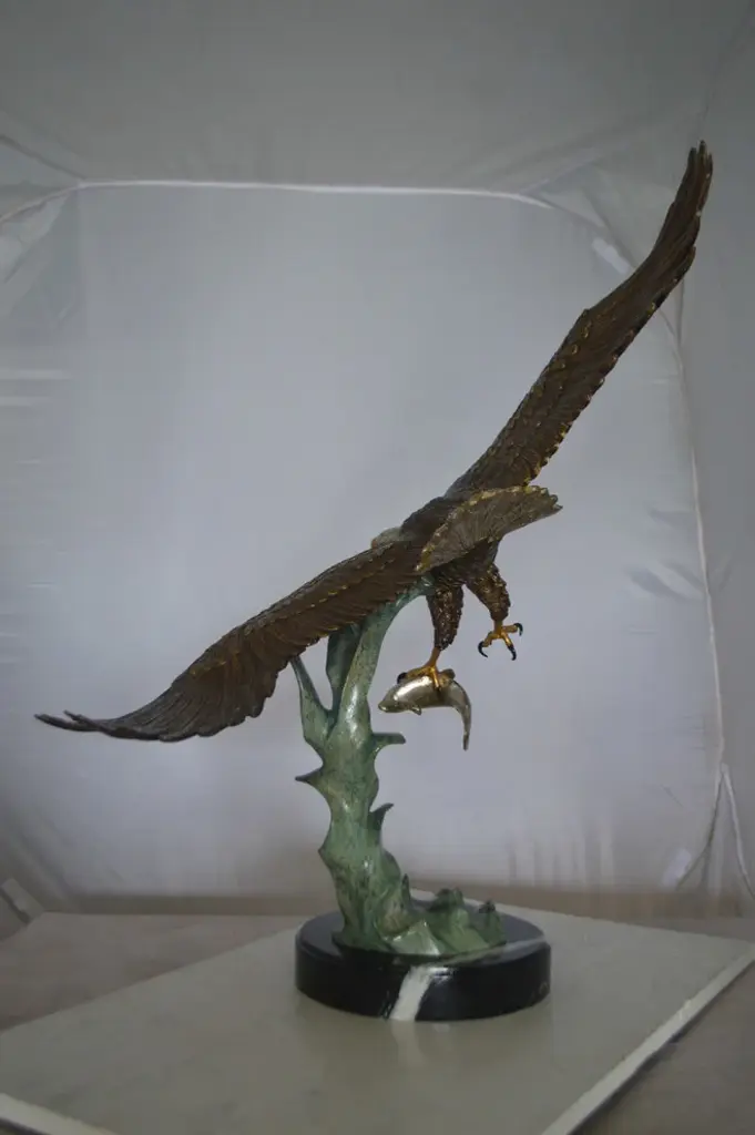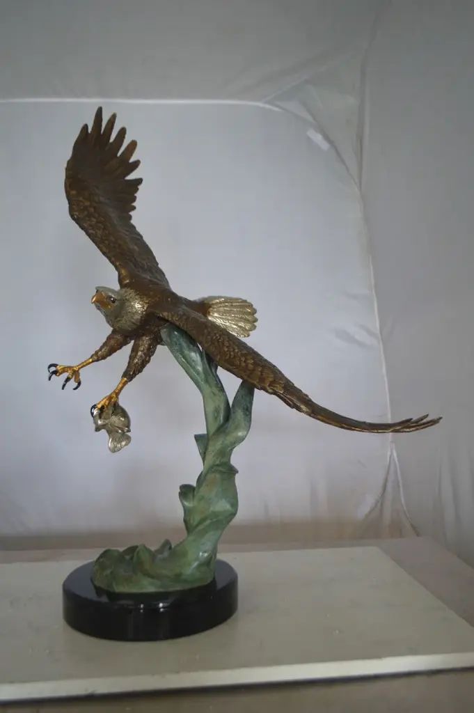 A large eagle made of bronze flying of the water right after catching his prey. The eagle is shown with marvelous detail to the feathers, beaks and eyes each with a unique expression and pose. This very fine and unique abstract was casted using the ancient old Lost Wax Method with brown patina finish for preservation. The patina chosen for this Timeless Creation is a mix of hand finishing with different colors and Polychrome techniques also referred to as enameling over bronze. This impressive Bronze Statue will be a permanent fixture on the grounds of your estate for years to come. Size: 32"L x 15"W x 33"H. Weight is: 43Lb