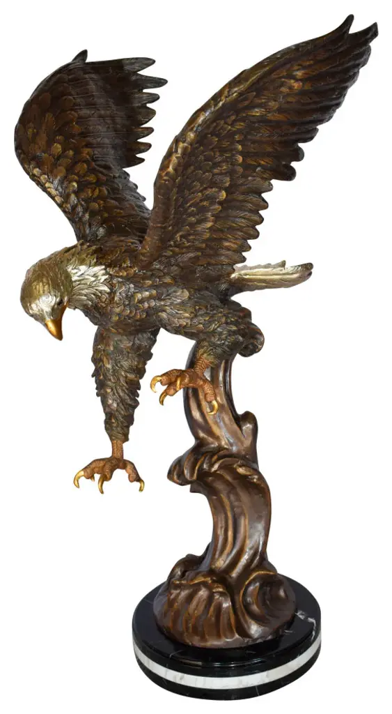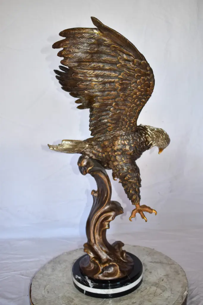 This charming bronze statue depicts the American bald eagle. The eagle head captures the essence of the majestic bird searching for prey. The eagles very large beak used for tearing flesh from their prey. The extremely keen eyesight of the eagle stares out spotting a potential prey from a very long distance. This is a true example of a museum quality hand-casted bronze using the Lost Wax Process. Perfect for any art, animal or nature enthusiast. Size: 21"L x 18"W x 35"H. Weight is: 58Lb