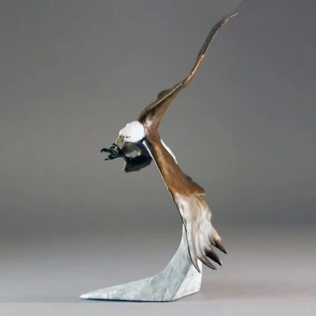Renowned sculptor Eli Hopkins'' Above The Clouds Eagle Sculpture sets the spirit to soar with its contemporary image of the majestic bird of prey in flight. Fine detail is captured in classic bronze, and finished using a unique hot patina to mix lifelike colors with subtle and timeless hues from the metal itself. Only 100 pieces will be produced in this magnificent and patriotic vision, making it a very special gift for your favorite American nature lover. Also available in a smaller version. Internationally renowned American artist Mark Hopkins creates bronze sculptures that have thrilled collectors and casual art fans alike for more than two decades. Mark Hopkins'' unique balance of organic inspiration and singular contemporary design has been called "bronze in motion" for its fluid look, which often appears to display natural beauty in defiance of gravity. About Mark HopkinsMark Hopkins takes his inspiration for every facet of life on Earth, from the majesty of wildlife to mankind''s interaction with nature, and produces limited-edition pieces that evoke a sense of awe and respect for the mysteries and loveliness of the world around us. Collectors of his work include Barbara Mandrell, Clint Eastwood, Bill Clinton, Colin Powell, George and Barbara Bush and a host of other luminaries and corporations including the National League Association of Baseball Club Owners, the Atlanta National Golf Club, Humana, Coca-Cola and others. Each Mark Hopkins sculpture is crafted with pride in the USA. Captivated by form and design, Mark has personally created a signature style of vibrant vitality resulting from decades of study. Encouraged by parents and teachers from an early age, Mark''s unique talent developed alongside his technical skills of sculpting and casting. As an artist, Mark is constantly challenging himself to render the rich beauty of life and the deep emotion of the human soul into flowing sculptural form, noting "I strive to express beyond the image, to catch spirit, to reveal deeper emotions, and to share joy. "About the Production ProcessFrom the artist''s hand to the final polishing stages, many intricate steps go into the creation of a limited edition bronze sculpture. First the reproduction mold is made in which layers of silicone rubber and plaster are delicately applied to the original work. Then hot wax is poured into the reproduction mold to form an exact replica of the original sculpture. When the wax replica is removed from the mold, it is then inspected and refined or "chased" by hand to remove any imperfections that may have occurred in the reproduction process. Next, ceramic cup and wax sprues, or gates, are added which later will help channel the molten bronze into the shell to create the sculpture. The next step is creating the ceramic shell by alternately dipping the wax replica over a period of several days into a vat of liquid slurry, then a vat of silica crystals. The shell is then set to dry, and the process repeats until the shell has reached the appropriate thickness and strength. The finished shell is placed in a high temperature oven that melts and removes the wax (the traditional "lost wax" method). The hardened or "fired" shell is secured, so the molten bronze can now be poured into the wax impression.
