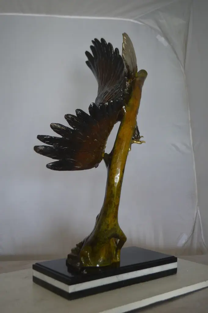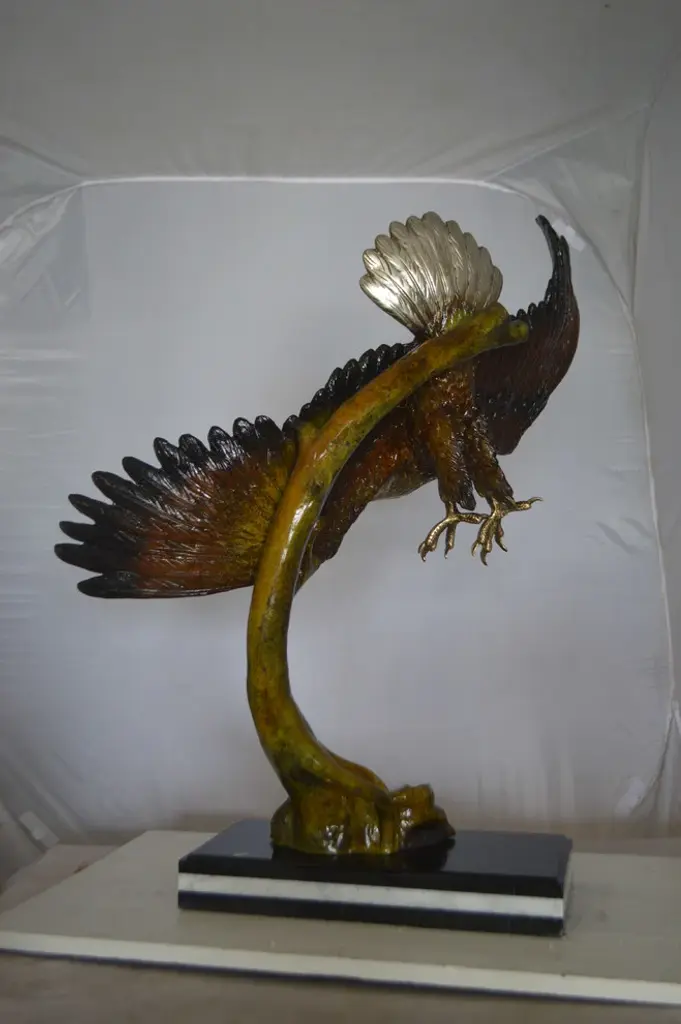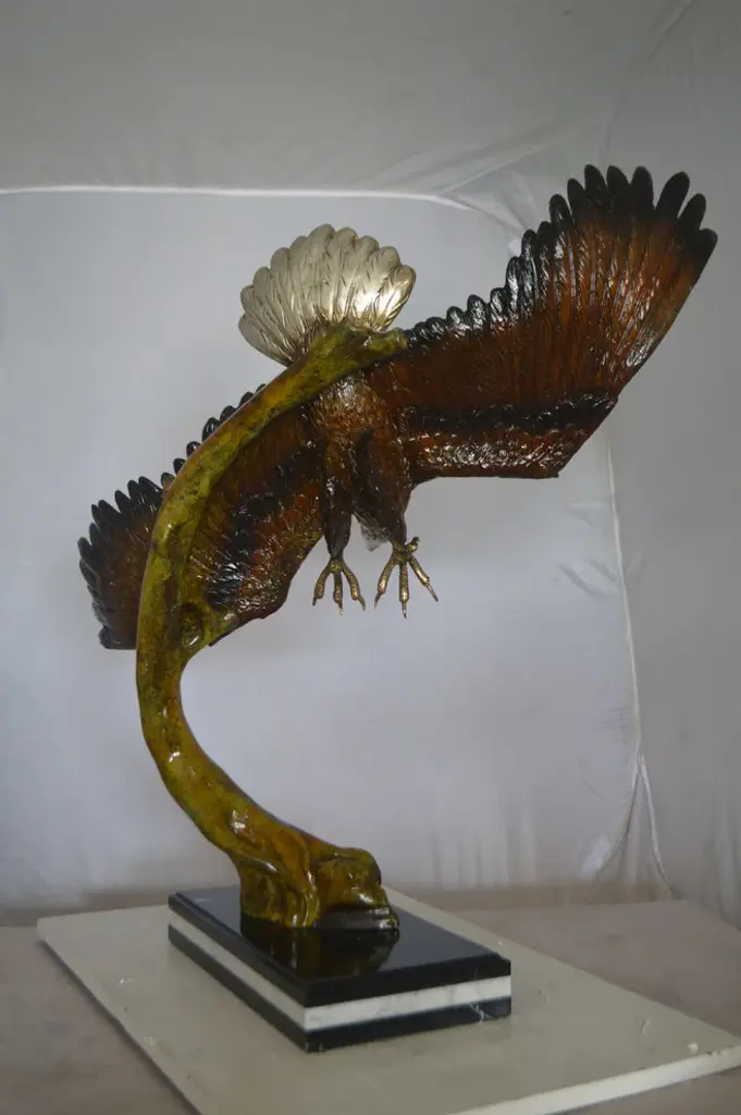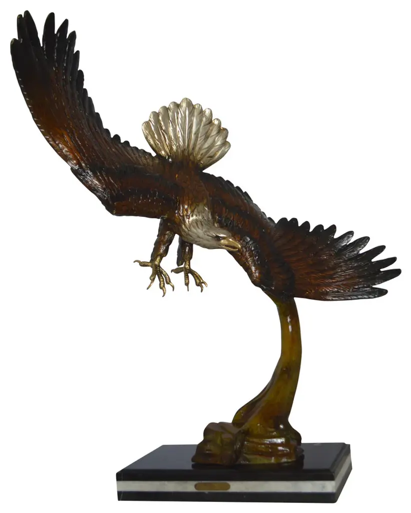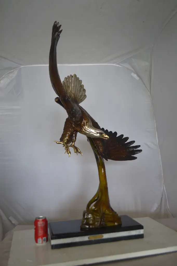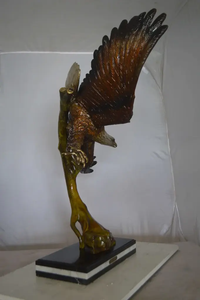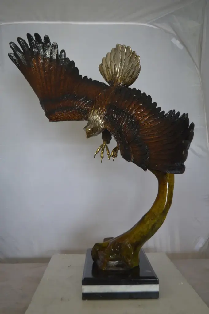 A large eagle made of bronze landing on a tree. This extraordinary sculpture features a realistic tree trunk that supports the eagle in life-size detail. The eagle is shown with marvelous detail to the feathers, beaks and eyes each with a unique expression and pose. This very fine and unique abstract was casted using the ancient old Lost Wax Method with brown patina finish for preservation. The patina chosen for this Timeless Creation is a mix of hand finishing with different colors and Polychrome techniques also referred to as enameling over bronze. This impressive Bronze Statue will be a permanent fixture on the grounds of your estate for years to come. Size: 35"L x 27"W x 38"H. Weight is: 80Lb