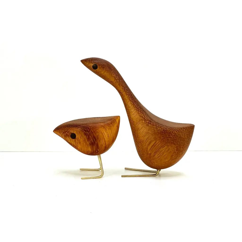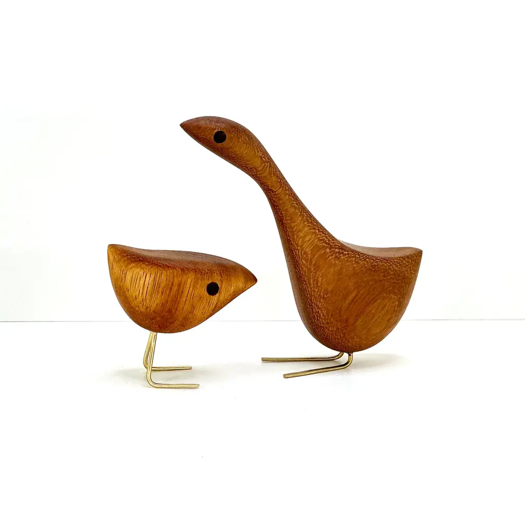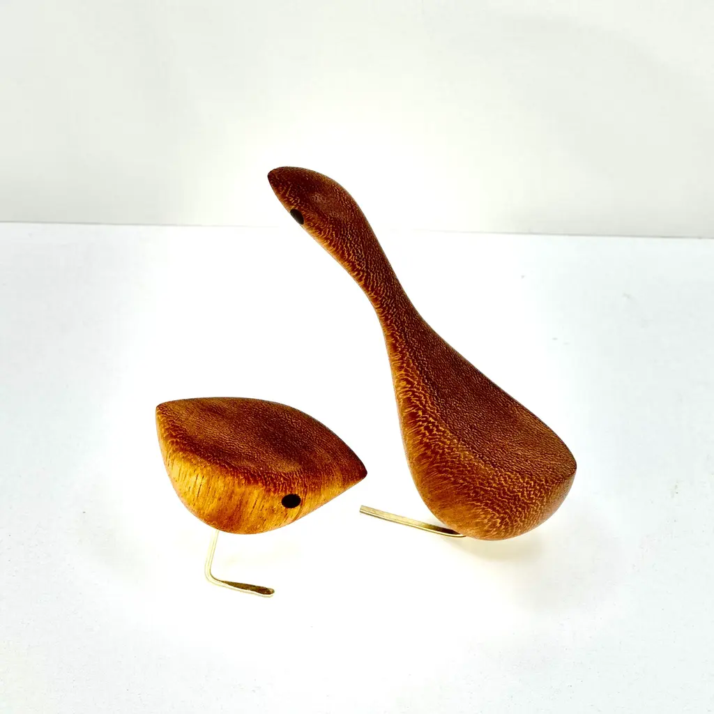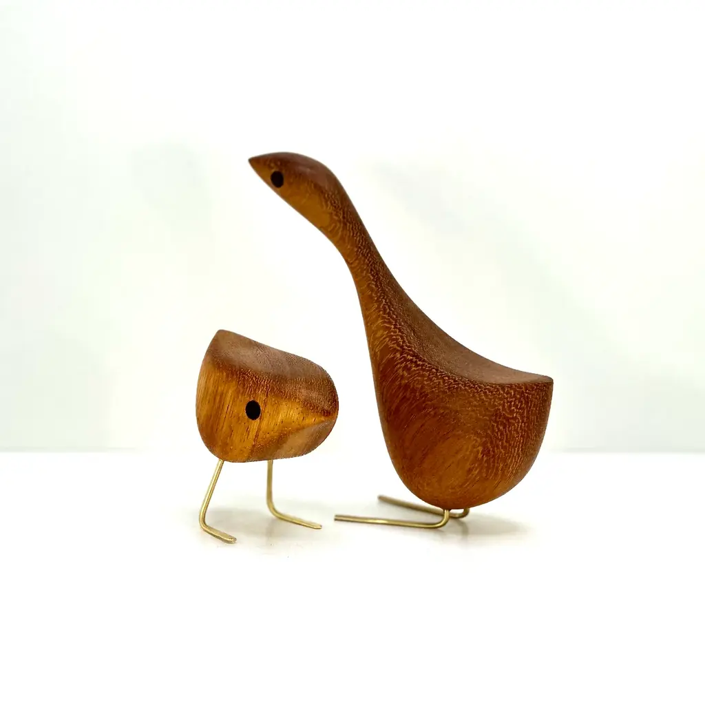 Mid Century Modern style Happy Bird Couple featuring the original Short Happy Bird with its Tall Happy Bird partner. Milwerk Happy Birds are inspired by the figurines created by Danish designer Jacob Hermann. These birds are sculpted from Teak wood like so many of the classic Mid Century Modern birds, figurines and furniture. The eyes are inlaid Walnut and the feet are solid brass. Each bird has a very fine finish and sealed with Danish oil. Packaged in a gift box. Creation Year: MADE TO ORDER, ***Please allow 7 business days to process before shipping.*** ***Because each sculpture is "Made To Order" the grain pattern may vary from the sculpture pictured in this listing.*** The picture of the birds featured in this listing is of previous birds. Each bird is hatched after the last bird has flown the coop so the wood grain may vary slight from the photos in the listing. Medium: Teak, Walnut, Brass Style: Mid Century Modern/ Danish/ Folk art Dimensions: Short Bird: 3” (7.62cm) tall X 3 1/4" (8.25cm) long from tip to tail x 1 1/2" (3.8cm) wide Tall Bird: 5 1/2" (14cm) tall x 5 1/2" (14cm) long from tip to tail x 1 3/4" (4.5cm) wide Please refer to the listing photos with soda bottle for an idea of dimensions. Shipping: We gladly ship Internationally! International customers are responsible for any customs, import and/ or VAT fees that may apply. Cross-posted. Milwerk Sculptures are inspired by the style of Mid Century Modern Danish designers like Jacob Hermann and Svend Aage Holm‑Sørensen and American Mid Century designers Charles and Ray Eames. In many pieces, the grain determines the subject and shape of the sculpture bolstering the organic quality of the wood. Each piece is an original, cut and shaped by hand. Each sculpture is signed (engraved) MILWERK with the year of manufacture.
