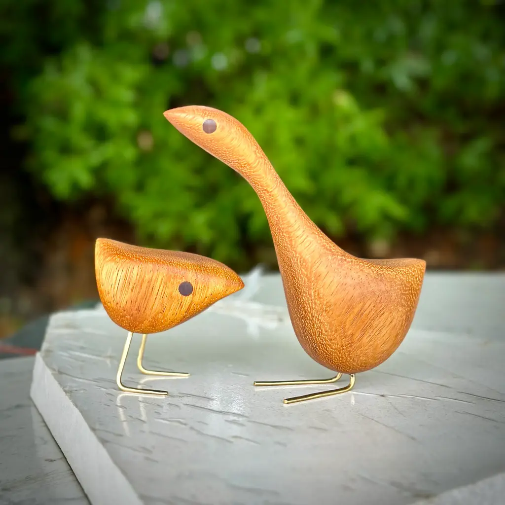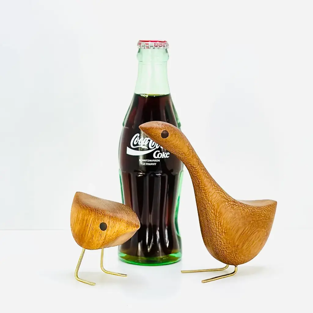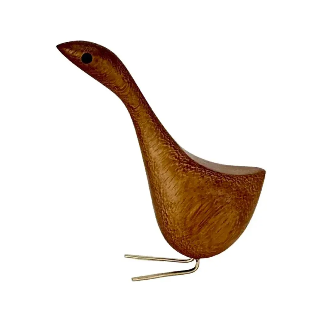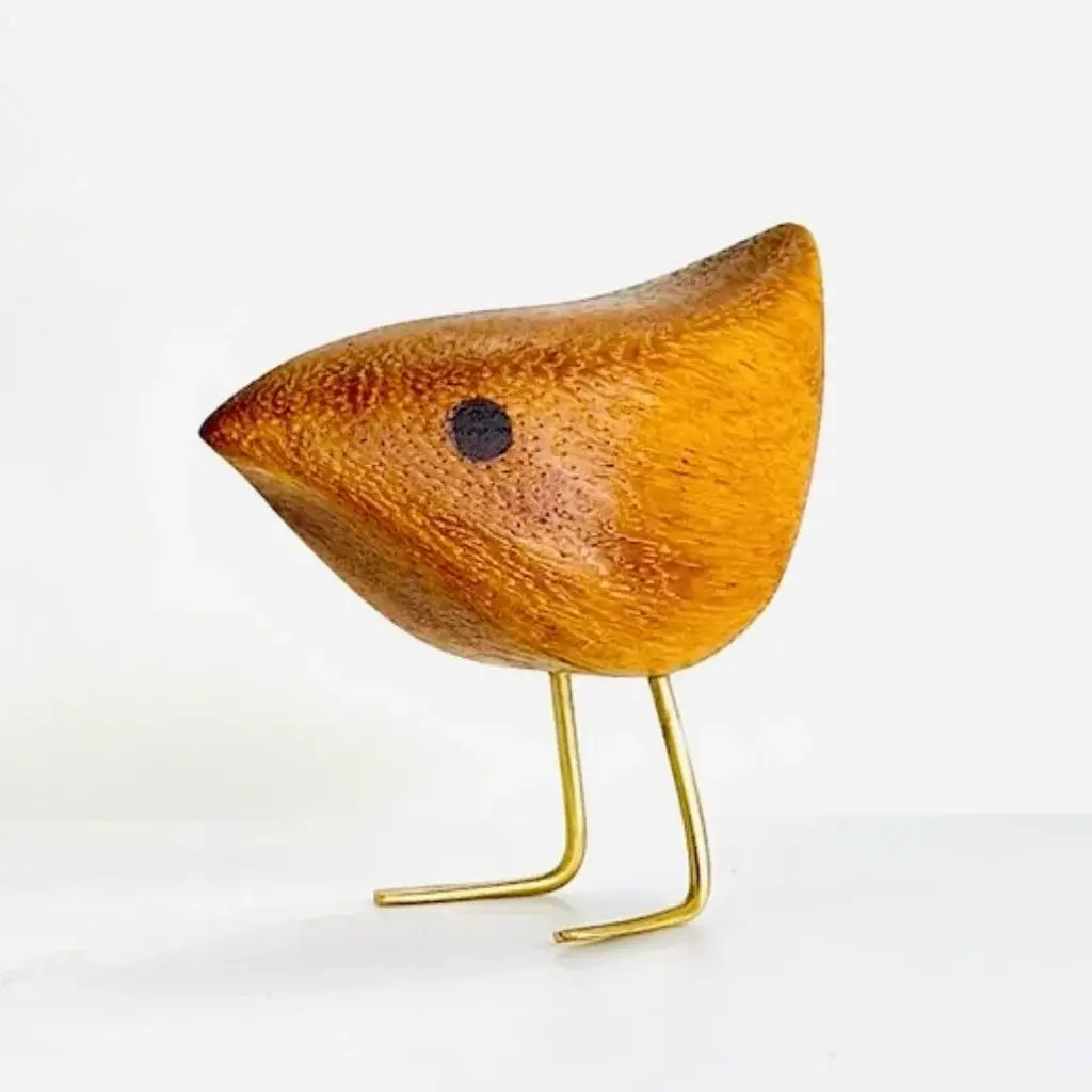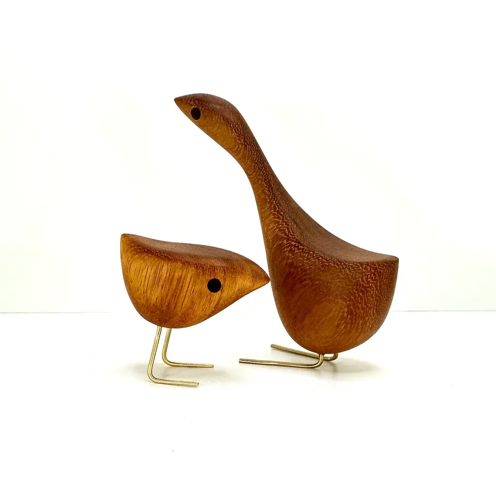 Mid Century Modern style Happy Bird Couple featuring the original Short Happy Bird with its Tall Happy Bird partner. Milwerk Happy Birds are inspired by the figurines created by Danish designer Jacob Hermann. These birds are sculpted from Teak wood like so many of the classic Mid Century Modern birds, figurines and furniture. The eyes are inlaid Walnut and the feet are solid brass. Each bird has a very fine finish and sealed with Danish oil. Packaged in a gift box. Creation Year: MADE TO ORDER, ***Please allow 7 business days to process before shipping.*** ***Because each sculpture is "Made To Order" the grain pattern may vary from the sculpture pictured in this listing.*** The picture of the birds featured in this listing is of previous birds. Each bird is hatched after the last bird has flown the coop so the wood grain may vary slight from the photos in the listing. Medium: Teak, Walnut, Brass Style: Mid Century Modern/ Danish/ Folk art Dimensions: Short Bird: 3” (7.62cm) tall X 3 1/4" (8.25cm) long from tip to tail x 1 1/2" (3.8cm) wide Tall Bird: 5 1/2" (14cm) tall x 5 1/2" (14cm) long from tip to tail x 1 3/4" (4.5cm) wide Please refer to the listing photos with soda bottle for an idea of dimensions. Shipping: We gladly ship Internationally! International customers are responsible for any customs, import and/ or VAT fees that may apply. Cross-posted. Milwerk Sculptures are inspired by the style of Mid Century Modern Danish designers like Jacob Hermann and Svend Aage Holm‑Sørensen and American Mid Century designers Charles and Ray Eames. In many pieces, the grain determines the subject and shape of the sculpture bolstering the organic quality of the wood. Each piece is an original, cut and shaped by hand. Each sculpture is signed (engraved) MILWERK with the year of manufacture.