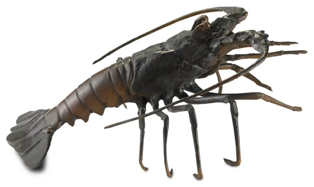 Our Edo Bronze Lobster sculpture is made from a lost-wax technique when boiling bronze is poured into a mold covering an original wax sculpture that melts away. Once set, there is a very long process of refining the bronze to give it patina. This was an incredibly difficult piece to achieve as it so intricate, and we are proud of this piece that will be an antique of the future.