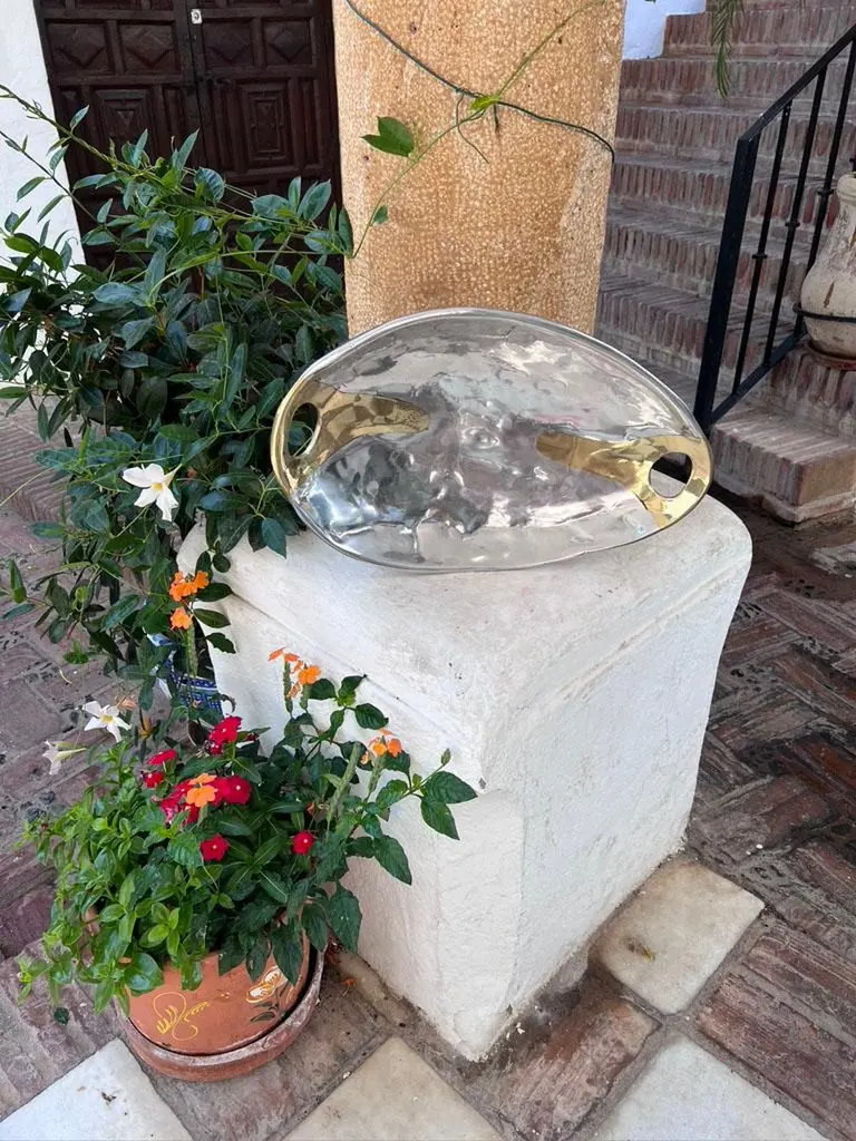 The decorative Fruit Bowl was created by David Marshall, it is made of sand cast aluminum and sand cast brass.Handmade, mounted and finished in our foundry and workshop in Spain from recycled materials.Certified authentic by the Artist David Marshall with his signature.The Artist is inspired by nature and land scape making functional art and sculptures out of recycled materials.We work with arquitects, interior designers and private clients to create specific designs, signage, staircases etc. for Homes, Hotels, Restaurants.Awards for Charity Foundations like Global Gift,Bespoke Awards for companies with engraved personal Logos, Trophies for any kind of eventOne of the qualities of any sculpture and decorative design lies in the ability to bring its surrounding space into order.