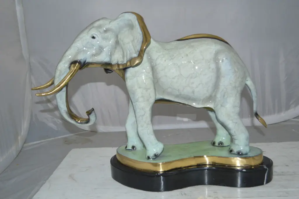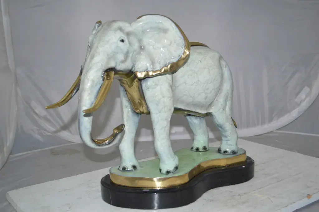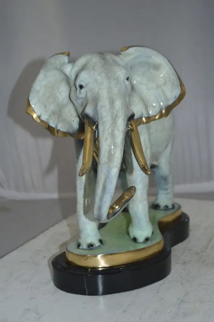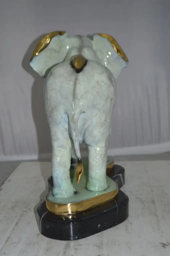 This Elephant statue looks ready to march right off of its platform. It looks that real with the detailing that is found from the texture of the hide of the elephant to the face and trunk, the details make these bronze pieces. Give as a gift or keep it for yourself. Either way you will find that it is a great value and will add enjoyment and life into your home. Size: 28"L x 12"W x 17"H. Weight is: 39Lb