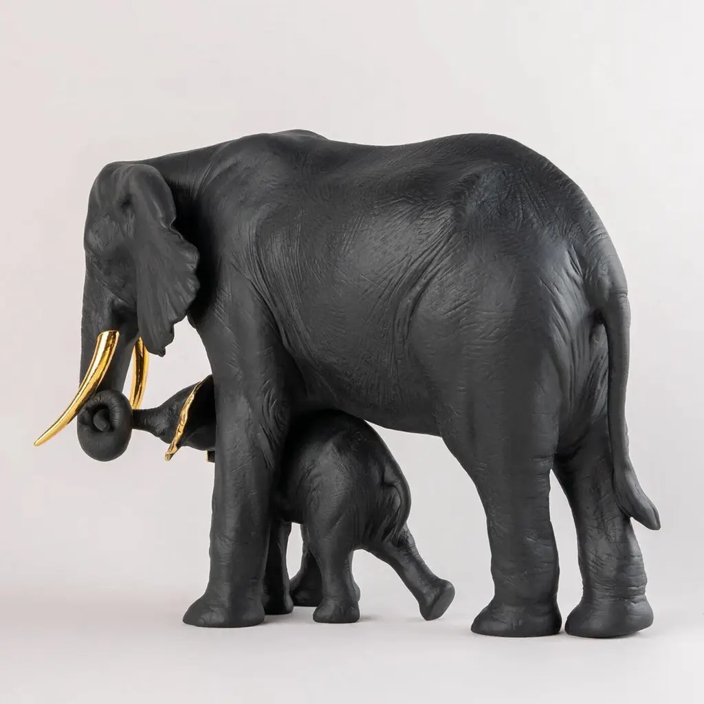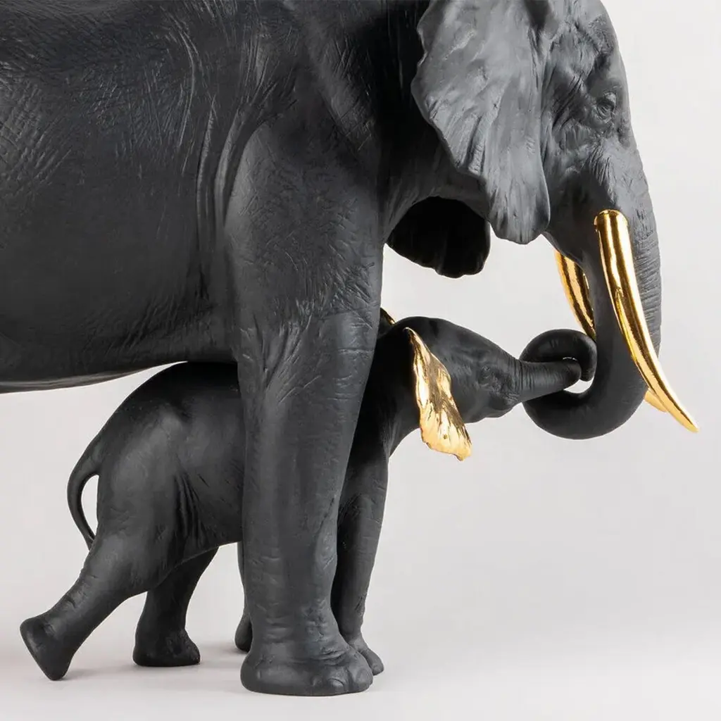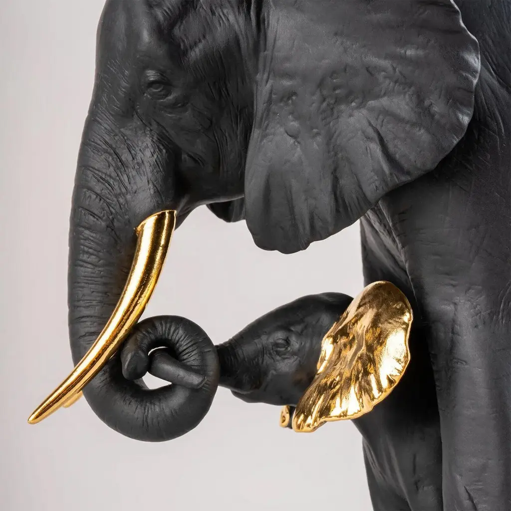 Sculpture elephants black with all structure in porcelain in black matte and shiny gold finish.