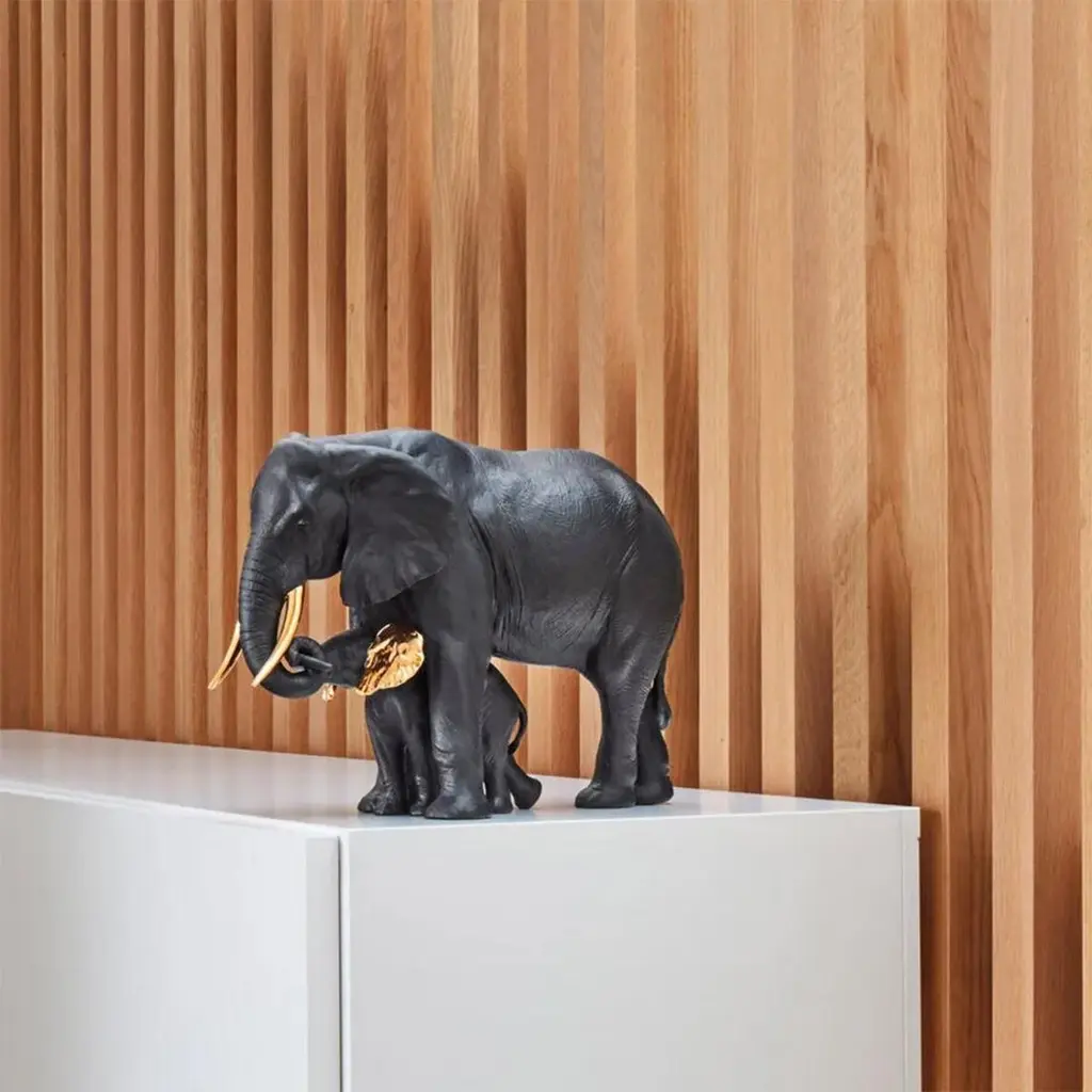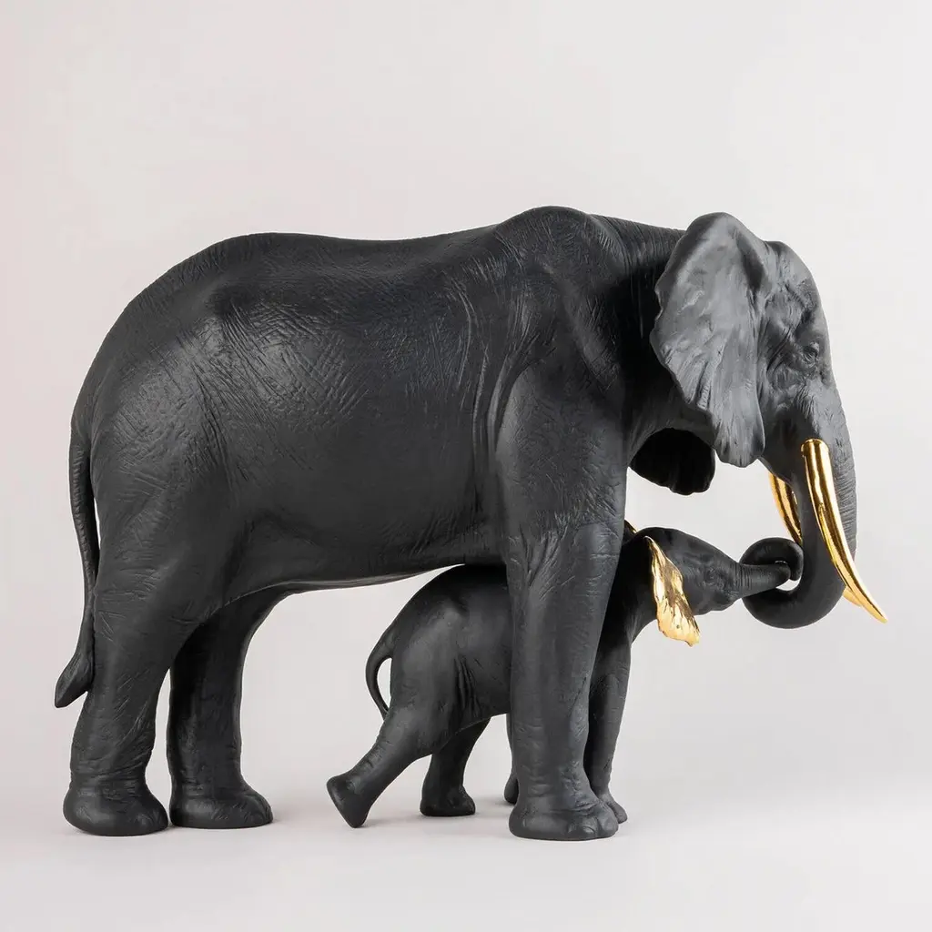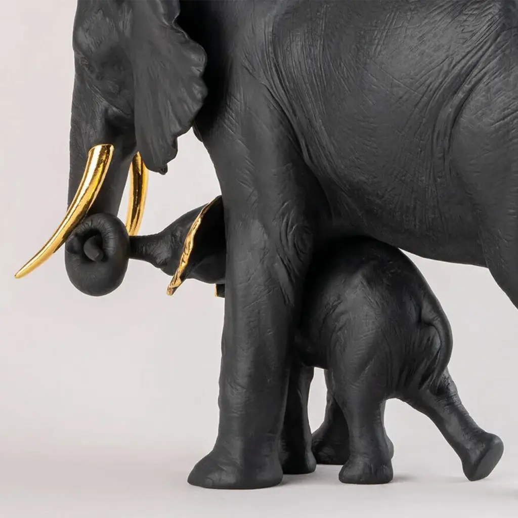 Sculpture elephants black with all structure in porcelain in black matte and shiny gold finish.