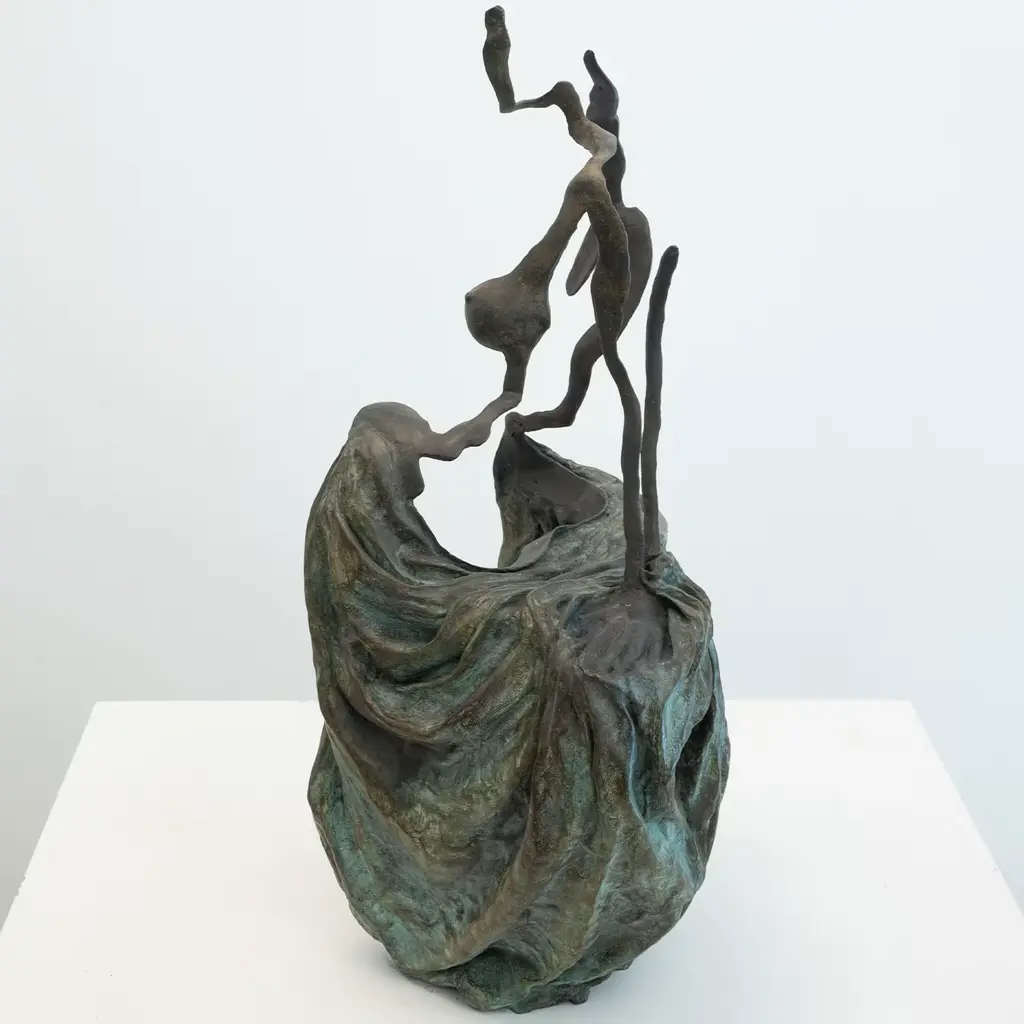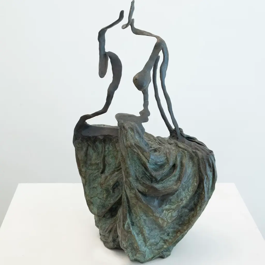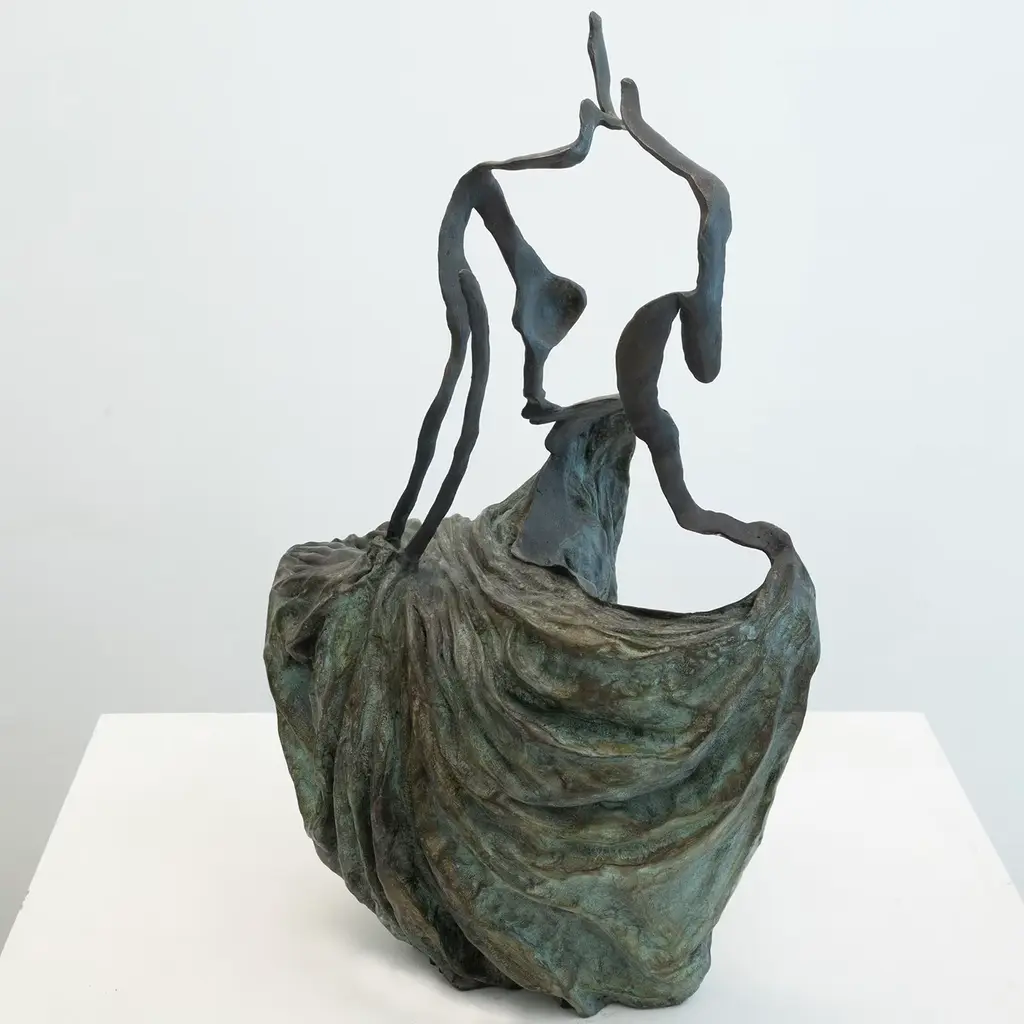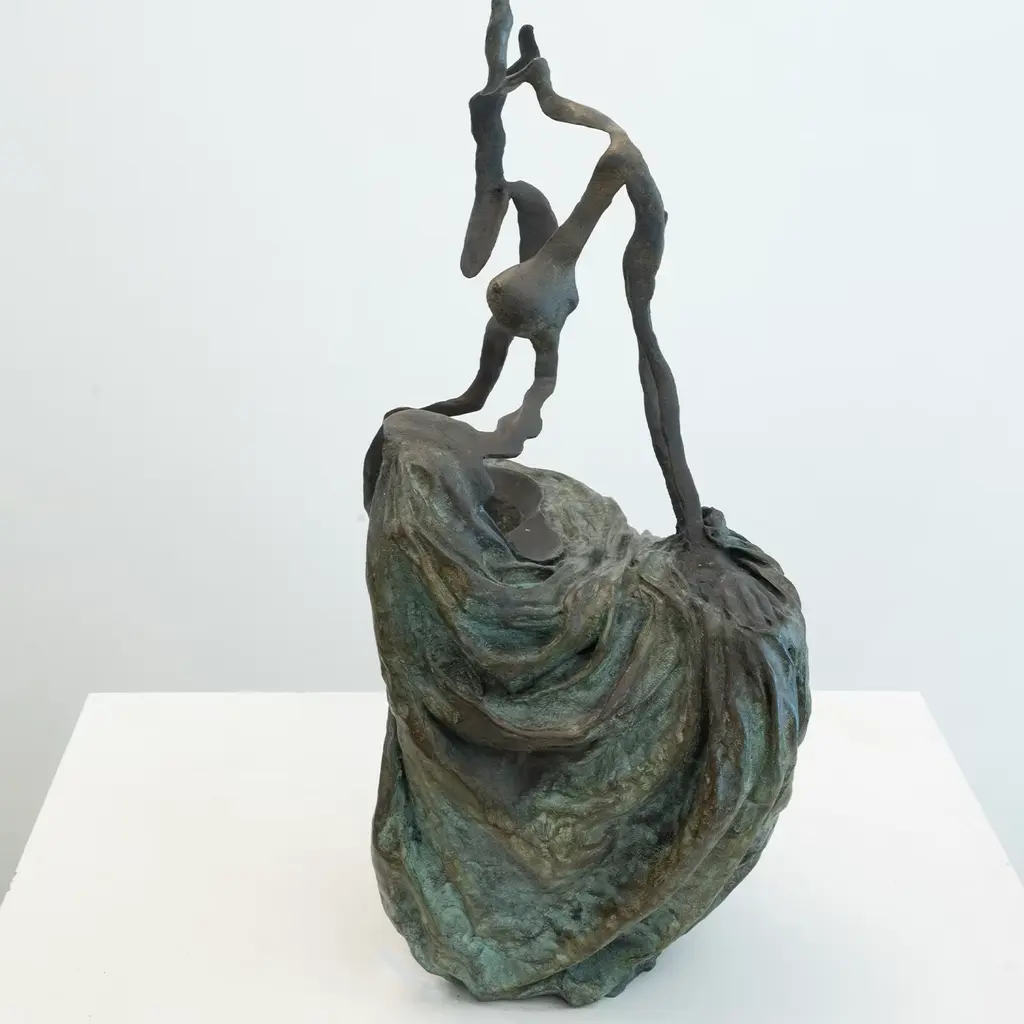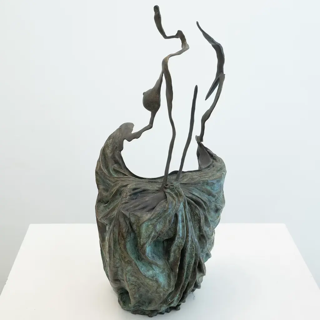 As in a drawing, the bronze line traces the profile of the female figure sat from behind. The harmonious composure of the classical figure dialogues with more dramatic moments, between the volume of the absent body of the woman and her image.