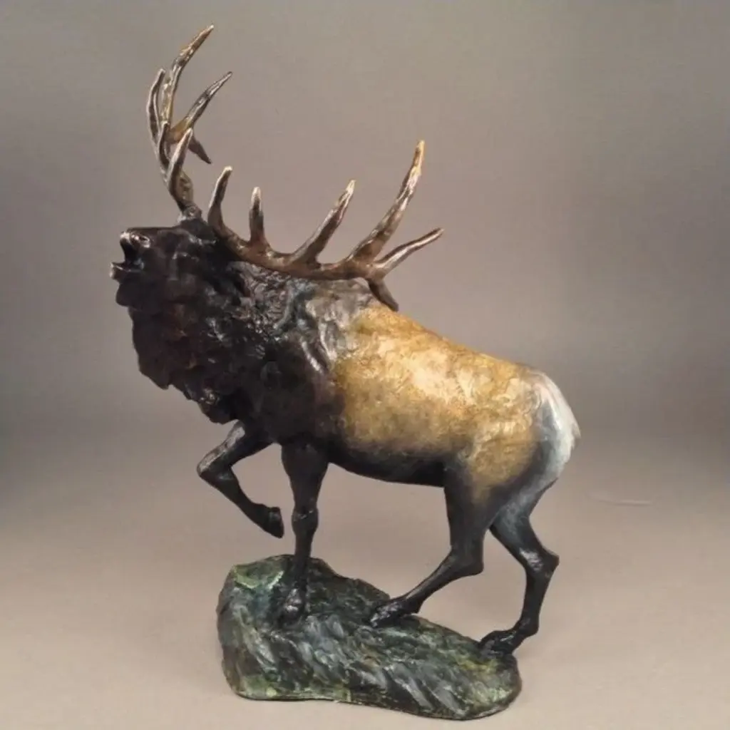 Bronze Elk Sculpture Mountain Monarch from sculptor Eli Hopkins of Mark Hopkins Studio captures a living symbol of the northern American wild in rich detail and evocative vitality. Created in Bronze by artist Eli HopkinsLimited Edition of 100Internationally renowned American artist Mark Hopkins creates bronze sculptures that have thrilled collectors and casual art fans alike for more than two decades. Mark Hopkins'' unique balance of organic inspiration and singular contemporary design has been called "bronze in motion" for its fluid look, which often appears to display natural beauty in defiance of gravity. About Mark HopkinsMark Hopkins takes his inspiration for every facet of life on Earth, from the majesty of wildlife to mankind''s interaction with nature, and produces limited-edition pieces that evoke a sense of awe and respect for the mysteries and loveliness of the world around us. Collectors of his work include Barbara Mandrell, Clint Eastwood, Bill Clinton, Colin Powell, George and Barbara Bush and a host of other luminaries and corporations including the National League Association of Baseball Club Owners, the Atlanta National Golf Club, Humana, Coca-Cola and others. Each Mark Hopkins sculpture is crafted with pride in the USA. Captivated by form and design, Mark has personally created a signature style of vibrant vitality resulting from decades of study. Encouraged by parents and teachers from an early age, Mark''s unique talent developed alongside his technical skills of sculpting and casting. As an artist, Mark is constantly challenging himself to render the rich beauty of life and the deep emotion of the human soul into flowing sculptural form, noting "I strive to express beyond the image, to catch spirit, to reveal deeper emotions, and to share joy. "About the Production ProcessFrom the artist''s hand to the final polishing stages, many intricate steps go into the creation of a limited edition bronze sculpture. First the reproduction mold is made in which layers of silicone rubber and plaster are delicately applied to the original work. Then hot wax is poured into the reproduction mold to form an exact replica of the original sculpture. When the wax replica is removed from the mold, it is then inspected and refined or "chased" by hand to remove any imperfections that may have occurred in the reproduction process. Next, ceramic cup and wax sprues, or gates, are added which later will help channel the molten bronze into the shell to create the sculpture. The next step is creating the ceramic shell by alternately dipping the wax replica over a period of several days into a vat of liquid slurry, then a vat of silica crystals. The shell is then set to dry, and the process repeats until the shell has reached the appropriate thickness and strength. The finished shell is placed in a high temperature oven that melts and removes the wax (the traditional "lost wax" method). The hardened or "fired" shell is secured