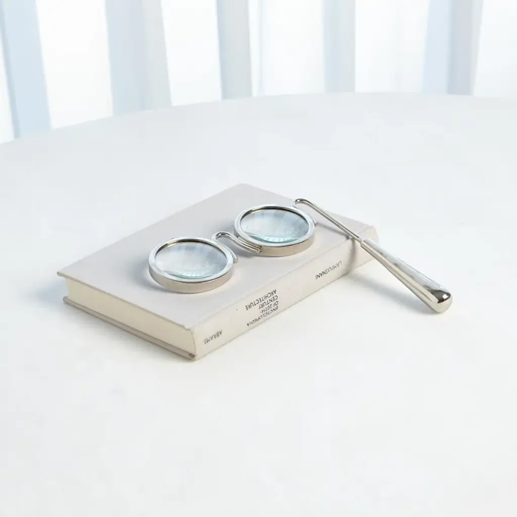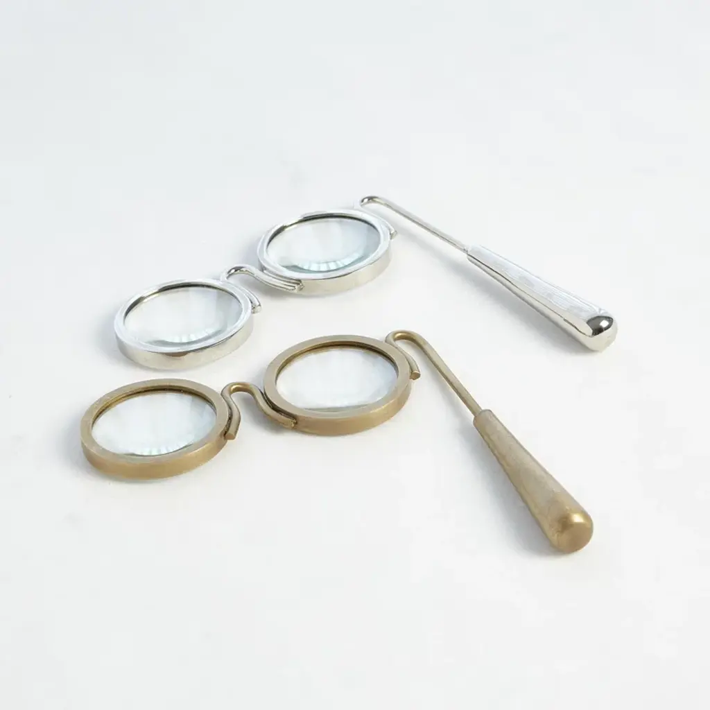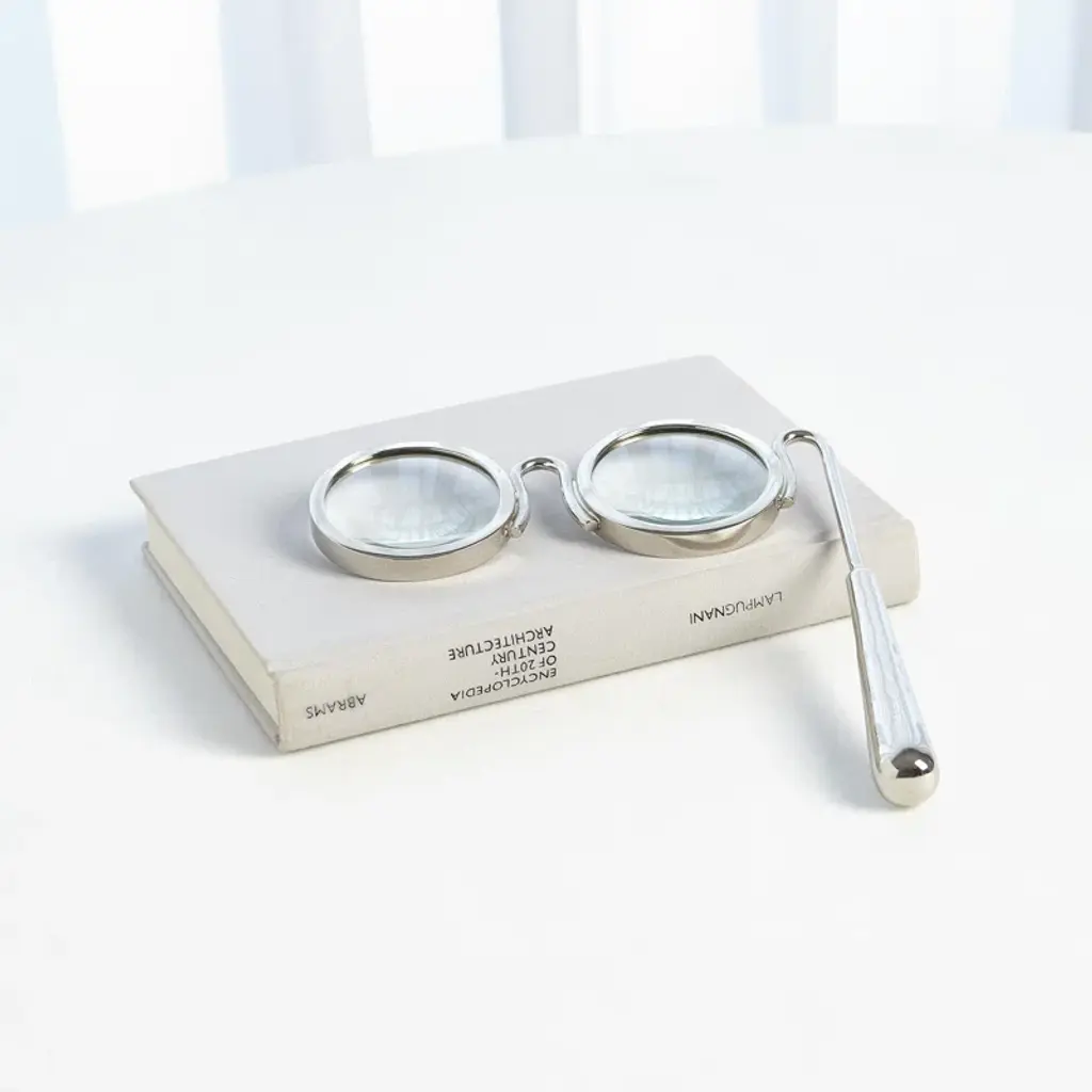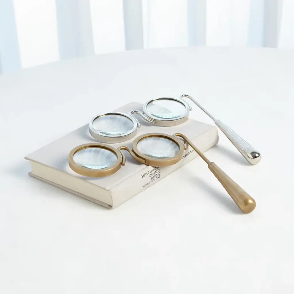 Accent your living room mantel or master suite dresser in vintaged style with this lovely magnifying glass, showcasing a glasses design and brass-hued finish.