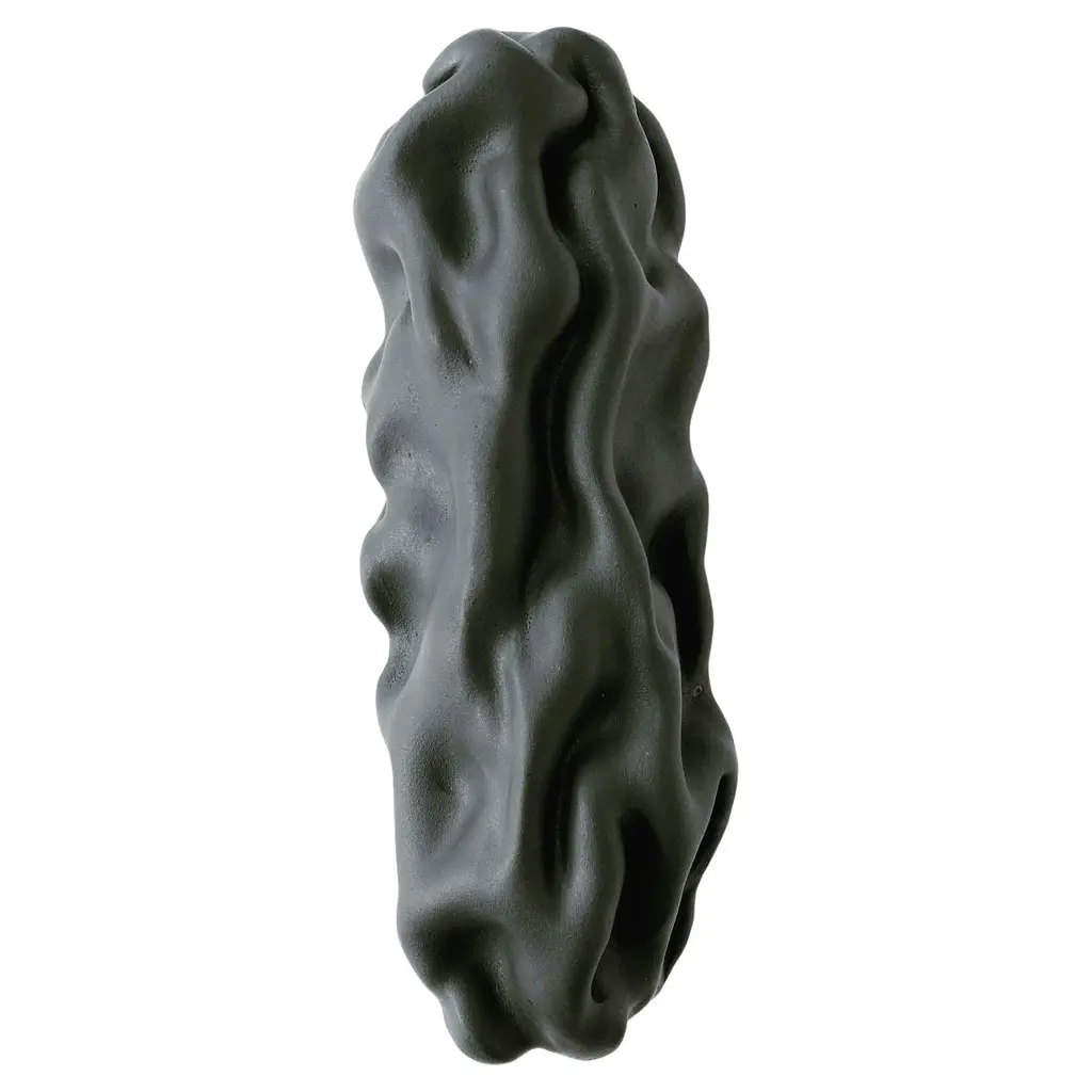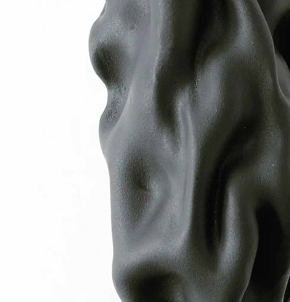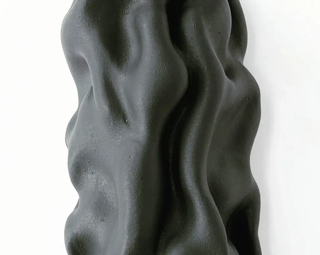 Emboss wall sculpture ii by sophie rogers dimensions: d 8 x w 12 x h 32 cm materials: ceramic, glaze other glaze colors available. Wall sculpture with undulating shape like a draped piece of cloth. Changes expression depending on the light around it and the day’s sunlight. The size differs from piece to piece as they are all unique and handmade.