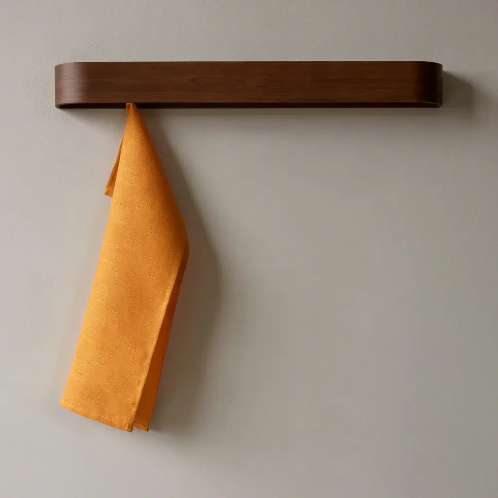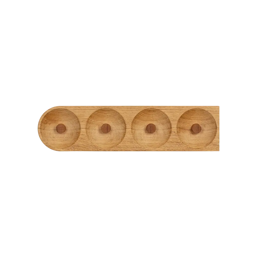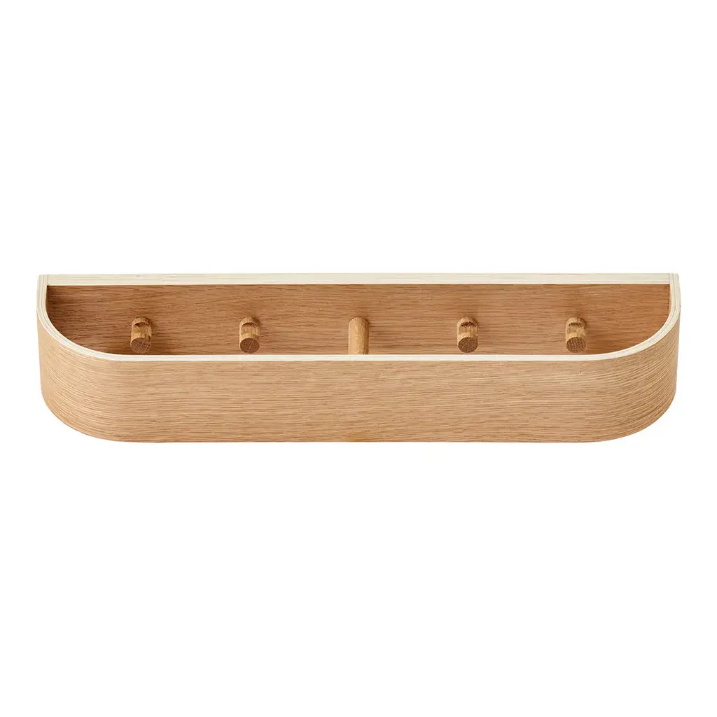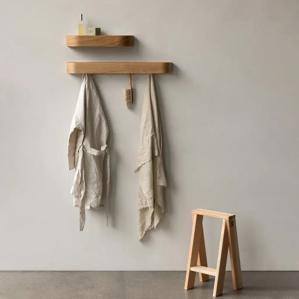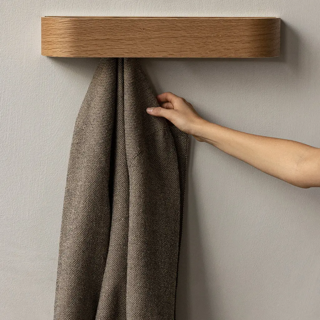 Clean lines, intuitive function and innate beauty define the Epoch Clothes Rack by Nina Bruun, one of two new designs from the Danish designer. Updating the ubiquitous coat rack and working from the idea of concealing unsightly hangers and tags behind something beautiful, the minimally elegant design profiles a considered combination of gently rounded edges, warm wood and discreet functionality. Developed and perfected over time, it is characterized by soft bands of undulating wood that sit like sculptures on a wall. Referencing 1950s design aesthetics and traditional craftsmanship, Epoch is pure in both form and material. Available in natural or dark stained oak, it is carefully sized to fit both purpose and place.