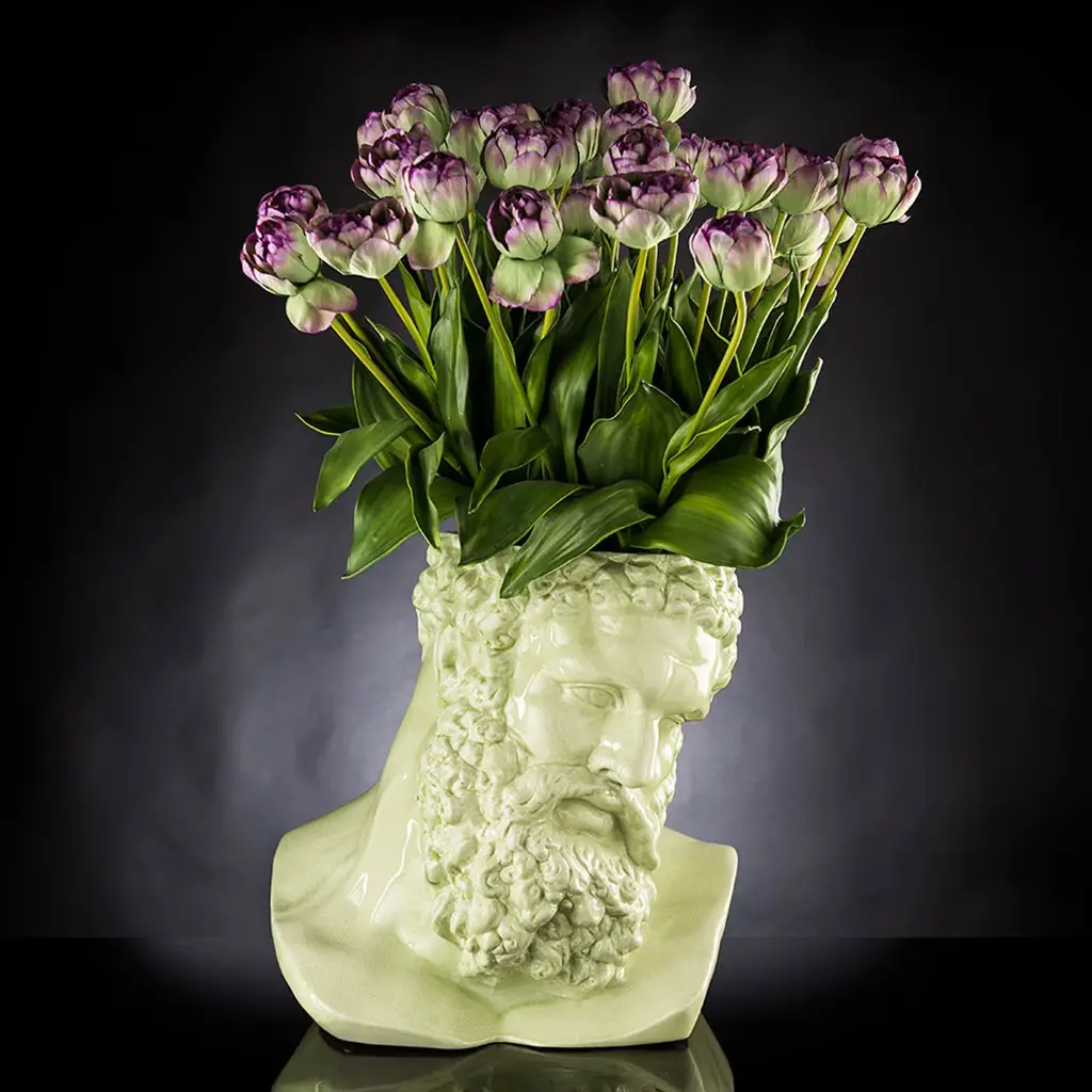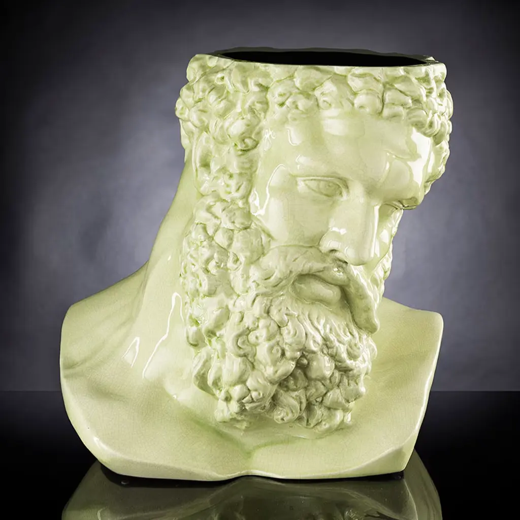 Homage to Italian classic sculpture and modern design meet in this refined ceramic cachepot, deftly handcrafted by master artisans who earned it a sophisticated craquelure green design. Rendered in exquisite details, the Hercules' bust is hollow for welcoming dried floral compositions. Please explore the Artemest catalog for more designs from the Ercole series.