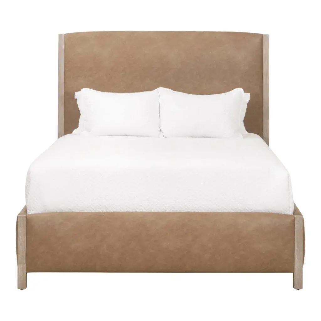 Experience the timeless elegance of the Emmett Standard King Bed by Essentials For Living. Boasting a transitional design, this bed seamlessly blends traditional and contemporary elements to elevate any bedroom decor. The frame, crafted from a combination of materials including solid rubberwood and solid beech wood, features a slightly distressed natural gray finish that complements the Ivanhoe Toast PU vegan leather upholstery. The soft and durable vegan leather not only offers durability and easy cleaning but also has a warm and sophisticated look. The headboard, footboard, and side rails are fully upholstered, drawing the eye to the exposed wood legs. It also features an extra-wide engineered wood slat foundation to ensure robust support for a restful night's sleep. It measures 82" wide, 86.5" deep, and 61" high. With its solid wood, post-style legs and impeccable quality, this bed is a statement piece that promises both style and longevity. Emmett Upholstered Bed Ivanhoe Toast Natural Gray Features: Dimensions (in): 82"W x 86.5"D x 61"H Product Finish: Ivanhoe Toast, Natural Gray Style: Transitional Frame Finish: Natural Gray Frame Material: Plywood, Solid Rubberwood, Solid Beech Wood Upholstery Finish: Ivanhoe Toast Upholstery Material: 84% Polyester/16% PU Vegan Leather, Foam Product Weight (lbs): 250 Solid Wood, Post Style Legs Upholstered Headboard, Footboard & Side Rails Extra Wide, Engineered Wood Slat Foundation A Box Spring or Bunkie Board Is Not Required Floor to Bottom of Side Rail: 4" Headboard Dimensions: 82" x 2" x 61" Floor to Top of Side Rail: 18" Side Rail Thickness: 2" Footboard Dimensions: 82" x 2" x 18" Floor to Top of Slats: 12.25" Interior Dimensions: 77.5" W x 81" L Indoor Use Only Assembly Required: Yes Collection: Traditions Country of Origin: Vietnam