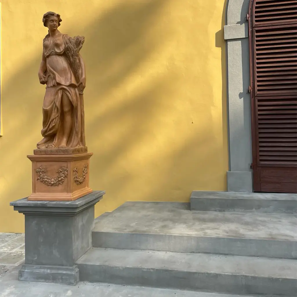 A glorious addition to opulent classic-style decors, this majestic statue crafted of terracotta represents one of the four allegories for the four seasons. The lush bundle of wheat spikes and the sickle the female subject holds in her hands suggest the connection with summer when peasants take care of the harvesting. A bold base adorned with raised decorations of garlands completes the design.