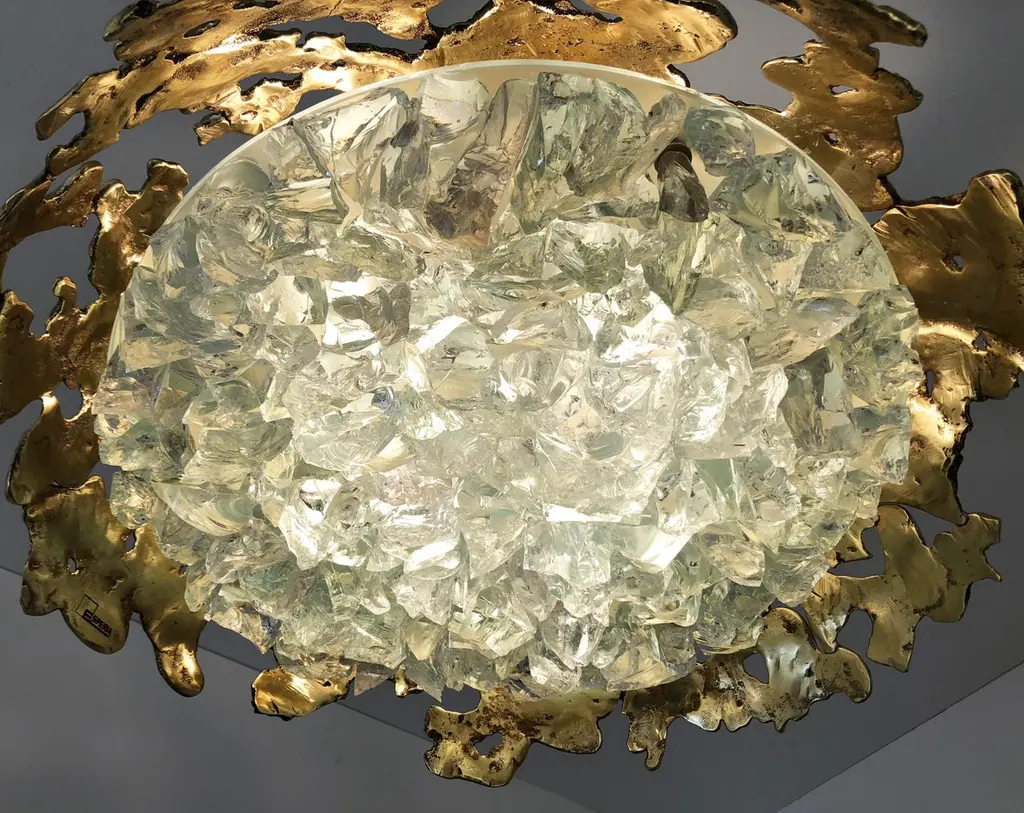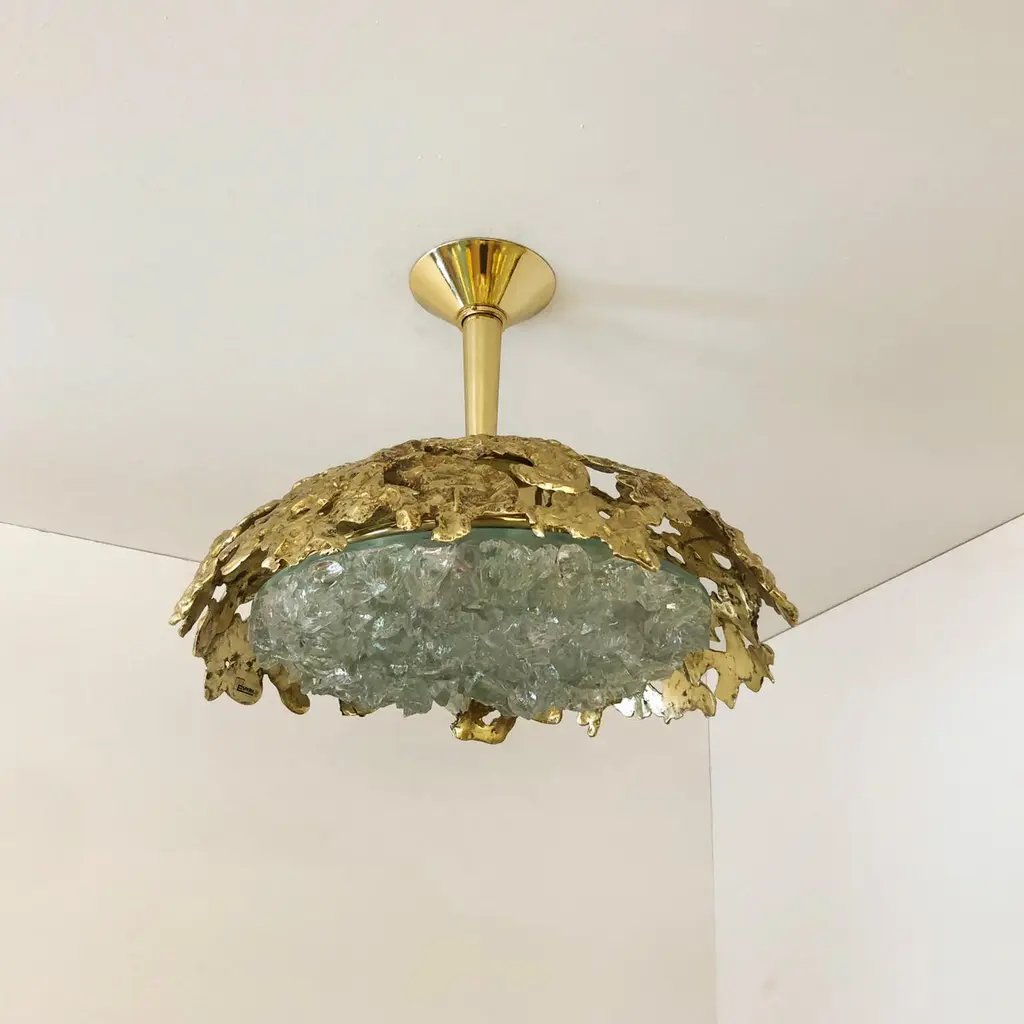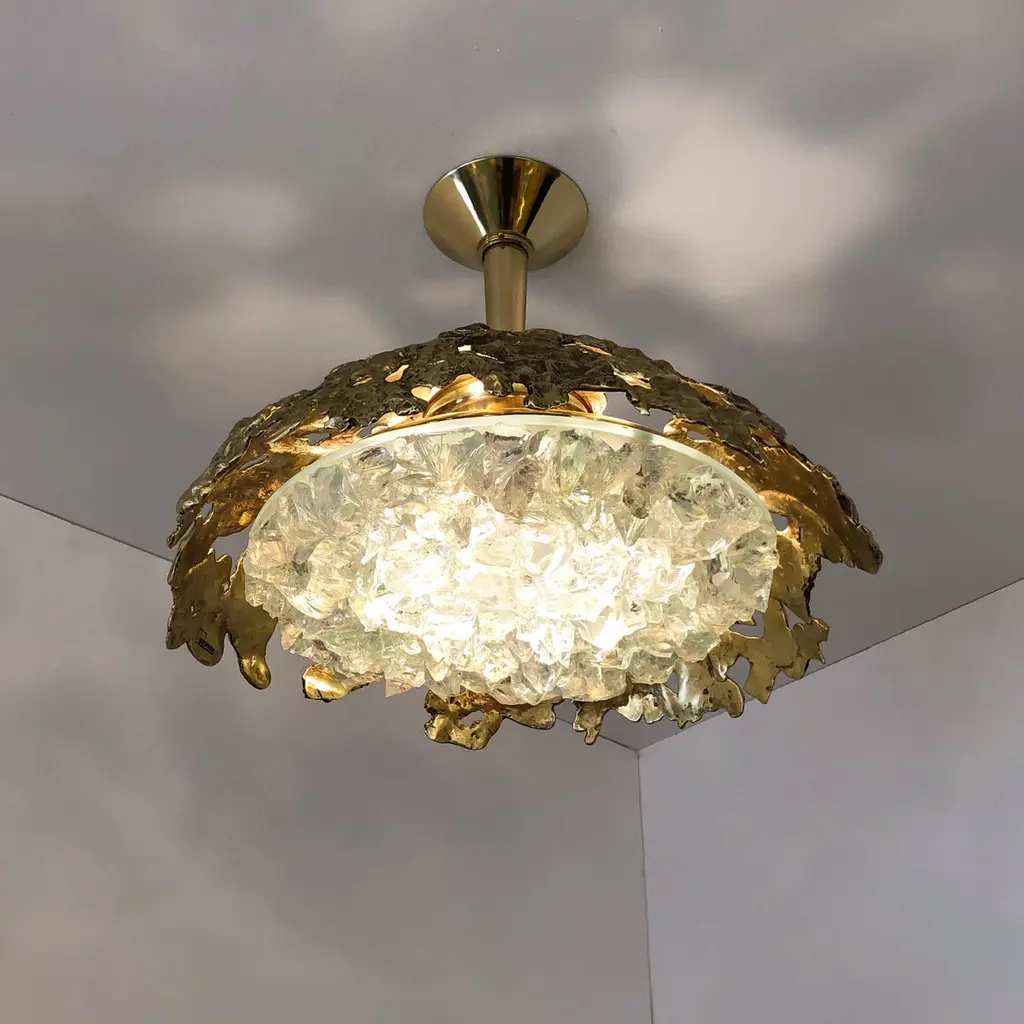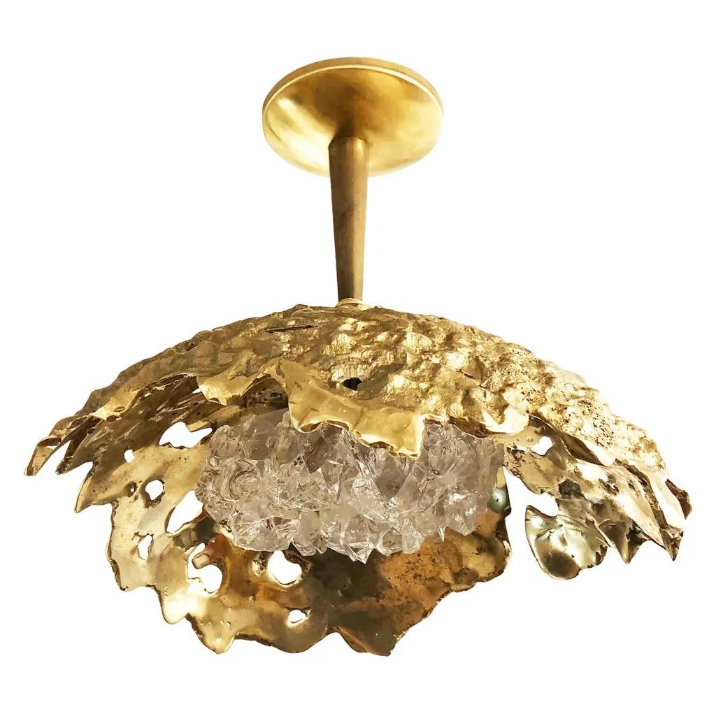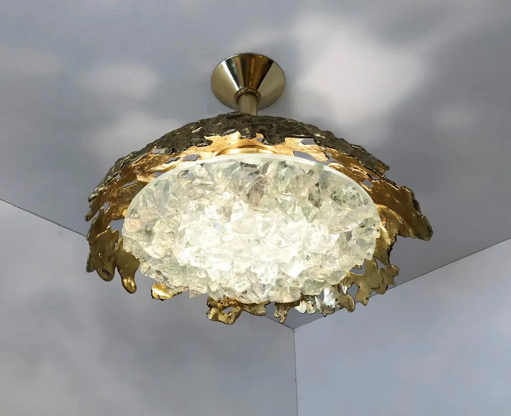 Blending sculpture and design, the N.21 is the largest fixture of the Etna series with an expansive glass shade composed of dozens of crystal elements. The organic cast brass shell culminates in a polished stem and canopy. Shown in polished brass with clear glass.Starting at $ 9,200 for standard finishes.Starting at $ 10,100 for premium finishes.Customization Options:Each fixture is hand crafted in Italy and is available any of our 10 finishes and 8 enamel colors. Can be installed as pendant on a stem or a flush mount. Compatible with our Tuscan crystal.Lead Time: 10-12 weeks plus shipping.Diameter: 21”Height: 16”. Overall height can be adjusted as needed.Electrical: Four E12 40W incandescent or 75W LED equivalentModel#: LTZ626