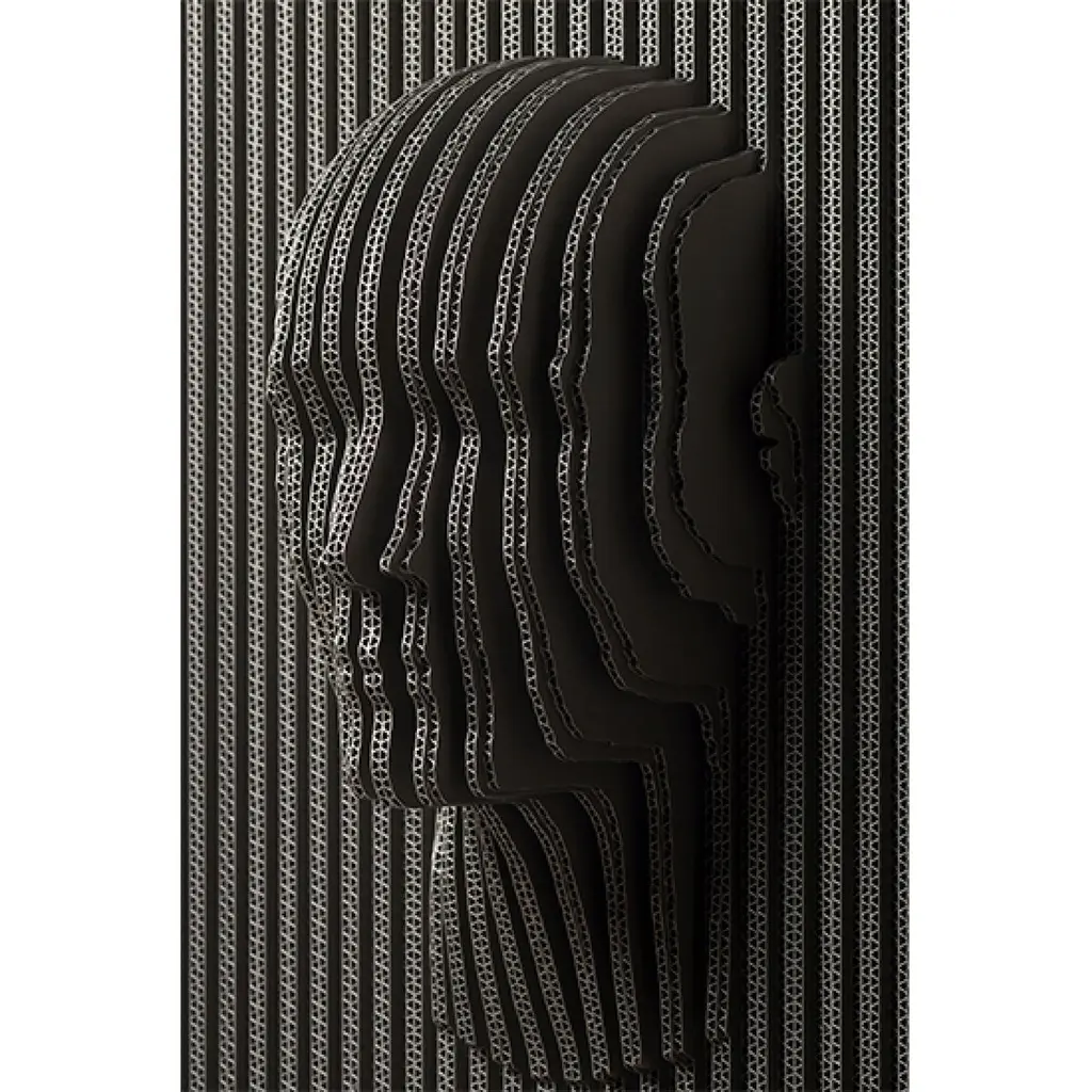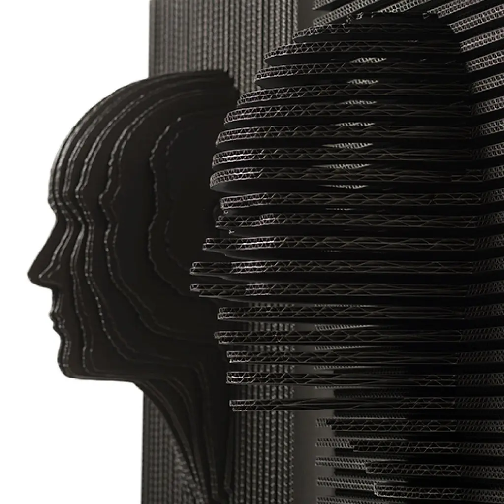 Sculpture made of cardboard sections (4 mm thickness each). Matt finish with stain and exterior polyurethane coating. This Sculpture mixes two techniques, CAD assisted by computer cuts and handmade craftmanship. Since the pieces are carefully assembled by hand. This artwork is inspired in natural shapes and human forms.A captivating piece of art that celebrates the diversity and complexity of the human experience. Inspired by the intricacies of facial features, this sculpture is crafted from laminated cardboard, transforming a humble material into a striking and thought-provoking work of art. It is a striking fusion of artistry, craftsmanship, and social commentary that celebrates the beauty and complexity of the human spirit.DIMENSIONSW - 52 cm / 20.5”H - 72 cm / 28.3”L - 27 cm / 10.6”Width tolerance +/- 5mmNET WEIGHT10 lb / 4.5 kg