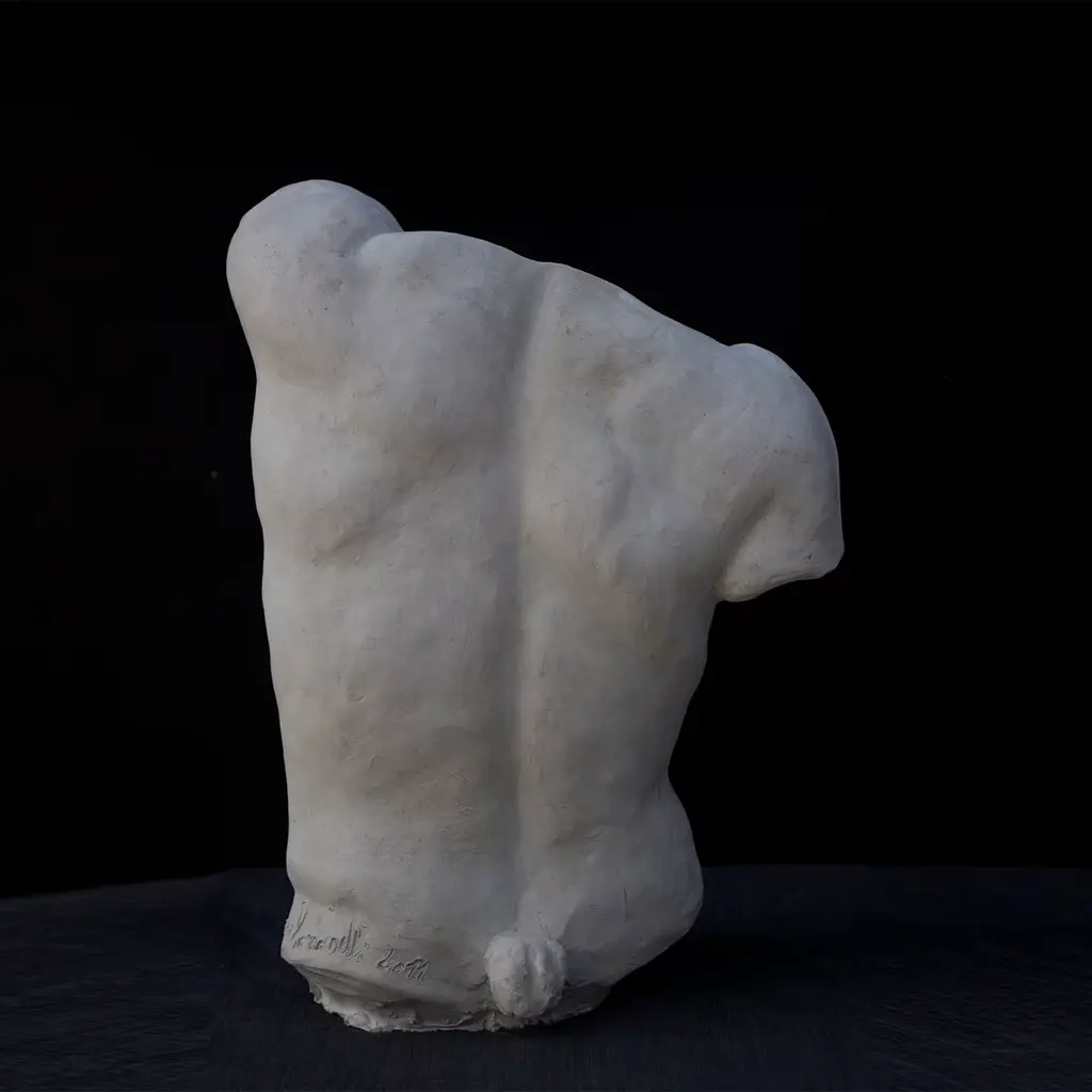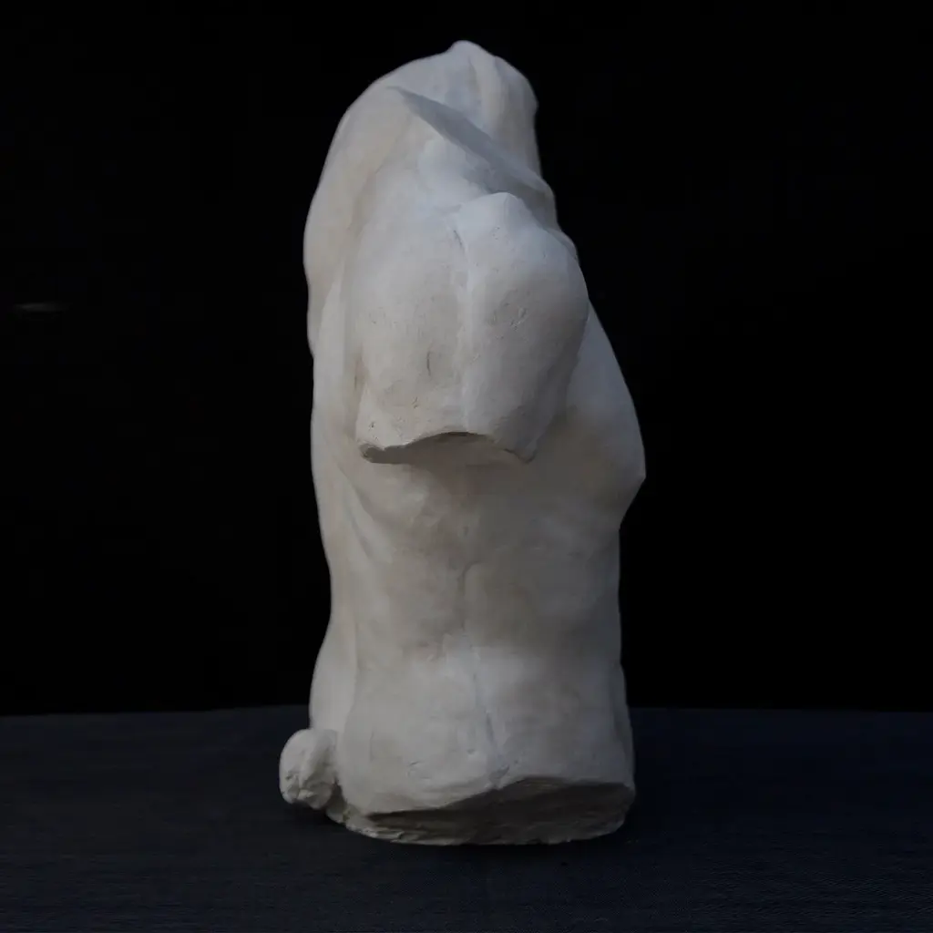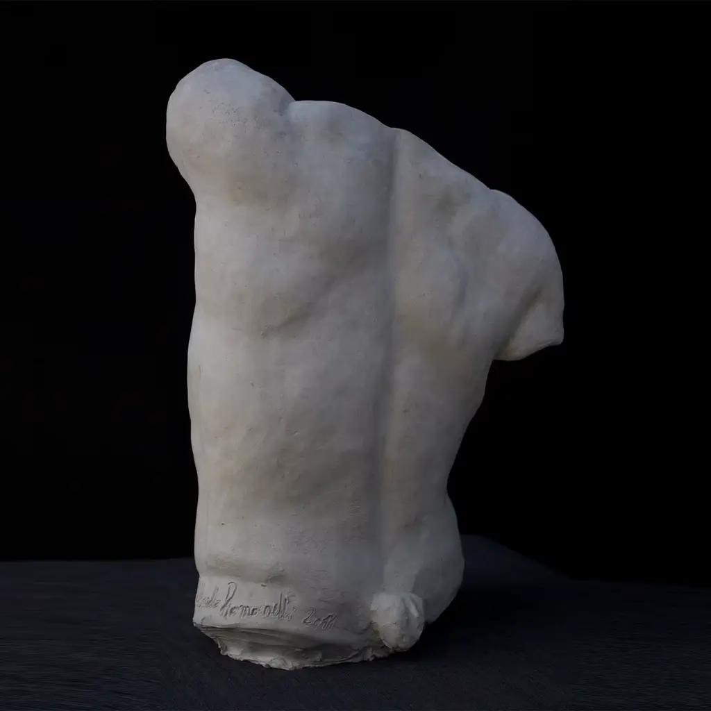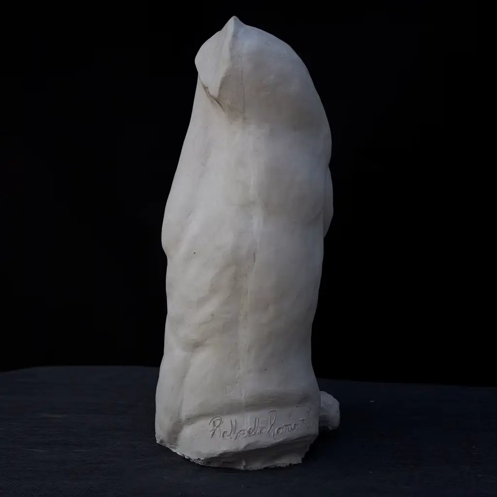 This plaster bust is a reproduction of the original bronze model created by the sculptor Raffaello Romanelli. Inspired by the famous Torso Gaddi displayed in the Classical Sculpture Room of the Uffizi Museums in Florence, this piece puts the emphasis on the study of anatomy and muscles. The particular pose, called "contrapposto", inspired some of the greatest artists of the Renaissance, in particular Michelangelo.