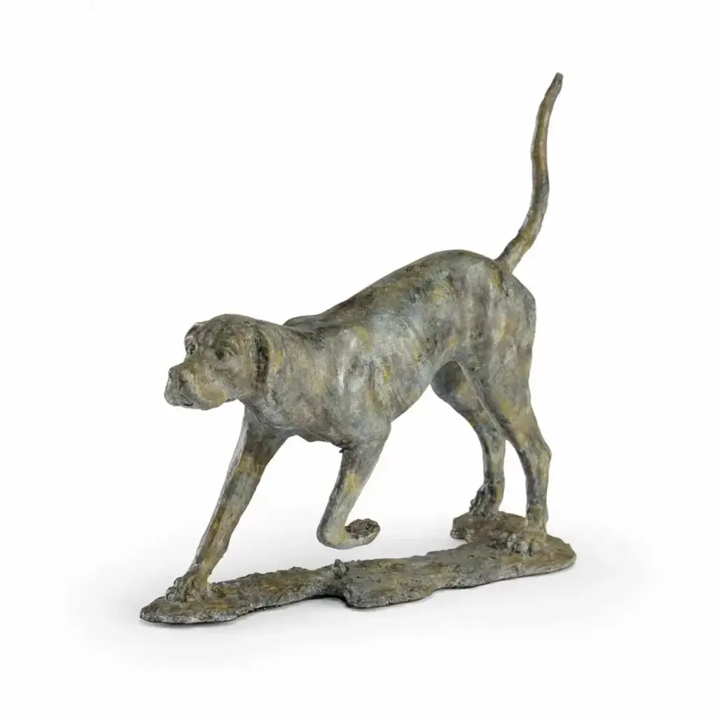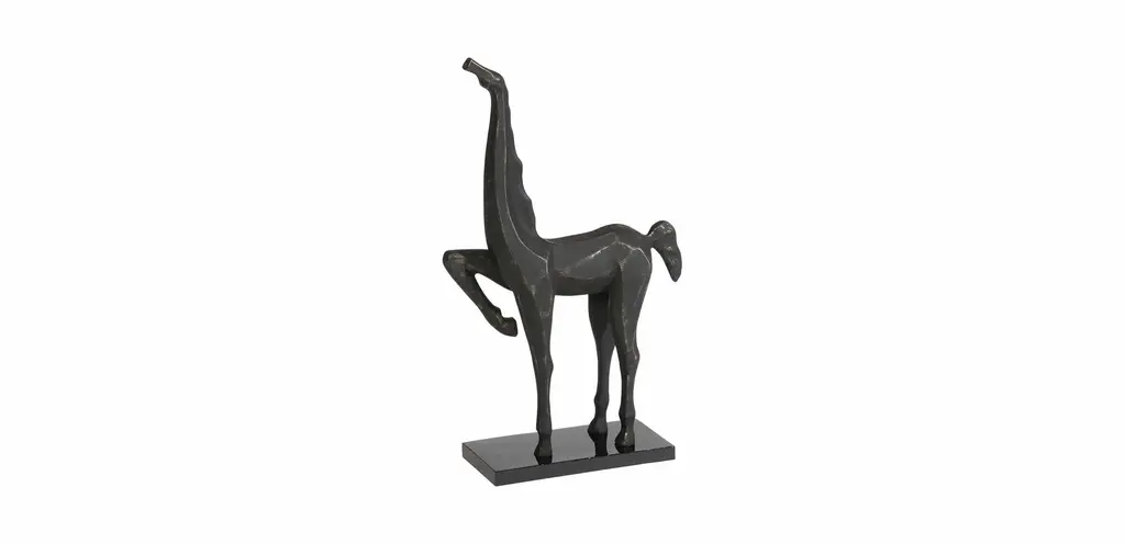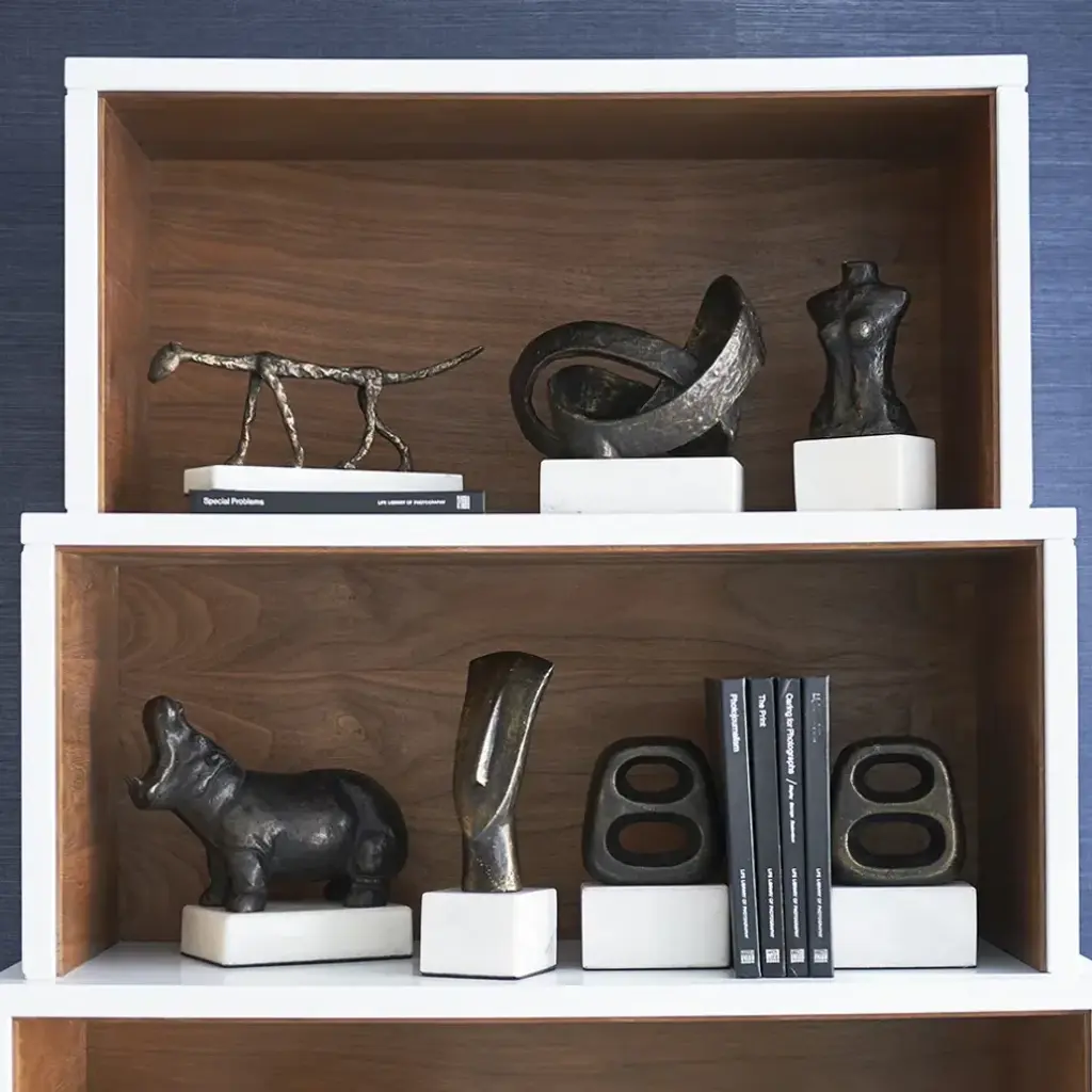 Finding its roots in art history, the Felix Statue is a surrealist study inspired by a 1951 sculpture by the iconic Alberto Giacometti, wherein he revisited a memory of his brother’s cat moving “just like a ray of light.” Villa & House’s artisans have captured that sly feline spirit in similarly fantastical fashion. Rendered in iron with a worked, textured bronze finish à la Giacometti, our Felix stands lithe and long on a sculptural base of white marble. The perfect ode to a beloved pet in a study, office, home library, or the like.