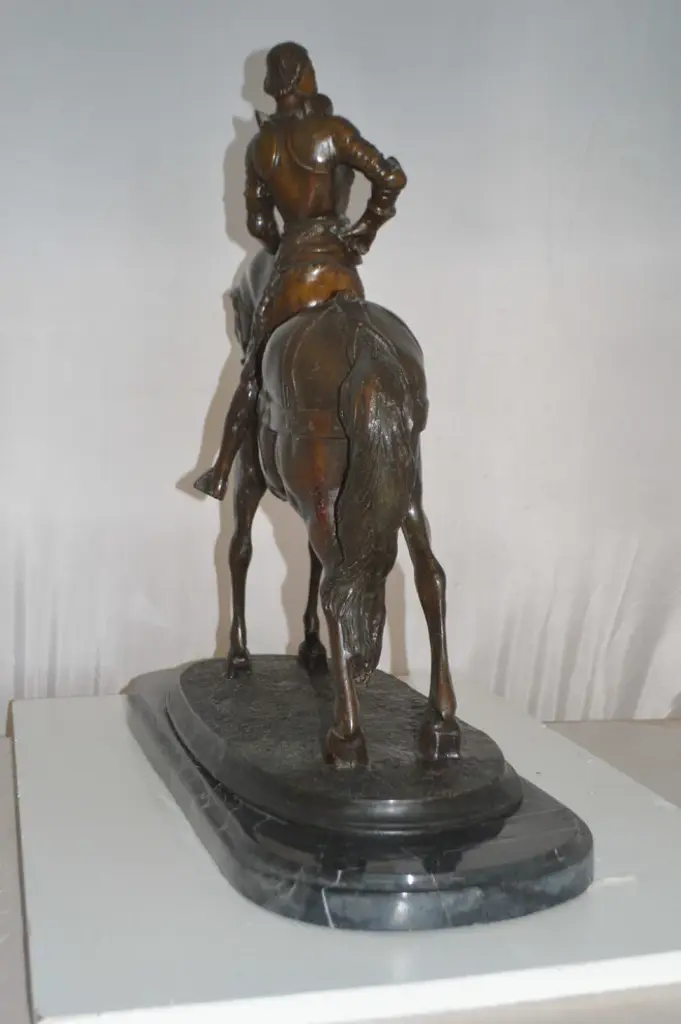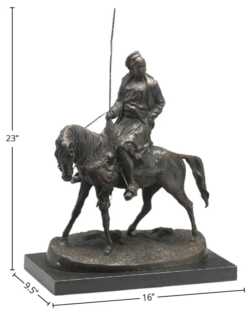 Trust the Ferguson African Herder on Horse Statue to complete your display cabinet. It is a bronze statue mounted on a marble base. Place this atop your desks, shelves, or a pedestal to highlight this piece. The statue features an African herder riding a horse exuding vintage beauty. This is perfect for people who are collecting decorative pieces of different designs.Features:• Overall product dimensions are 16" W x 9.5" D x 23" H• Bronze statue mounted on a marble base• Features an African herder on horseback for artistic visual appeal• Compact base fits seamlessly on desks or shelves• Low-maintenance and easy to cleanDimensions:Decorative Accent Piece• Assembled Product: 16 inches wide x 9.5 inches deep x 23 inches high.