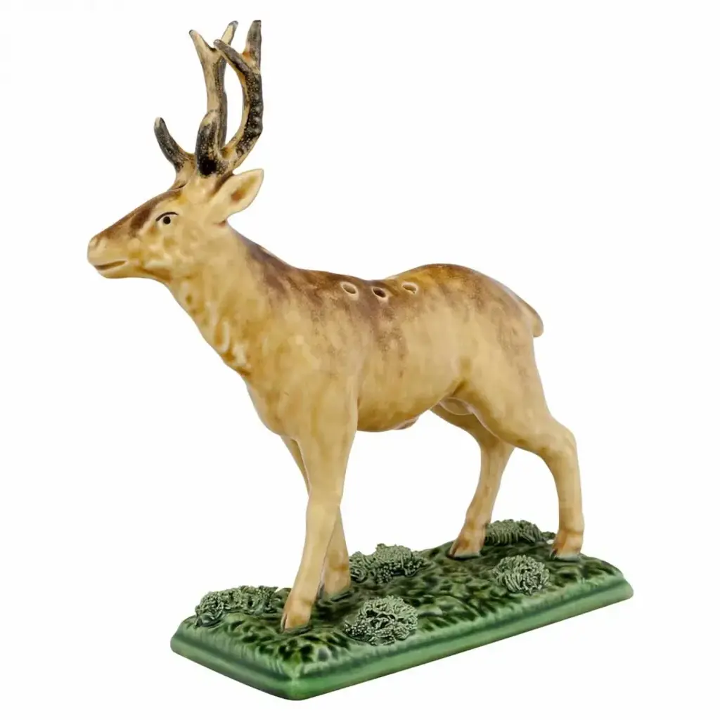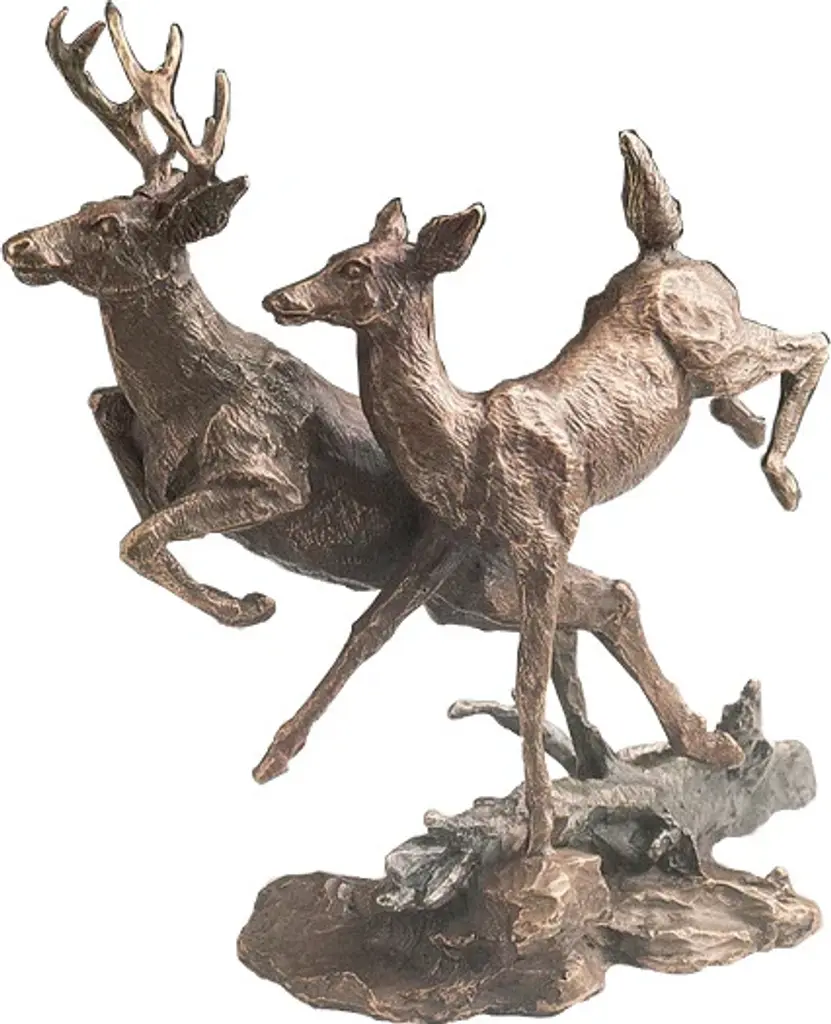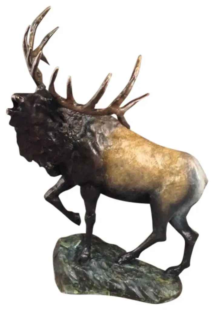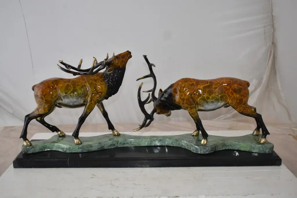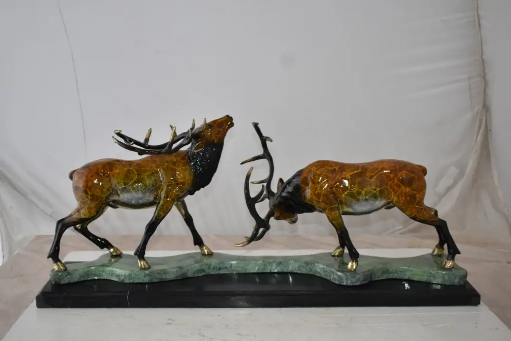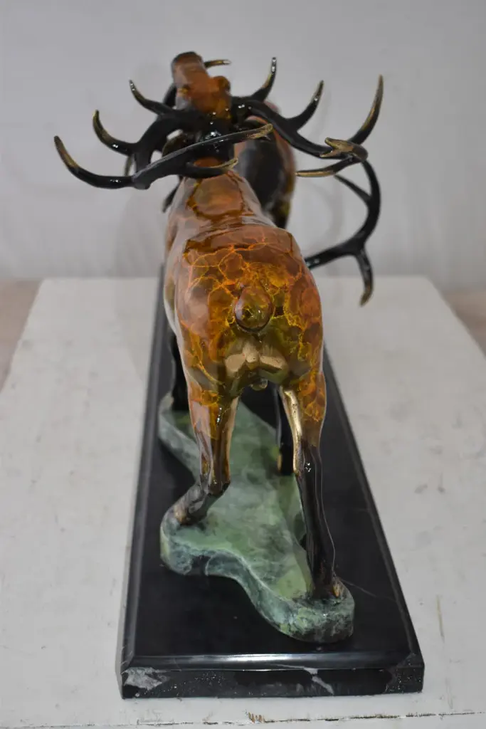 This tabletop bronze statue presents two fighting deers casted in the traditional lost-wax method. Any fan of this animal will recognize the beauty in these two deer. The statue displayed with bright colors through the use of enameling over bronze. This beautiful bronze sculpture is great for anybody who appreciates the natural world or these beautiful animals. Size: 32"L x 8"W x 14"H. Weight is: 43Lb