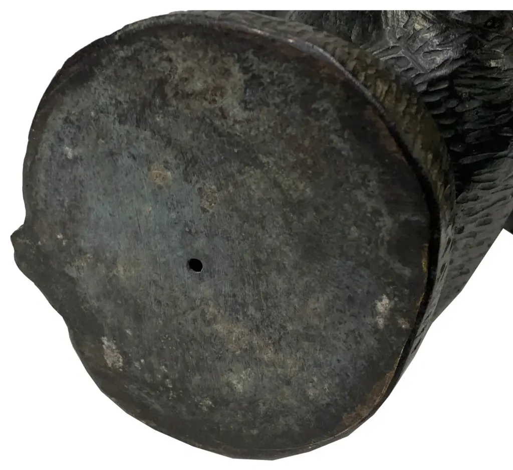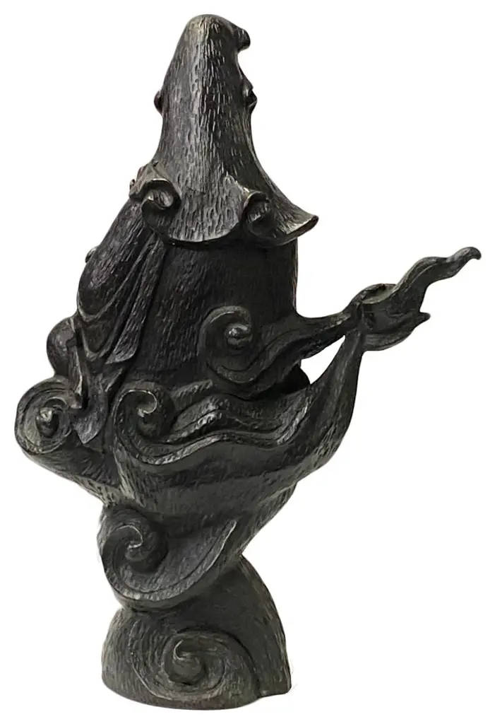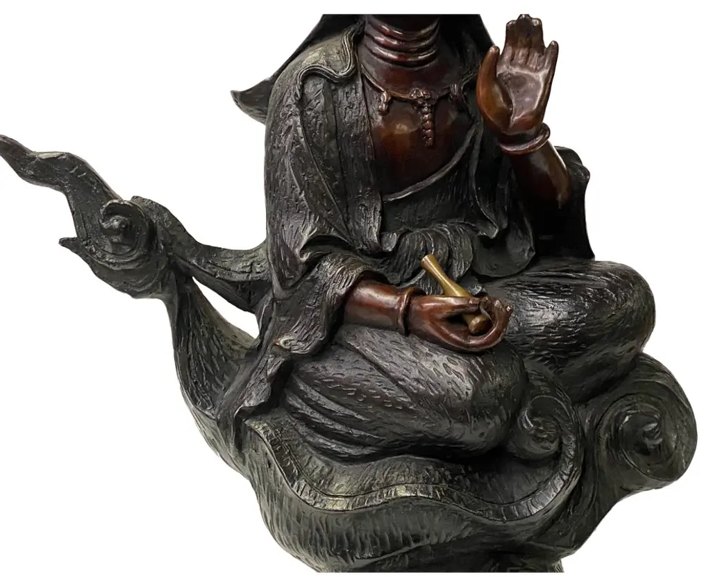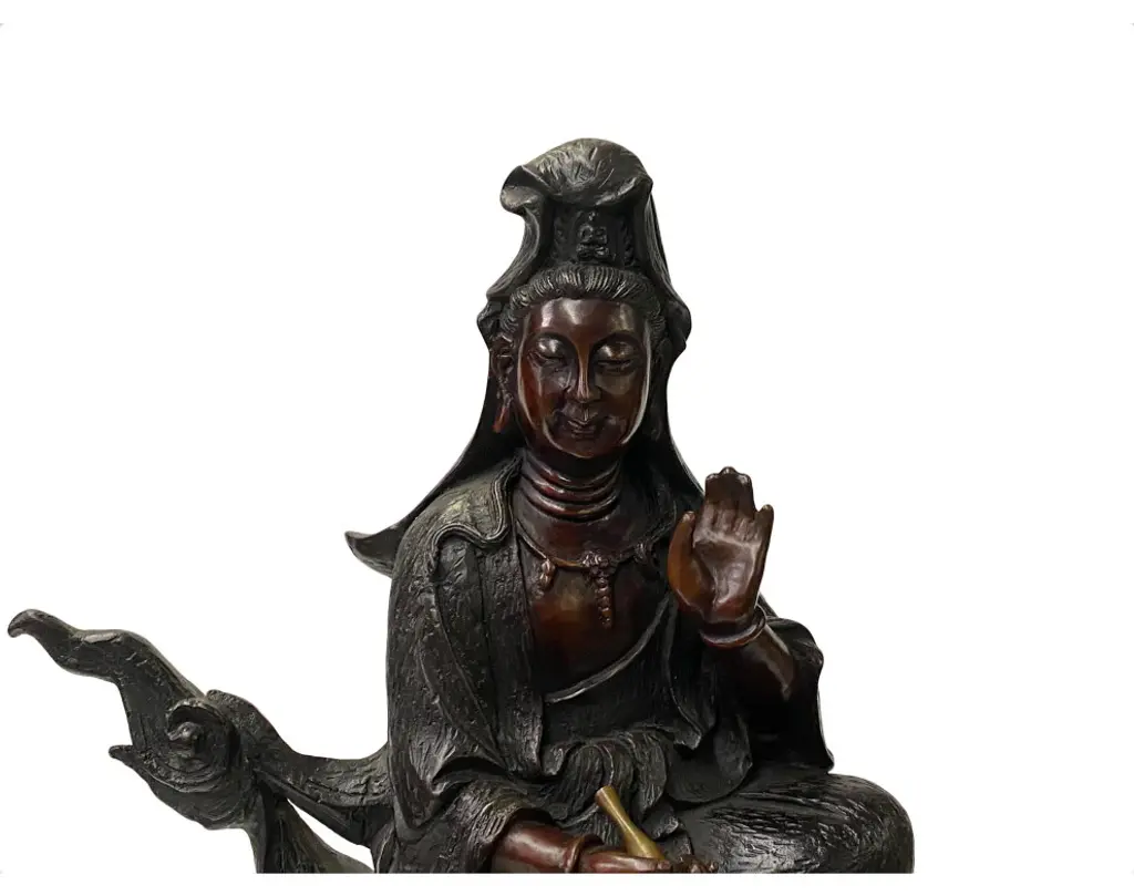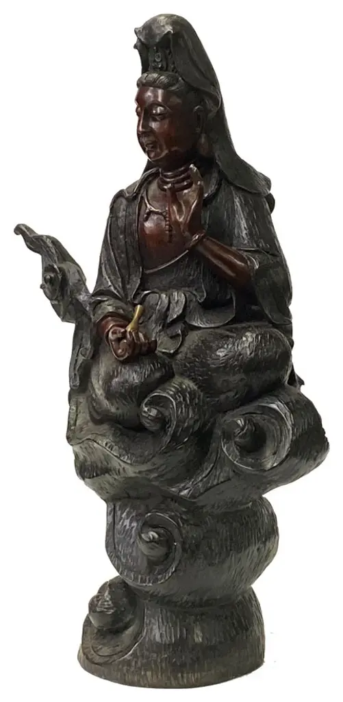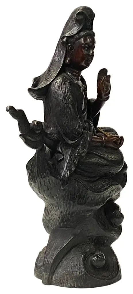 This is a nicely handmade bronze metal Kwan Yin Buddha Statue with charm bronze brown metal color and precise body details. It is in "water-moon" style posture - half cross leg seated over a cloud pattern base and holding a water bottle.Dimensions: w11"x d5" x h16"Origin: TaiwanMaterial: Metal, purple bronzeCondition: handmade, minor rust, minor rust at the bottom of the statue