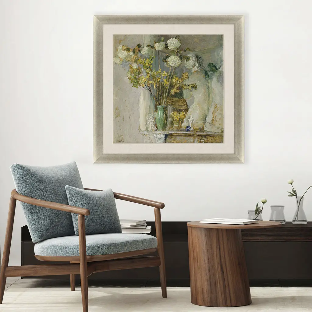 An inviting tablescape is anchored by hydrangeas and a classical sculpture. Featuring premium matting and framed in a champagne gold finish moulding.