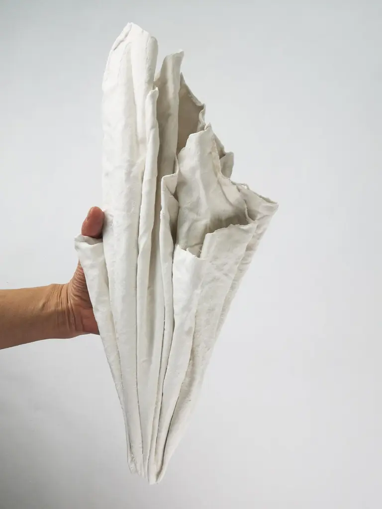 Fold III Sculpture by Dora StanczelOne of a Kind.Dimensions: D 14 x W 20 x H 60 cm.Materials: Porcelain and beton pedestal.I create bespoke and luxurious porcelain pieces with a careful aesthetic. Beyond the technical mastery of casting, what interests me is the unexpectedimperfection that occurs during the creative process. I like to make it a focal point of my pieces. For me, the intelligence of the hand lies in the collaboration with the material and not in its control.My pieces are the fruit of long experiments where technical processes arediverted. I obtain the harmony of forms by constantly seeking the limit of the material of the porcelain.I tear, fold, deform, glue, drip porcelain in a specific way that reveals the fragility and strength of the material. Indeed, a piece gains its strength through its final firing where the previously fragile material will finally be revealed. The beauty is in this transformation by the fire!My unique and stunning artworks are influenced by waves, curves and colors that I see when I go out on the ocean on my boat. This natural force and ecosystem essential to life is my source of inspiration.I consciously develop a vocabulary of forms based on the errors and theunexpected of this process. To obtain a unique piece, I divert the technicalprocess of porcelain.