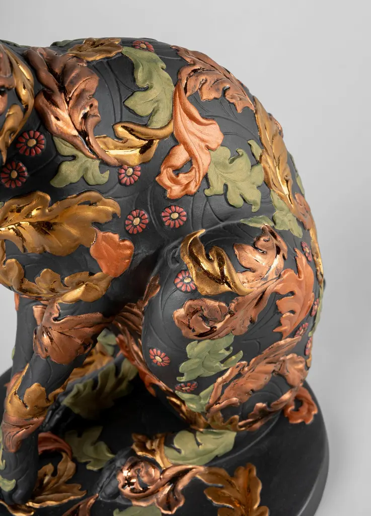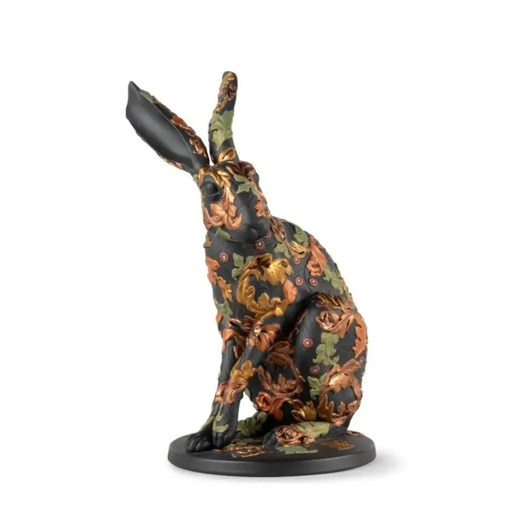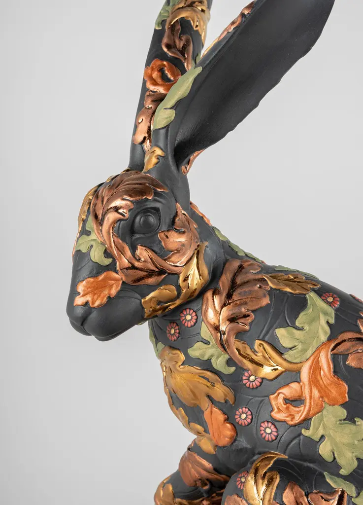 Porcelain sculpture depicting a hare, inspired by the plant motifs of the designer William Morris, one of the all-time masters of the decorative arts. This sculpture, made in matte black porcelain, depicts an exquisitely ornamented hare inspired by the famous patterns with motifs taken from nature that Morris, one of the key figures in the renewal of the decorative arts, applied in all his works. The piece is finished in matte black porcelain and decorated with Morris’s signature plant motifs, finished in green and metallic tones. William Morris was a multifaceted British artist, instrumental in the renewal of design and the decorative arts. The driving force behind the late-nineteenth century Art and Crafts movement in Great Britain, he was concerned with the recovery and advancement of craft methods as opposed to the burgeoning forms of mass production.