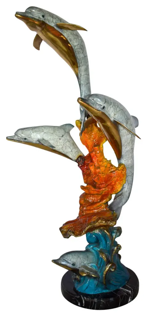 No lover of timeless sea lore and the mysteries of the deep can resist this incredibly detailed sculpture of four Dolphins jumping of the water. Handcrafted in cast brass and finished with colors deeper than the ocean itself, this breathtaking expression of the world beneath the waves beautifies any space and enhances any decor. Size: 18"L x 14"W x 41"H. Weight is: 57Lb