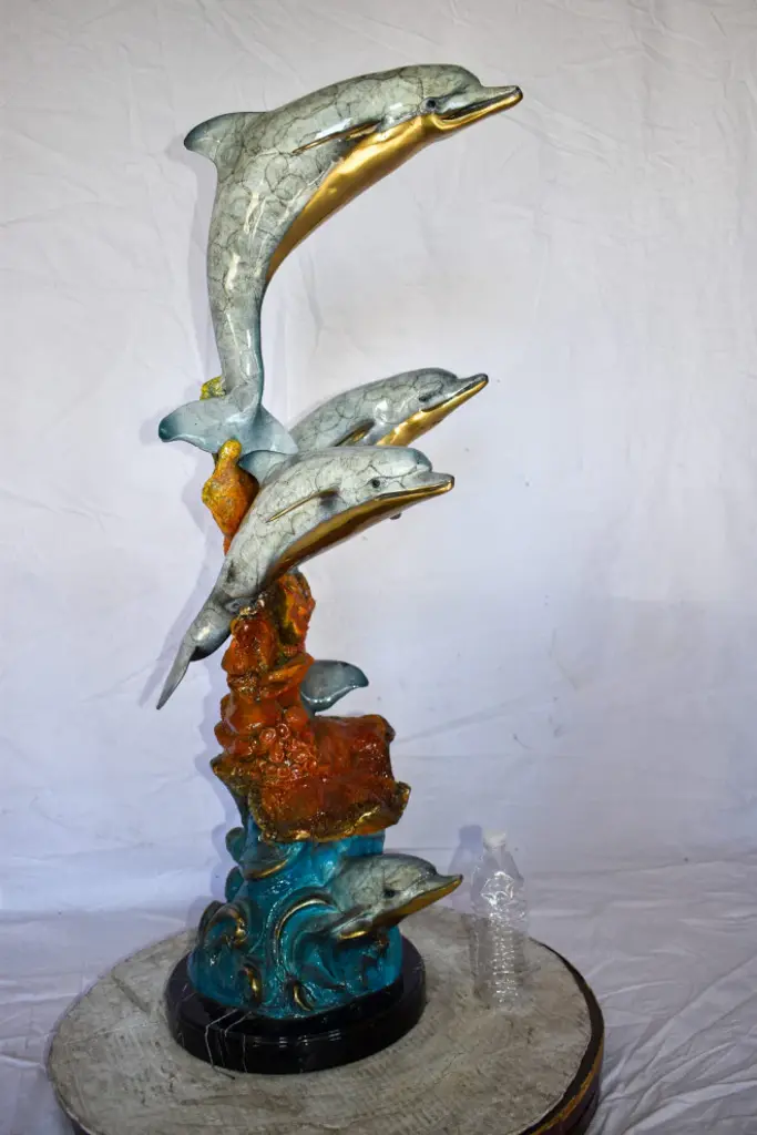 Four Dolphins Swimming In Ocean Colored Bronze Statue Size: 18" X 14" X 41"h