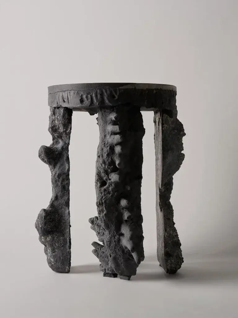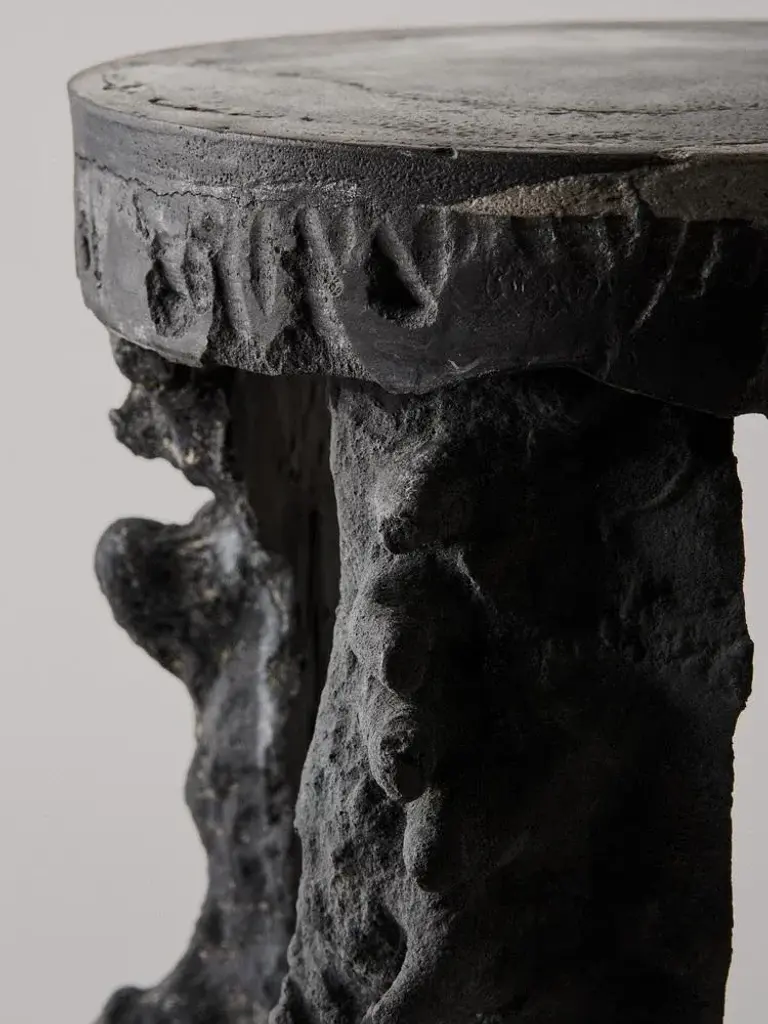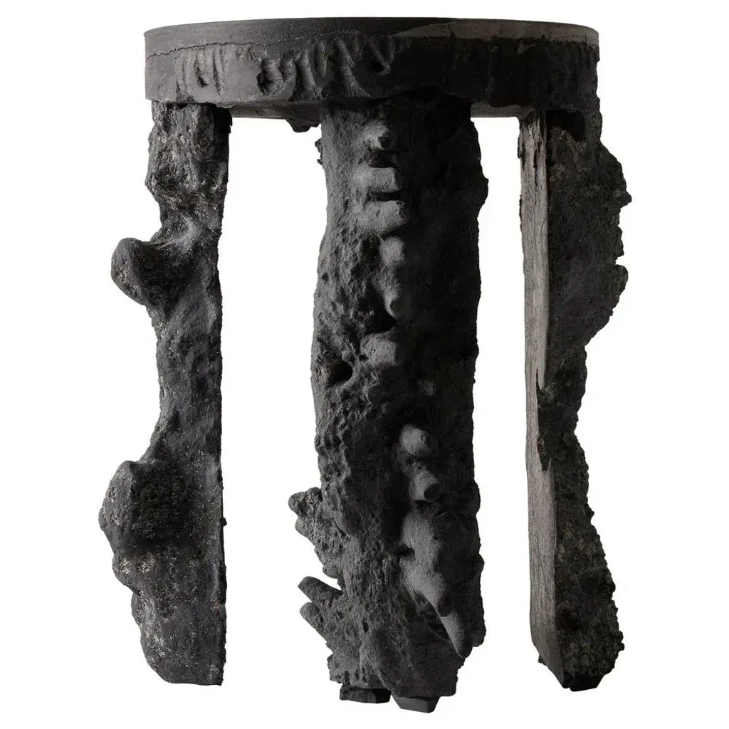 Four elements pedestal by Kajsa Melchior Fictive Erosion collection Dimensions: H approximate 45 cm Ø approximaye 35 cm Materials: Sculpted in sand by pressure from air, water and the human body Developed in crystal, colored by coal This piece is May be available separately in a light (beige) version Fictive Erosion consists of collections which all derives from a future scenario where human machines are forbidden due to environmental issues. The collections are speculative results of an ongoing investigation of how to adapt formation processes in nature into design methods. Geology is a great source of inspiration. The sculptures are made from sand that has been exposed to forces such as wind and water, but also from pressure created by the human body. Each sculpture is created in sand and developed with Alabaster. The method makes each shape unique and the sand that leaves the structure on the Alabaster creates its own, stone-like material. Kajsa Melchior is an independent designer and sculptor based in Stockholm. Her work has a design critical approach and investigates in the borderlands between furniture and sculpture, facts and fiction. The work are explorations of how concepts such as developing and erosion can form the basis of spatial and material investigations, and challenges aesthetic standards as they are created through sand, compressed air and bodily imprints.