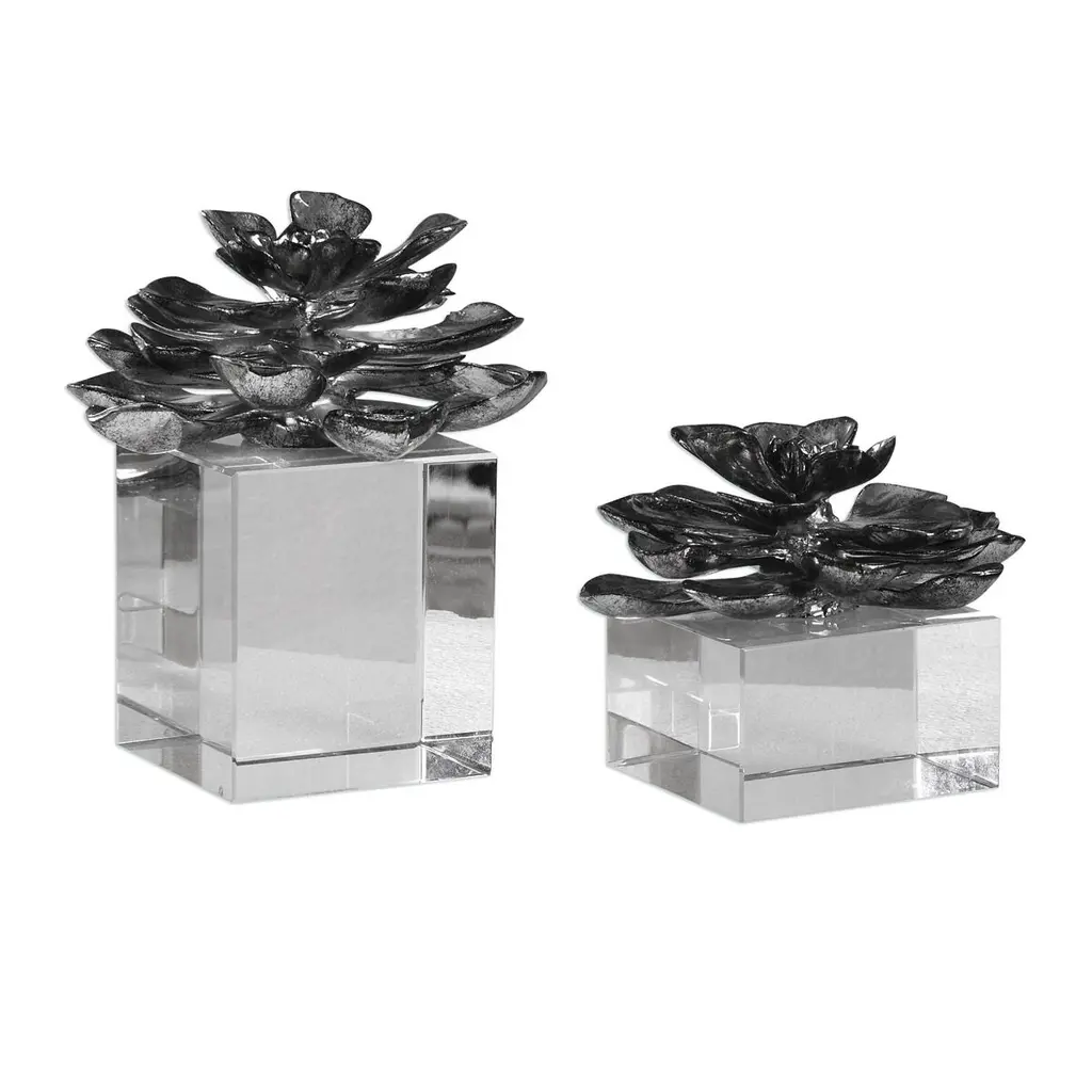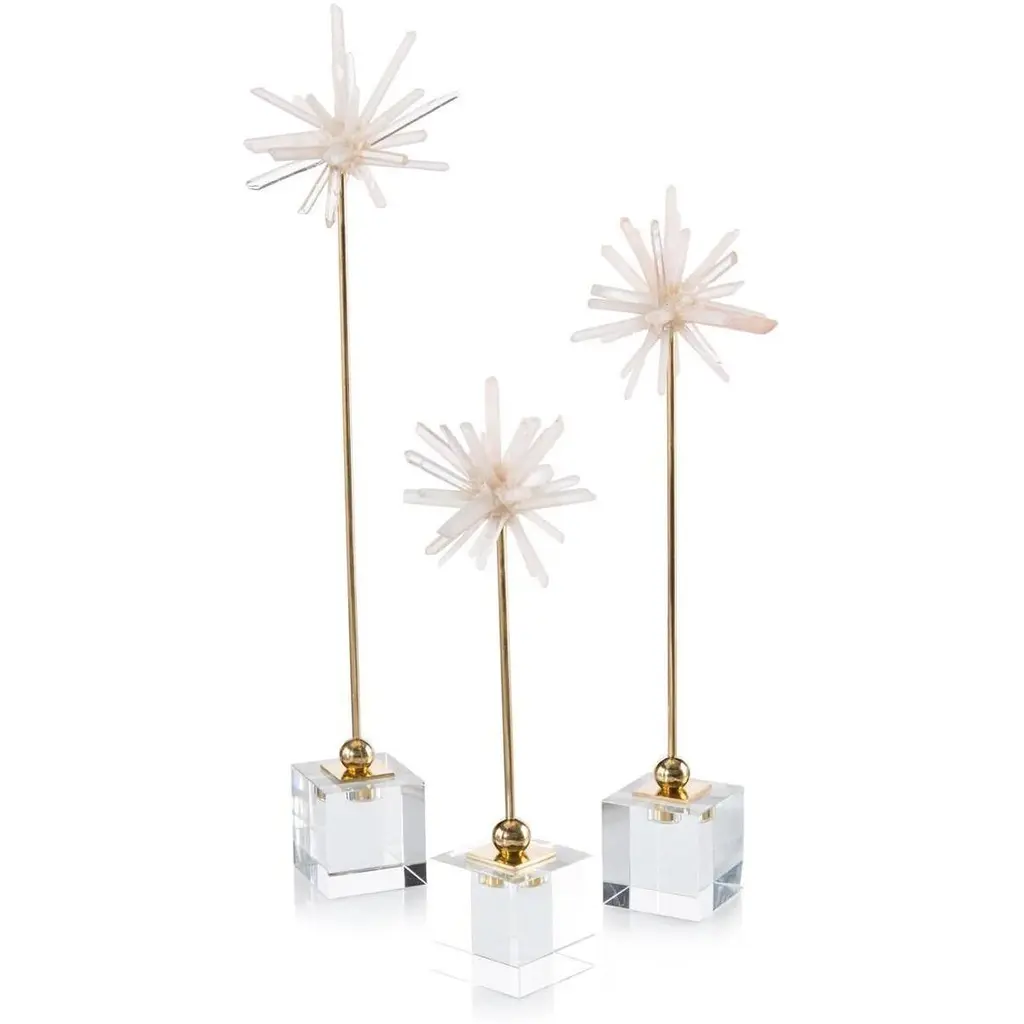 The Fractured Expression Sculptures are stunning, dimensional tabletop accents that create an alluring focal point. Crafted from composite, the sculptures depict human faces in an abstract shape with a beaded look. Both sculptures are supported by a metal rod in a Brass finish mounted atop a square crystal base.