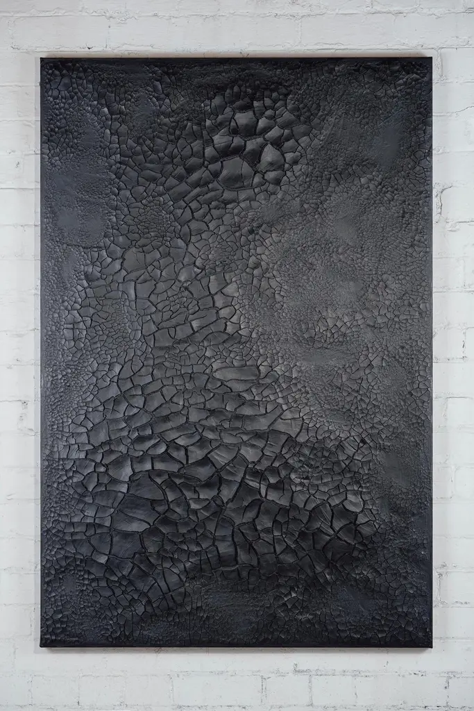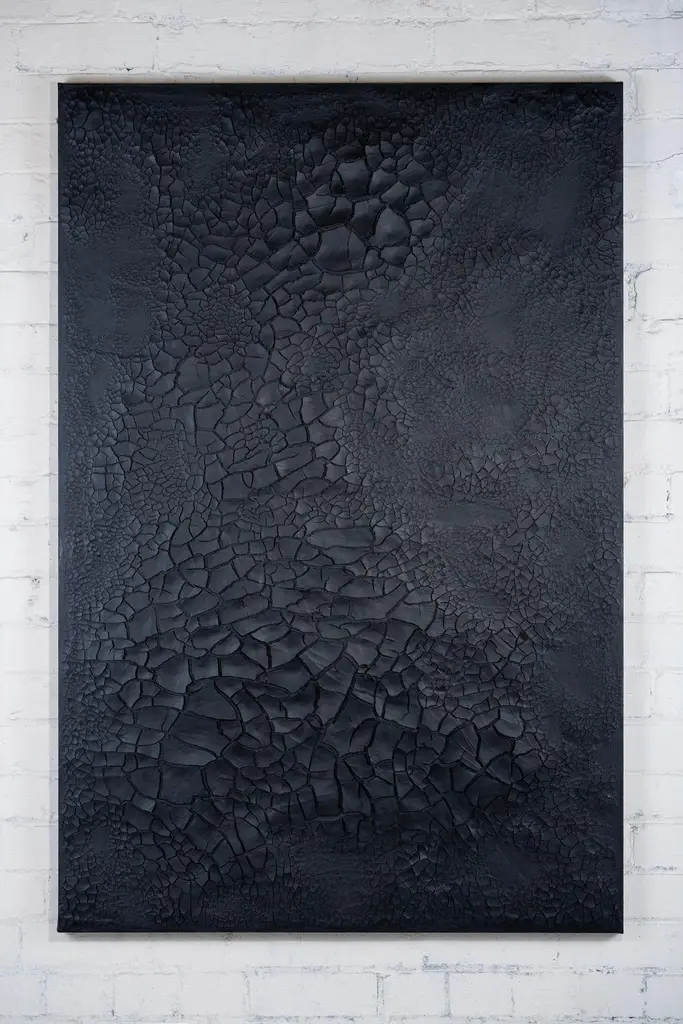 Fratturato Nero 5 Painting Wall Sculpture by Kris Lamba StudioDimensions: W 100 x D 10 x H 150 cmMaterials: Porcelain and pigments on linen.Weight: 7 Kg.Kris Lamba was born in London in 1984. He creates large and small-scale sculpture, paintings and edition based collectible design. Eschewing tradition media, he works with a variety of industrial biopolymers which Lamba manipulates whilst still molten, often at extreme temperatures. Using a combination of great force, gravity and a pioneering technique of polymer-stretching, he creates otherworldly forms; shapes that defy convention and echo the spontaneous and often violent moments of interstellar creation. Aiming to partly remove the element of ‘self’ Lamba adjusts only certain parameters: temperature, quantity, molecular weight and the applied force. Then, using custom designed machinery he pulls apart the molten material, selectively freezing and re-heating where necessary; the resulting shapes seemingly grown rather than made. After a period of consideration, the forms are refined and re-worked over a period of weeks and are either cast in bronze using the traditional ‘lost-wax’ method, or are finished in precious metals, pigment rich paints and composite resin fabrics.Creating work is an energetic process for Lamba, his pieces becoming expressions of a singularity; ideas forged though intense experimentation, later undergoing gradual stages of refinement and craftsmanship. Originally a trained classical percussionist Lamba then went on to study contemporary design. His stretched and manipulated sculptures can be seen as a rebellion against the confines of working within tradition; their spontaneous forms defying and reworking traditional artistic practice. His recent series of raw pigment sculptures go further to reinforce this point, warping the very space that they occupy. Lamba’s work has been published worldwide to widespread critical acclaim and is held in several prominent collections. He currently lives and works near Brighton, UK.