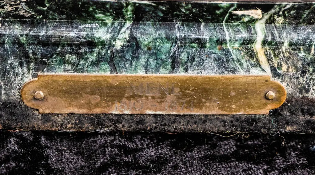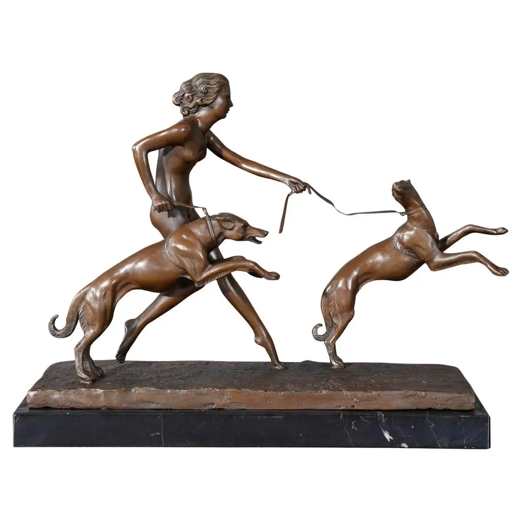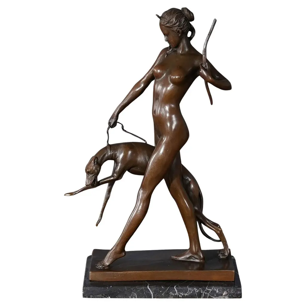 French 19th century bronze statue of a dog, whippet bread, signed P. J. Mene, mounted on a thick oval marble base with plaque reading, Mene - 1810 - 1874. Pierre Jules Mene, or P. J. Mene, as he usually signed his sculptures, was known to make human figures, as well as many different animals, making him popular with hunters. The whippet is a delicate, slim animal, making figures of whippets difficult to make. While Mene made many figures of whippets, in various positions, these figures became rare and costly over the years. The one we have here is represented happily trotting along in the grass.