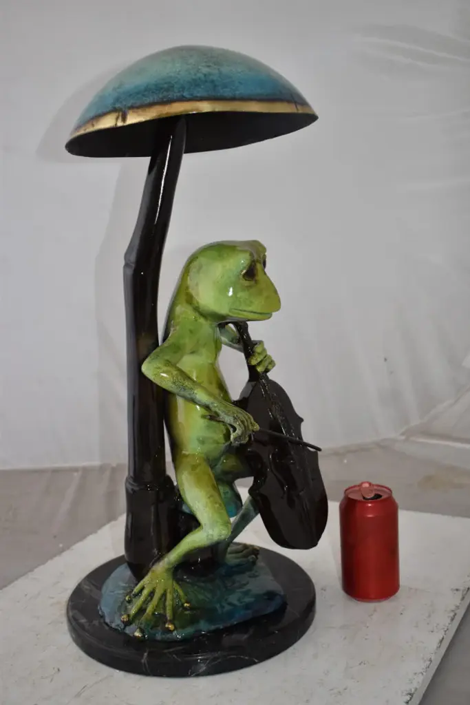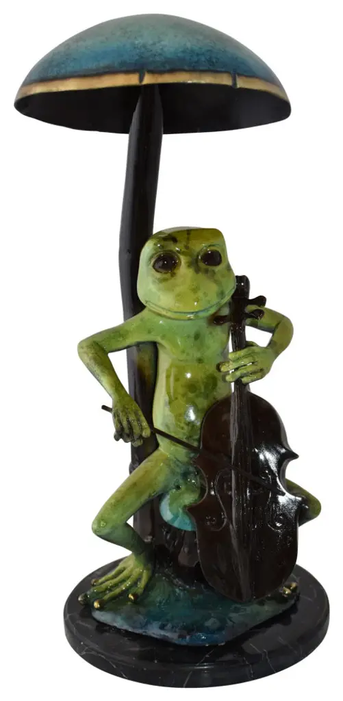 Bring some enthusiasm to any space with this bronze statue of a frog playing a cello. With colors such as bright green and turquoise, it is not only humorous and fun but also tasteful and full of artistic talent. It is a must have piece for any art lover. Size: 12"L x 11"W x 24"H. Weight is: 27Lb
