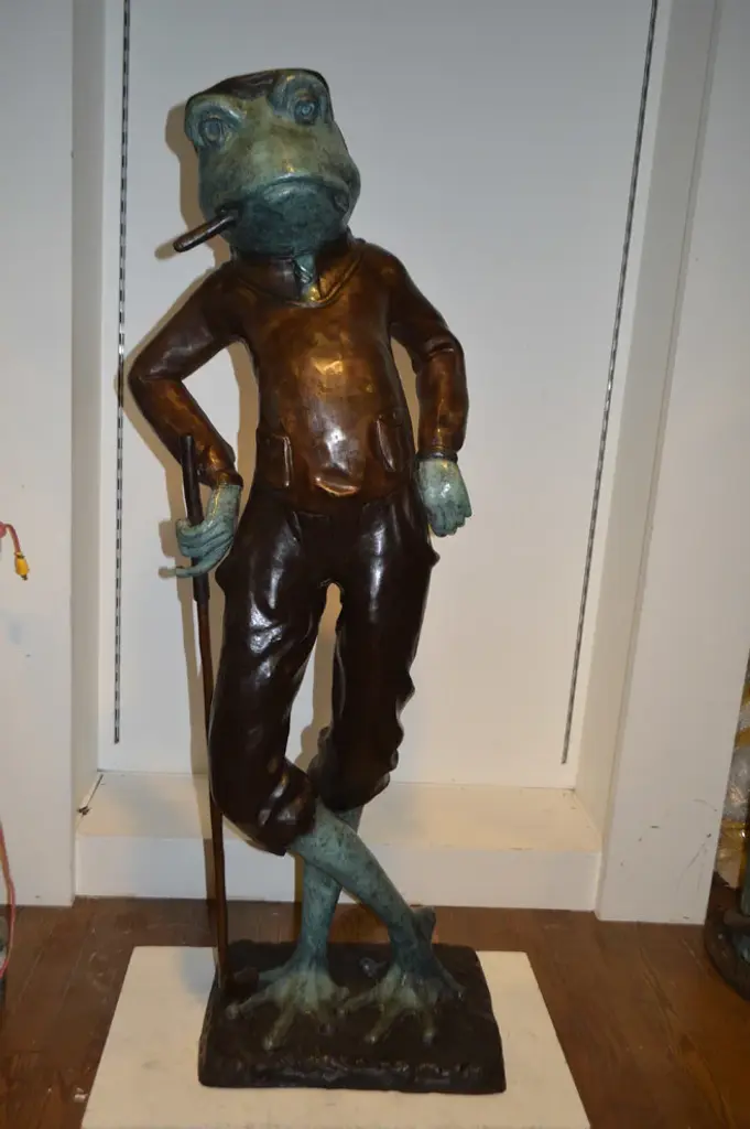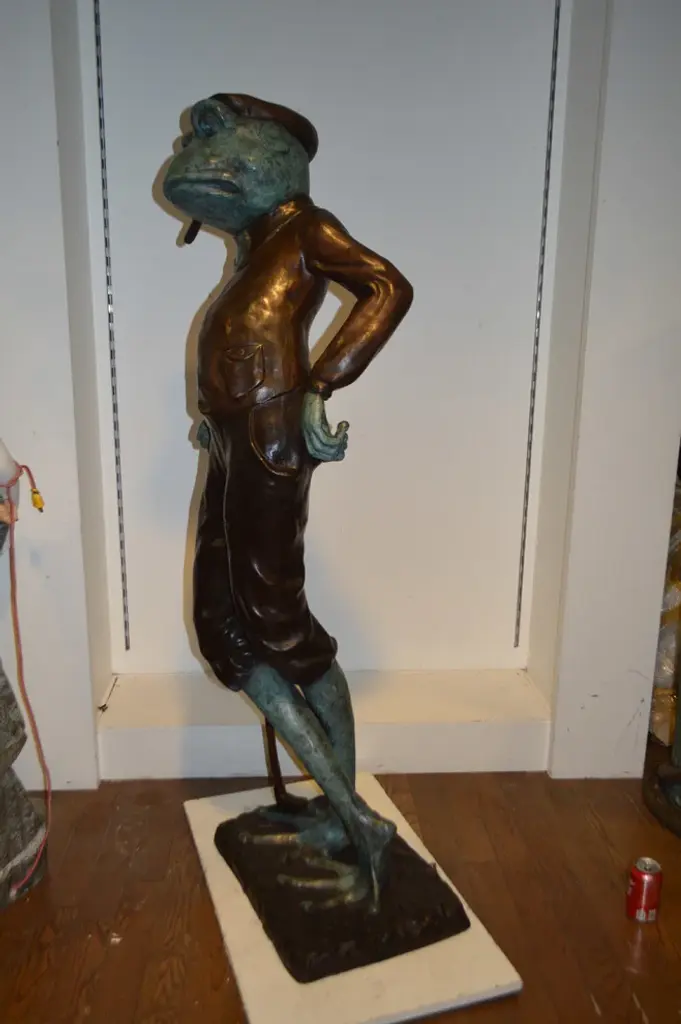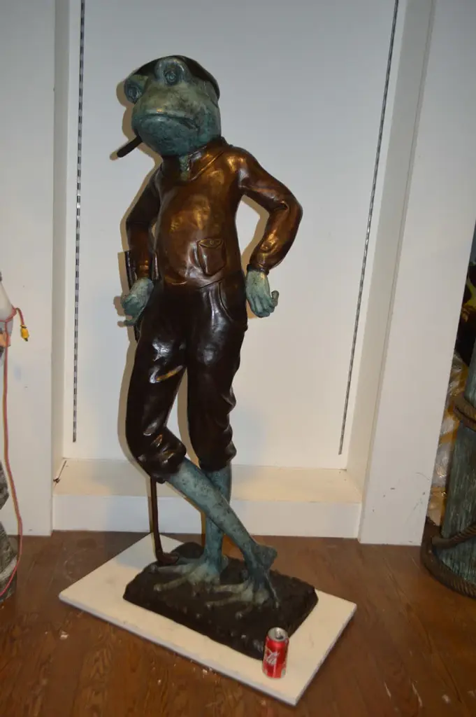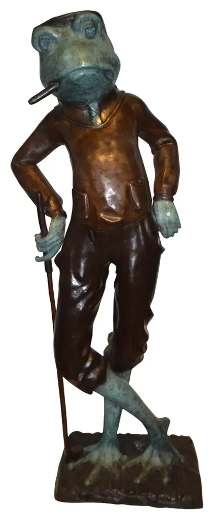 When you see this comical, piped bronze statue of a large frog smoking cigar while playing golf, it might just make you chuckle! This whimsical sculpture will evoke gleeful responses from all who see it. This is a great piece of bronze work that details how intricate this type of art can be. The slightest strands are strong and capable of conveying great jollity. This is a beautiful bronze statue stained in green and brown patina finish for preservation. This bronze statue is museum quality and hand-cast in high-quality pure bronze using the Lost Wax Process of bronze casting. Size: 24"L x 15"W x 64"H. Weight is: 142Lb