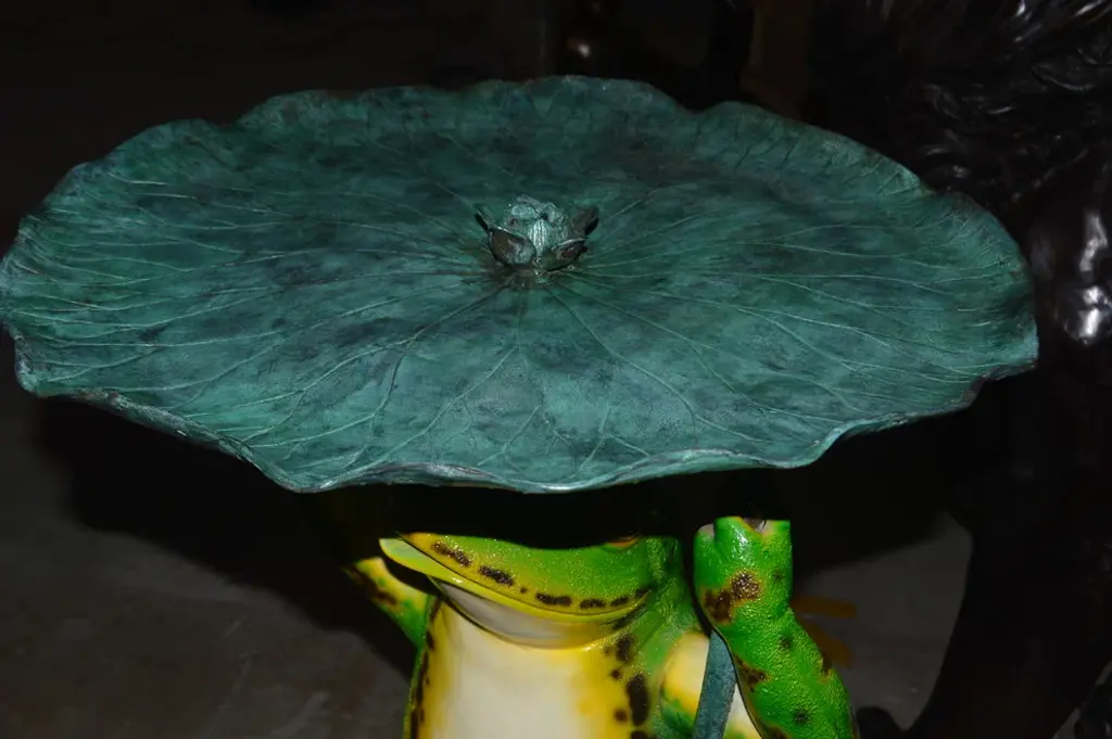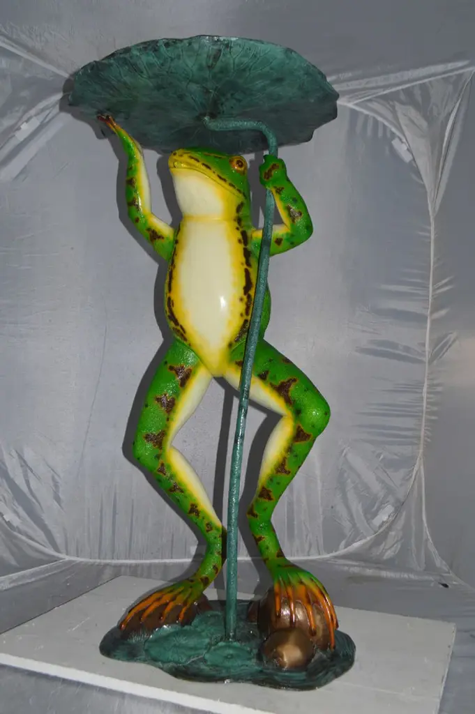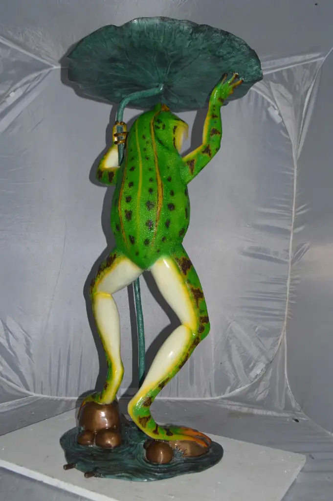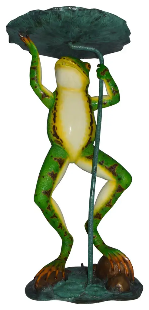 When you see this comical, piped bronze, frog statue seemingly "singing in the rain", it might just make you chuckle! This whimsical sculpture will evoke gleeful responses from all who see it. A human like frog tries to avoid getting wet by hiding under his large leaf. The statue is equipped with a hose that leads water to the top of the leaf and spills down all around the frog, with the use of a fountain pump (pump is not included). This jumbo grumpy frog will charm all visitors to his pond, and will be an endless source of amusement. Size: 22"L x 22"W x 43"H. Weight is: 60Lb