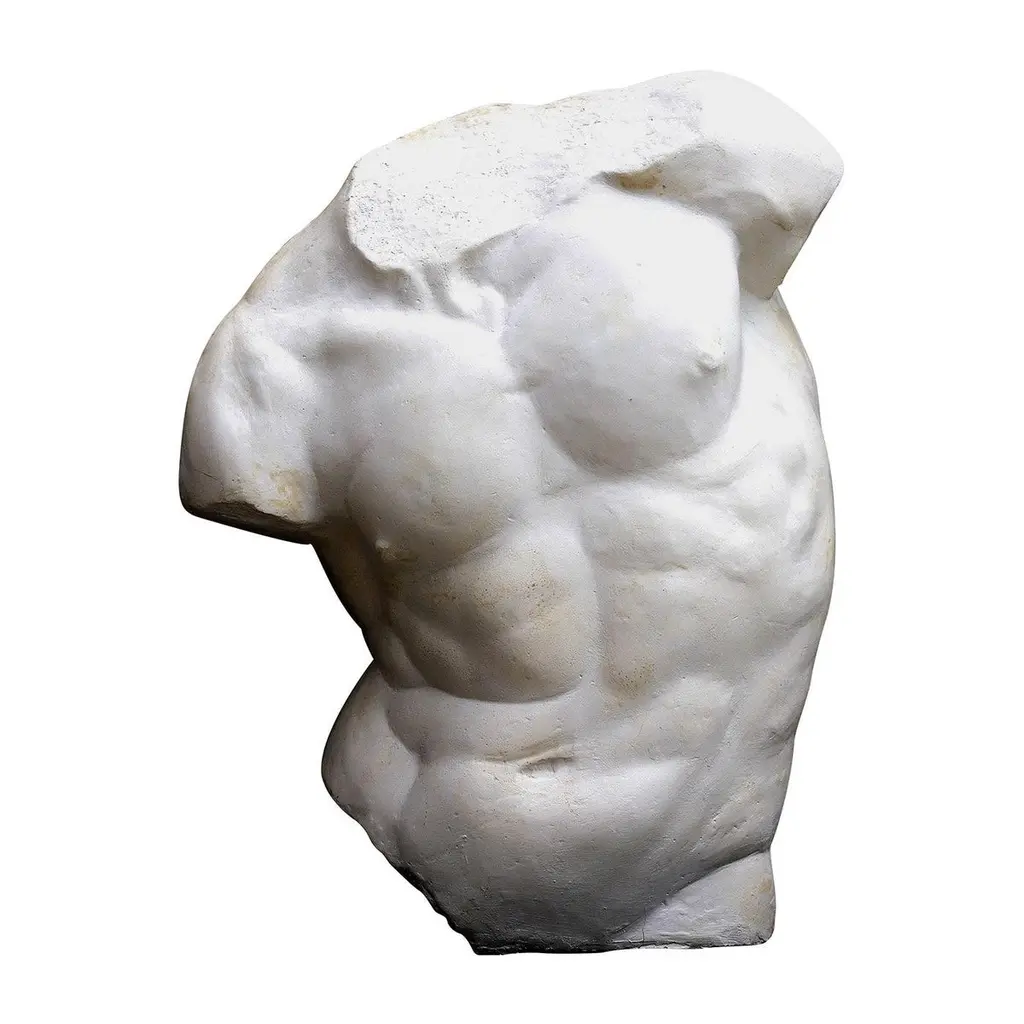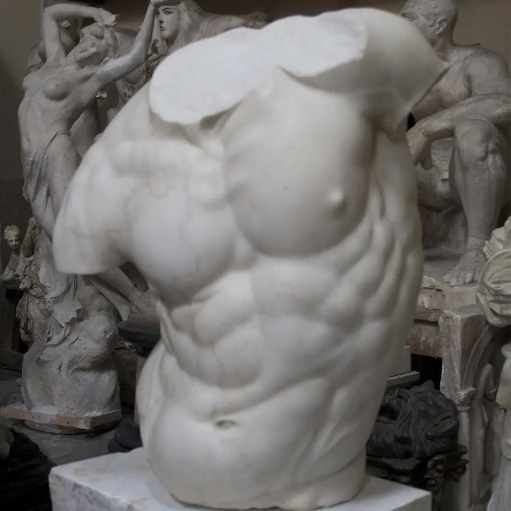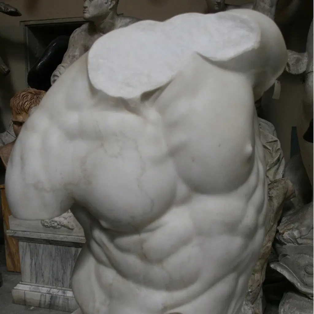 A sculpture in precious white Carrara marble reproducing the Torso Gaddi, the famous fragmentary sculpture displayed in the Uffizi Museums in Florence, which inspired many great artists of the Renaissance, including Michelangelo. Just like in the Renaissance, the piece is hand-carved from a Carrara marble block by skilled artists lead by Raffaello Romanelli in his Galleria in Florence. The Torso Gaddi has enjoyed a centuries-long success thanks to its emphasis on the study of anatomy and muscles, expressed in the peculiar pose called "contrapposto".