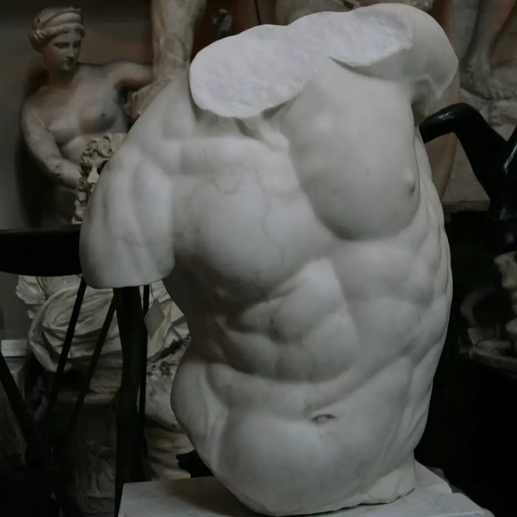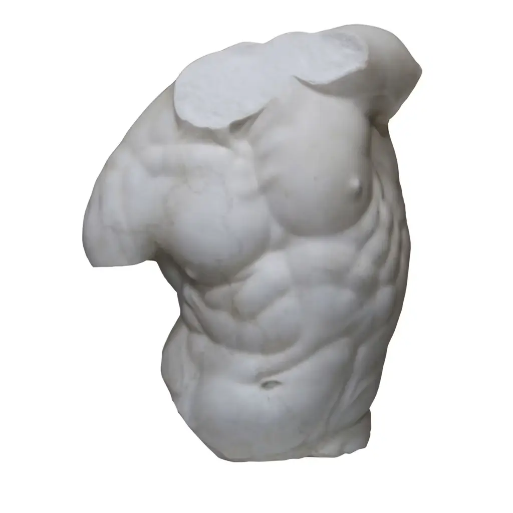 A sculpture in precious white Carrara marble reproducing the Torso Gaddi, the famous fragmentary sculpture displayed in the Uffizi Museums in Florence, which inspired many great artists of the Renaissance, including Michelangelo. Just like in the Renaissance, the piece is hand-carved from a Carrara marble block by skilled artists lead by Raffaello Romanelli in his Galleria in Florence. The Torso Gaddi has enjoyed a centuries-long success thanks to its emphasis on the study of anatomy and muscles, expressed in the peculiar pose called "contrapposto".